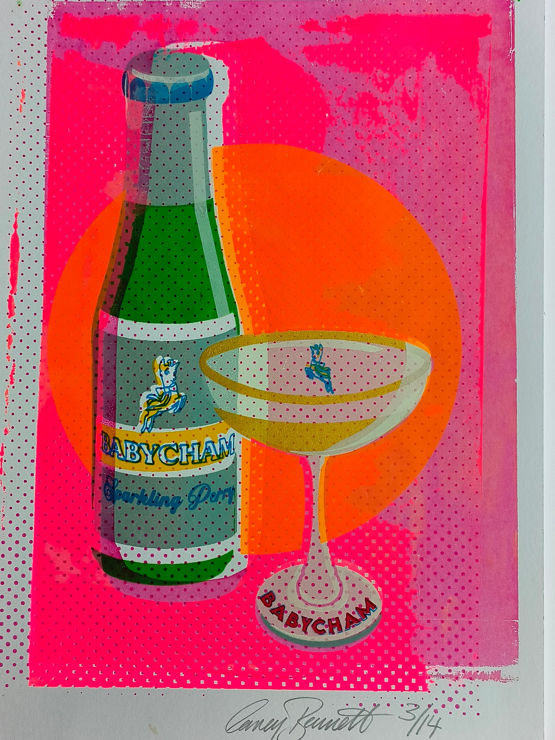 These multi layered screen prints capture the essence of nostalgia depicting a retro Babycham bottle and glass. The vibrant colours, gold overlays and halftones evoke a sense of celebration and luxury. The quirky offset typography and deliberate misalignment adds a playful touch, evoking cherished memories of secretly being given glasses of it by Grandparents at Christmas. Recalling happy times of small glasses and retro drinks cabinets.