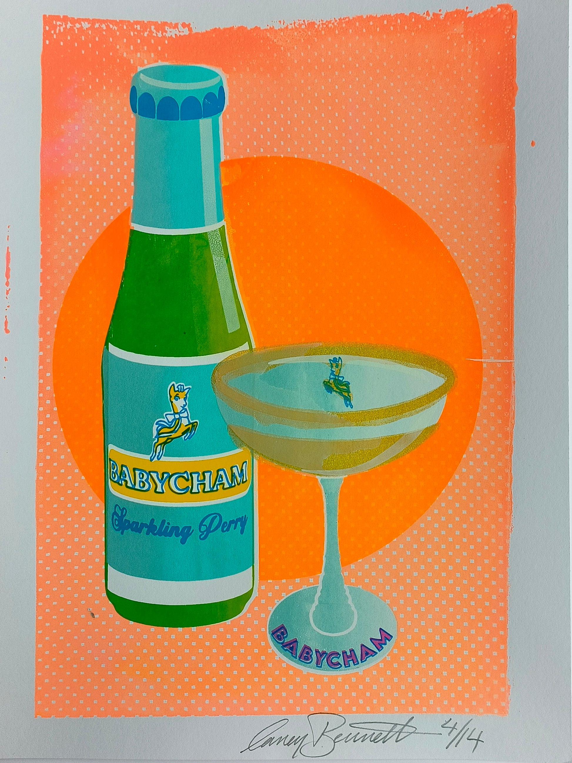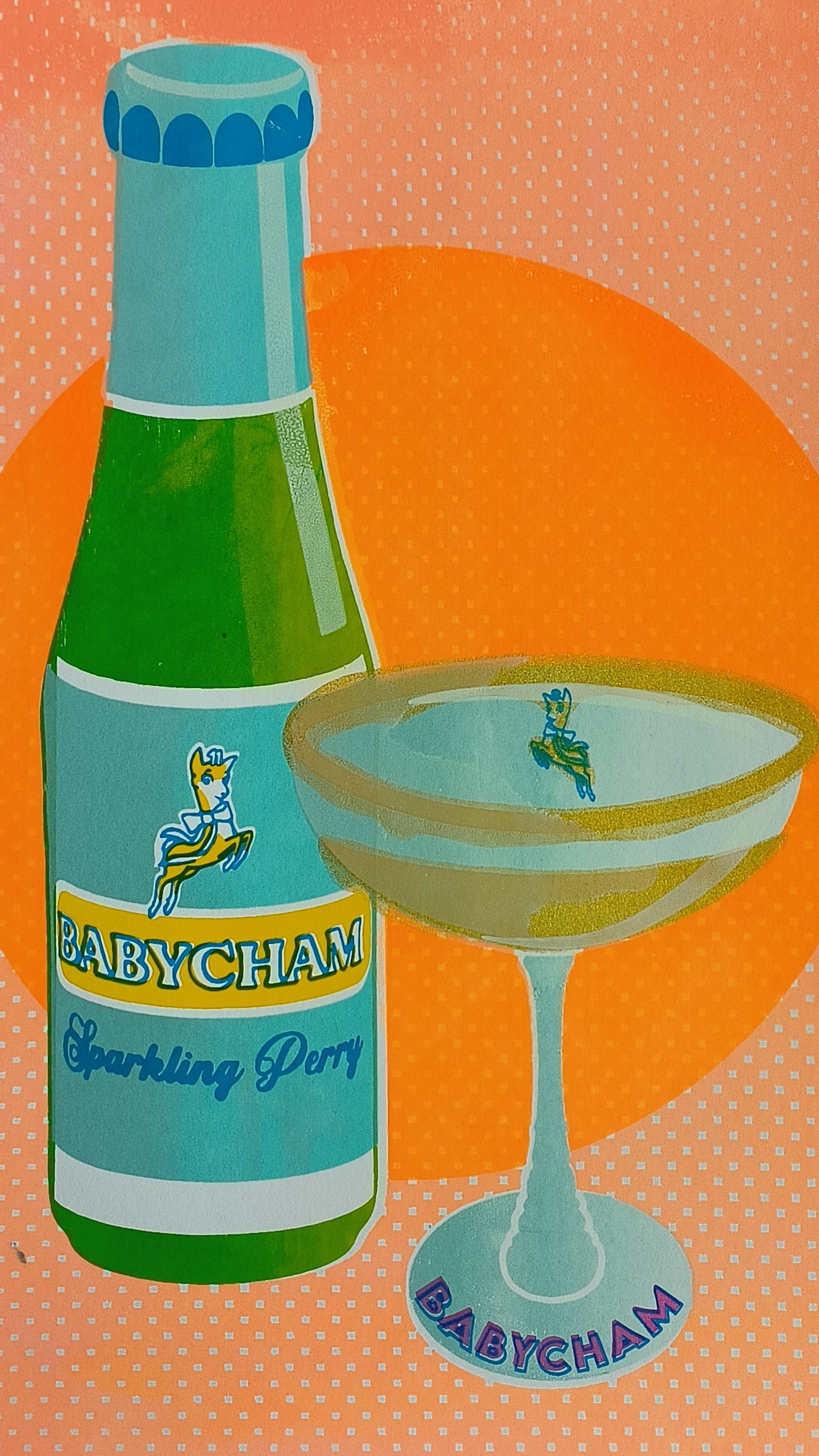 These multi layered screen prints capture the essence of nostalgia depicting a retro Babycham bottle and glass. The vibrant colours, gold overlays and halftones evoke a sense of celebration and luxury. The quirky offset typography and deliberate misalignment adds a playful touch, evoking cherished memories of secretly being given glasses of it by Grandparents at Christmas. Recalling happy times of small glasses and retro drinks cabinets.