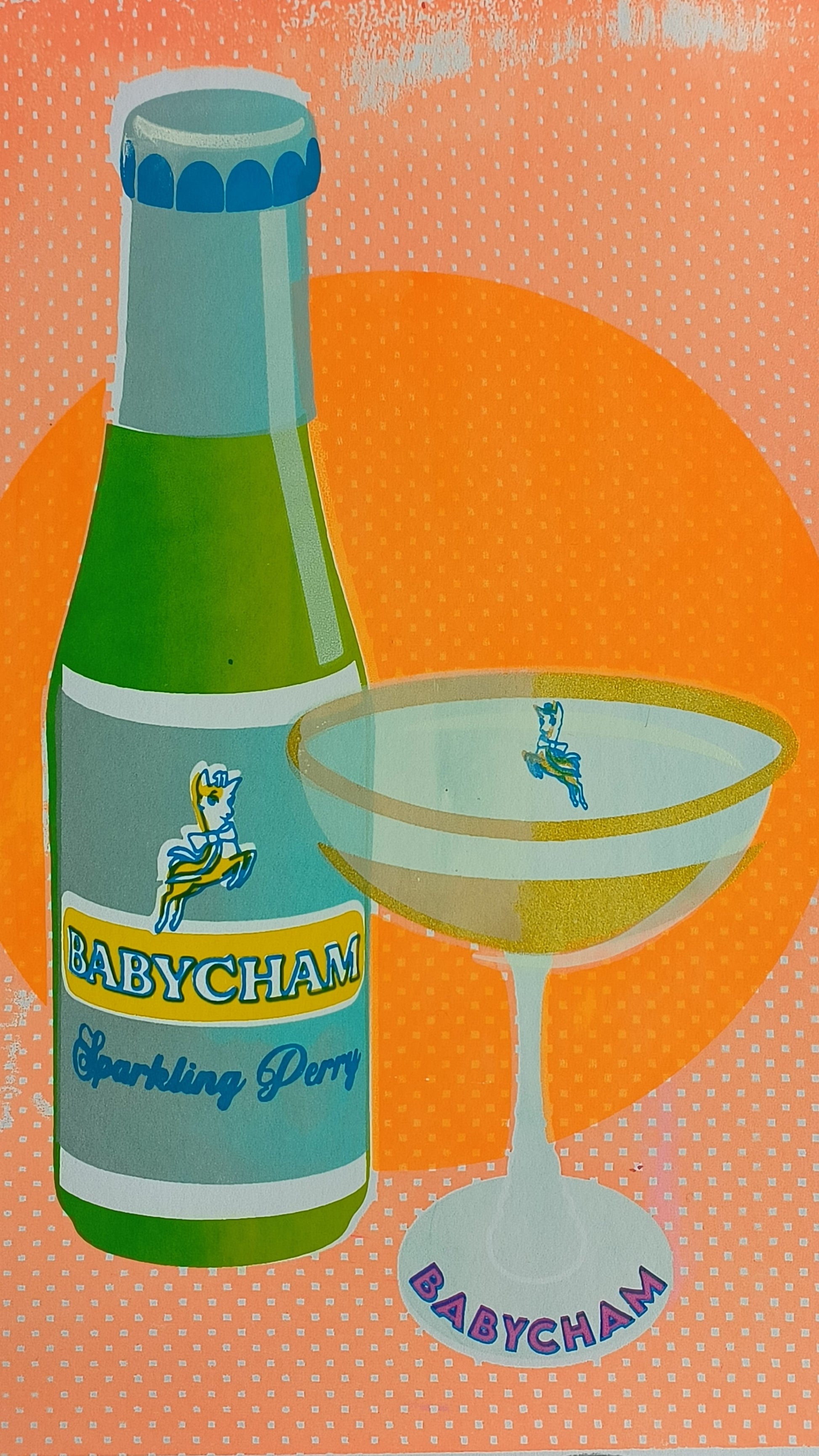 These multi layered screen prints capture the essence of nostalgia depicting a retro Babycham bottle and glass. The vibrant colours, gold overlays and halftones evoke a sense of celebration and luxury. The quirky offset typography and deliberate misalignment adds a playful touch, evoking cherished memories of secretly being given glasses of it by Grandparents at Christmas. Recalling happy times of small glasses and retro drinks cabinets.