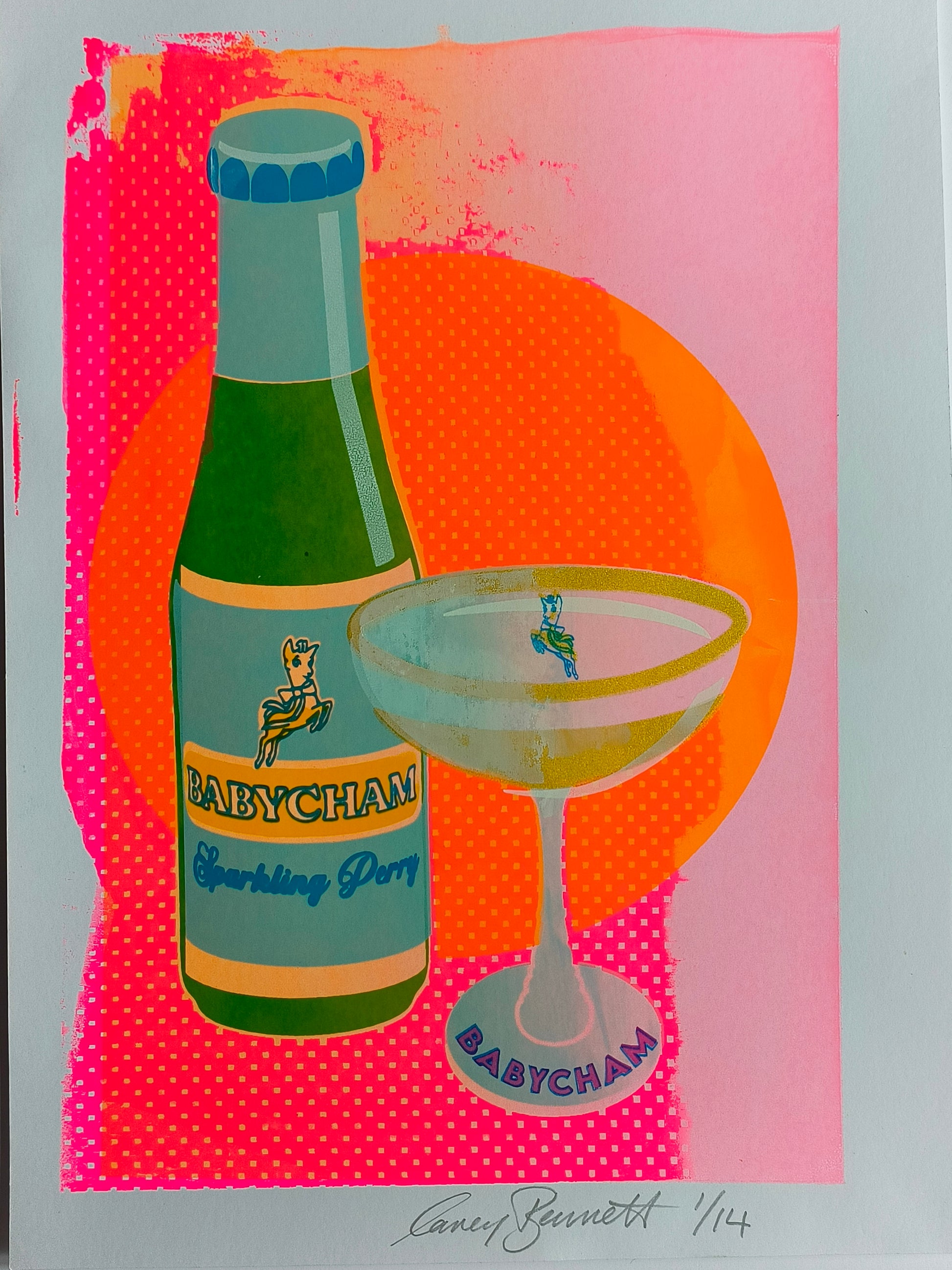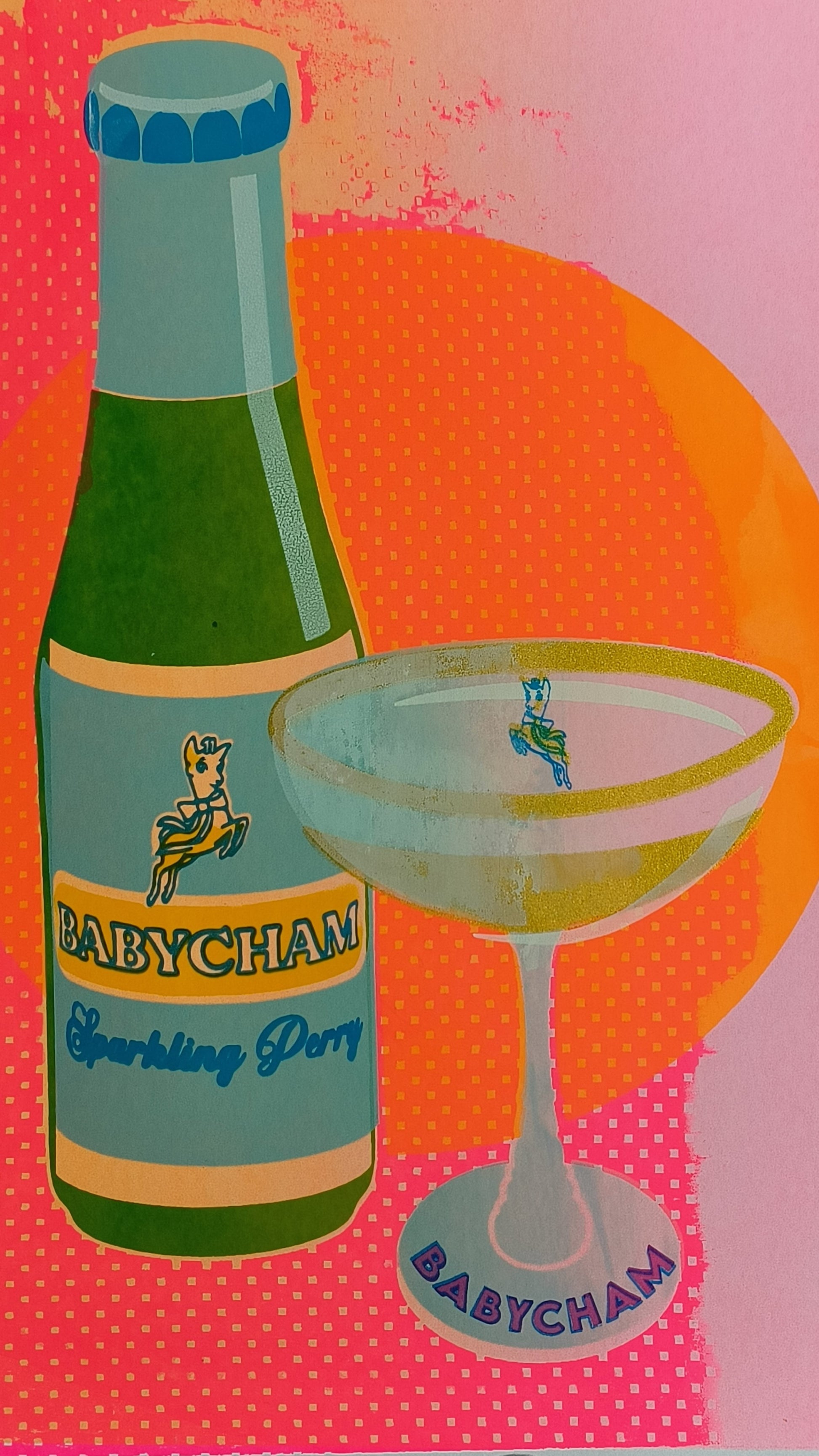 These multi layered screen prints capture the essence of nostalgia depicting a retro Babycham bottle and glass. The vibrant colours, gold overlays and halftones evoke a sense of celebration and luxury. The quirky offset typography and deliberate misalignment adds a playful touch, evoking cherished memories of secretly being given glasses of it by Grandparents at Christmas. Recalling happy times of small glasses and retro drinks cabinets.