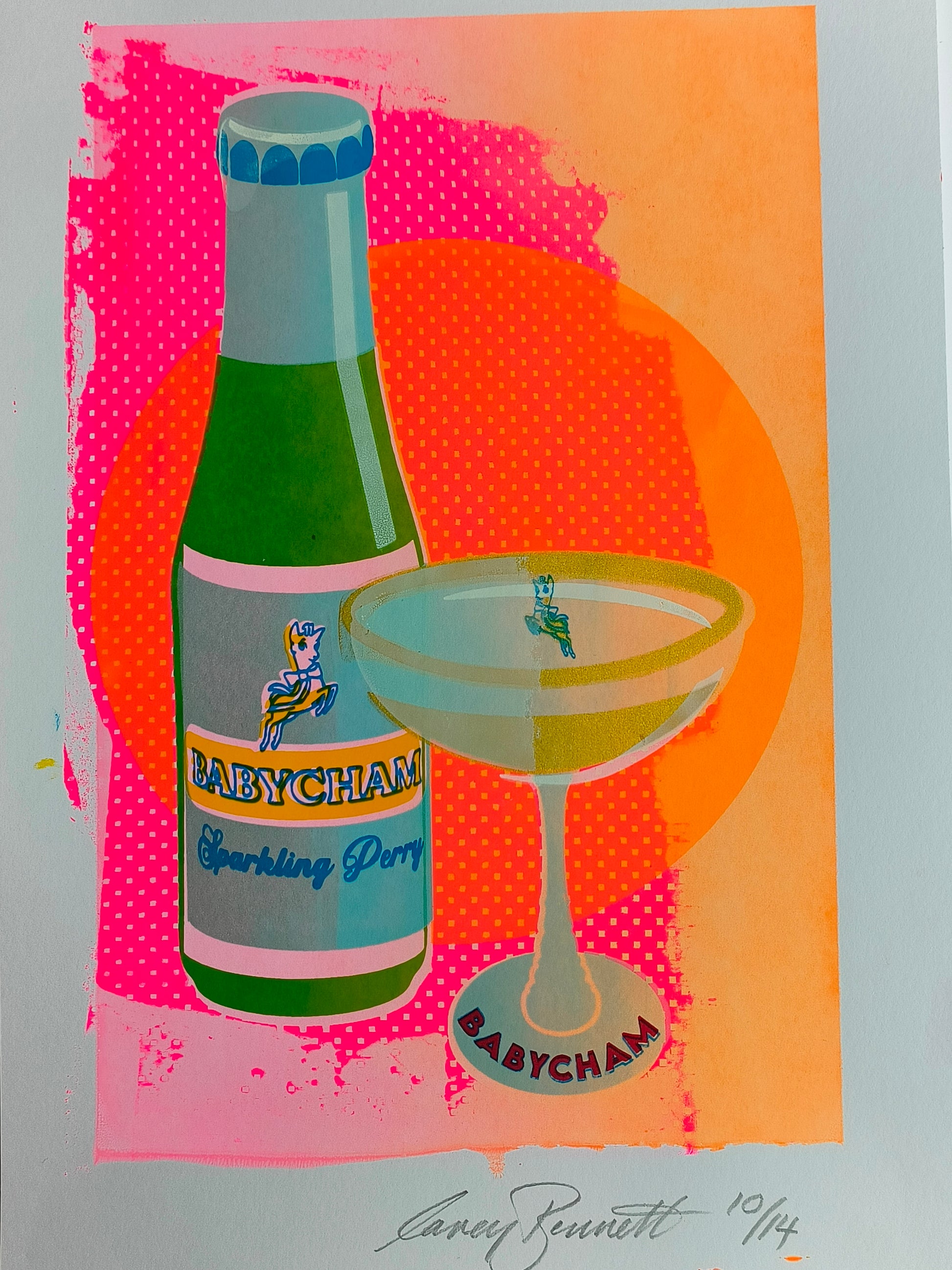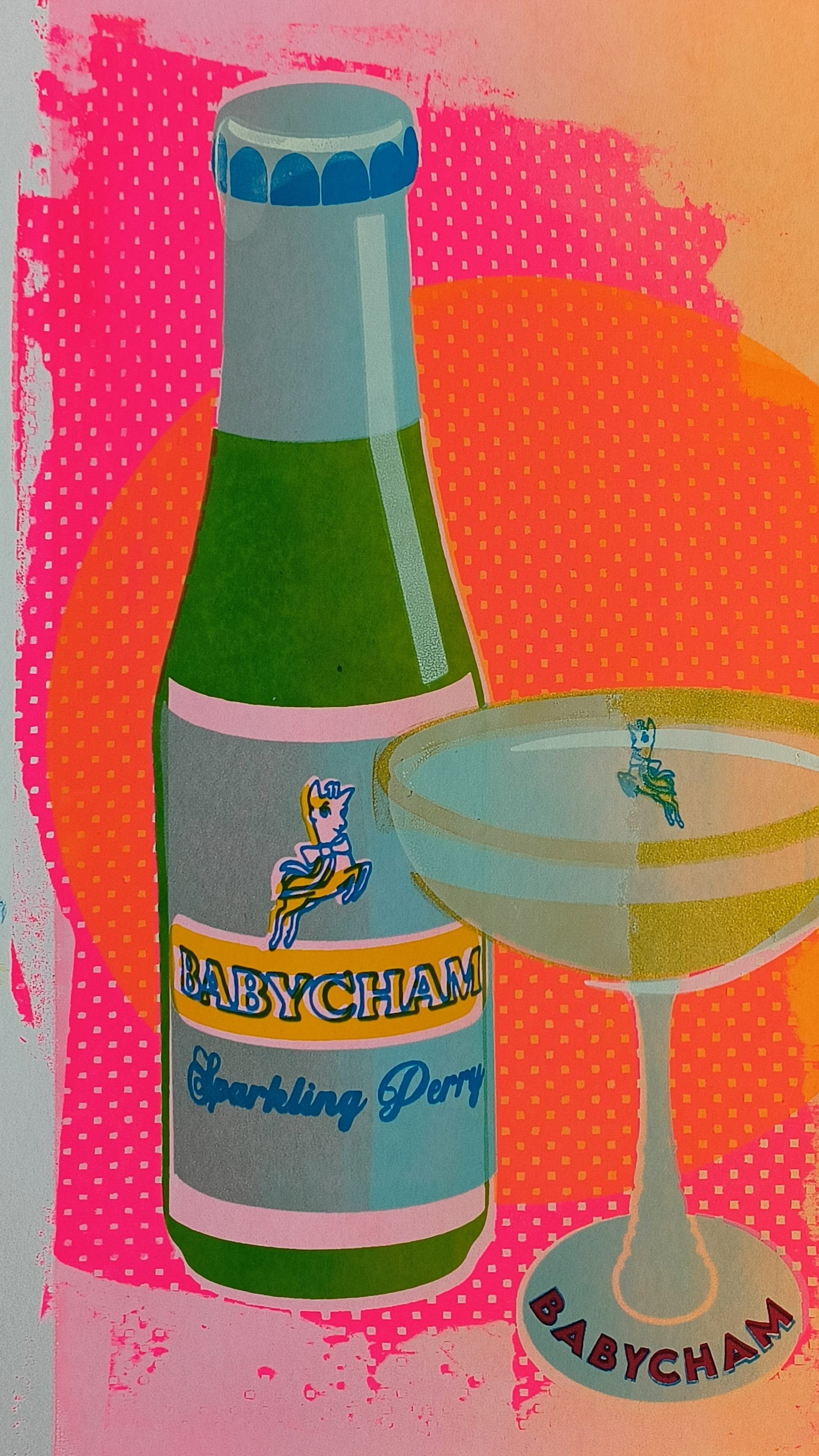 These multi layered screen prints capture the essence of nostalgia depicting a retro Babycham bottle and glass. The vibrant colours, gold overlays and halftones evoke a sense of celebration and luxury. The quirky offset typography and deliberate misalignment adds a playful touch, evoking cherished memories of secretly being given glasses of it by Grandparents at Christmas. Recalling happy times of small glasses and retro drinks cabinets.