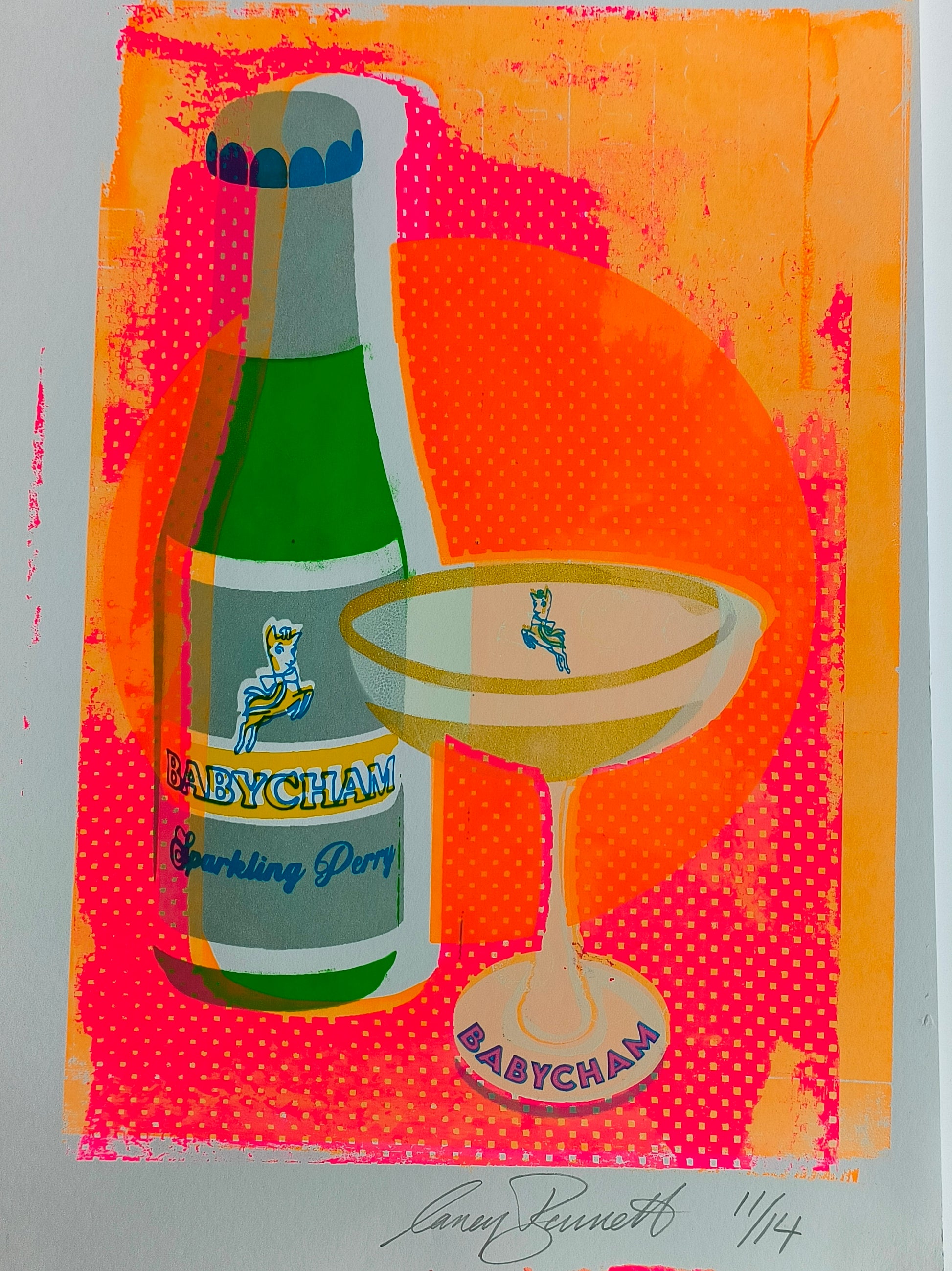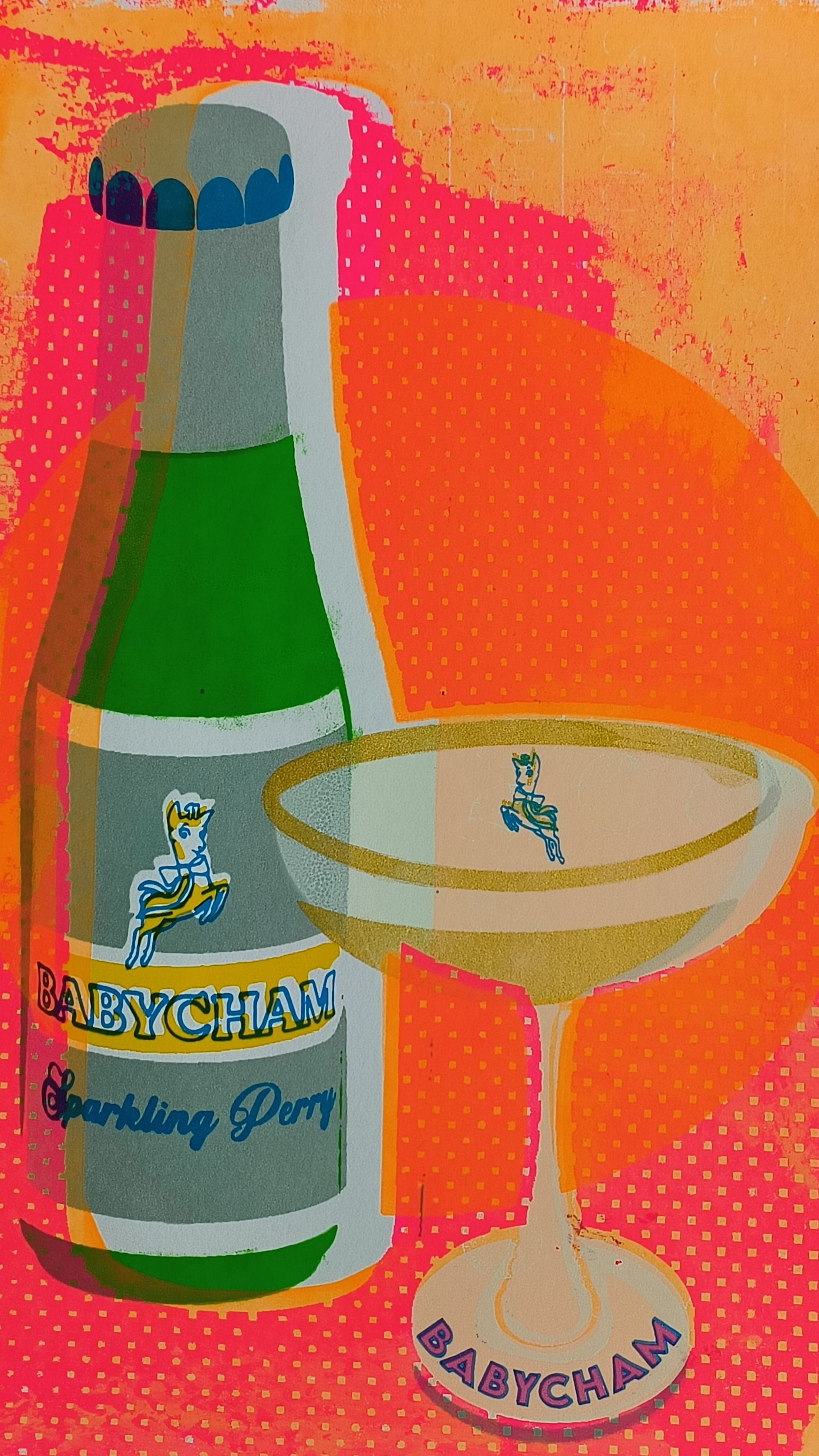 These multi layered screen prints capture the essence of nostalgia depicting a retro Babycham bottle and glass. The vibrant colours, gold overlays and halftones evoke a sense of celebration and luxury. The quirky offset typography and deliberate misalignment adds a playful touch, evoking cherished memories of secretly being given glasses of it by Grandparents at Christmas. Recalling happy times of small glasses and retro drinks cabinets.