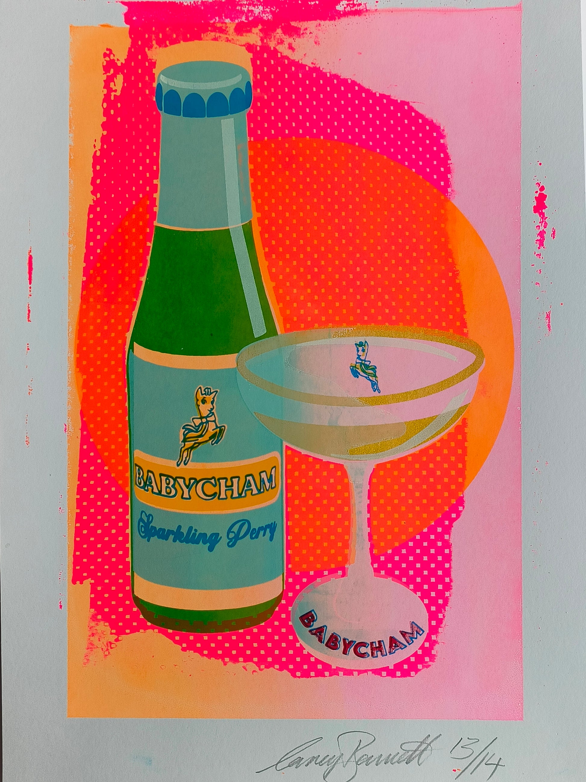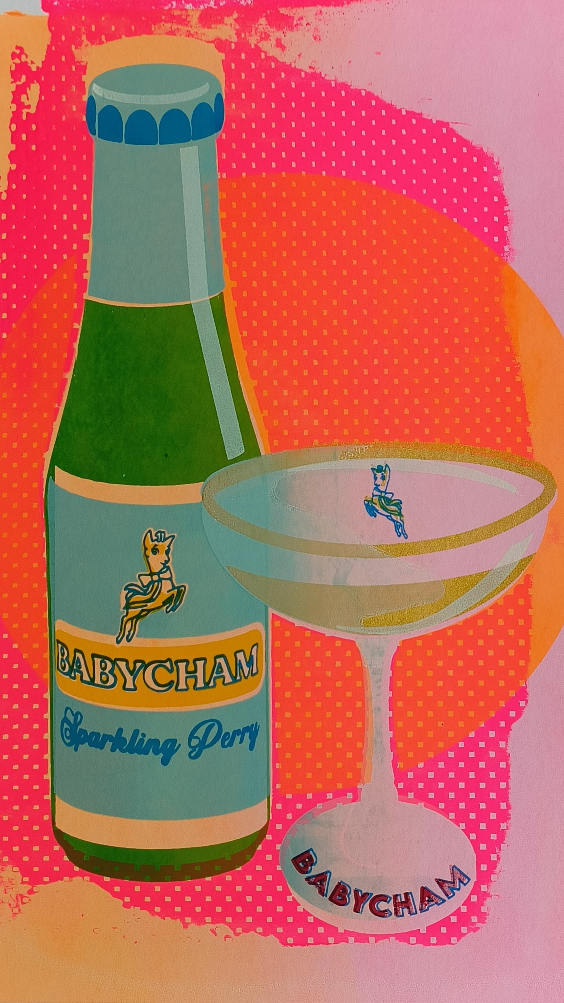 These multi layered screen prints capture the essence of nostalgia depicting a retro Babycham bottle and glass. The vibrant colours, gold overlays and halftones evoke a sense of celebration and luxury. The quirky offset typography and deliberate misalignment adds a playful touch, evoking cherished memories of secretly being given glasses of it by Grandparents at Christmas. Recalling happy times of small glasses and retro drinks cabinets.