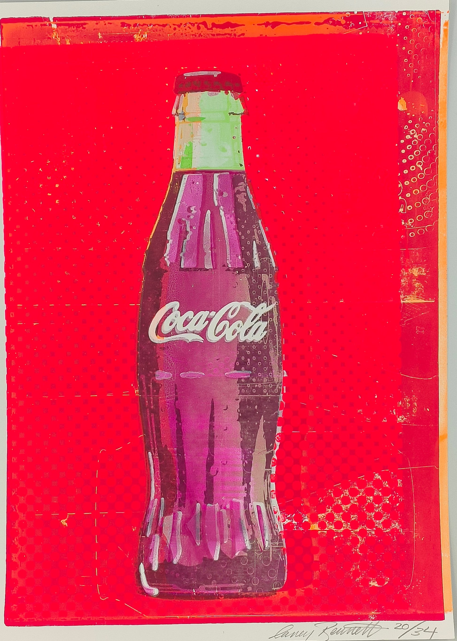 This A4 multi-layered screen prints pays homage to the iconic design of the Coca Cola bottle and brand. Each print is uniquely layered with texture and vibrant colours. Retro halftones pay homage to its vintage heritage, invoking a sense of nostalgia.