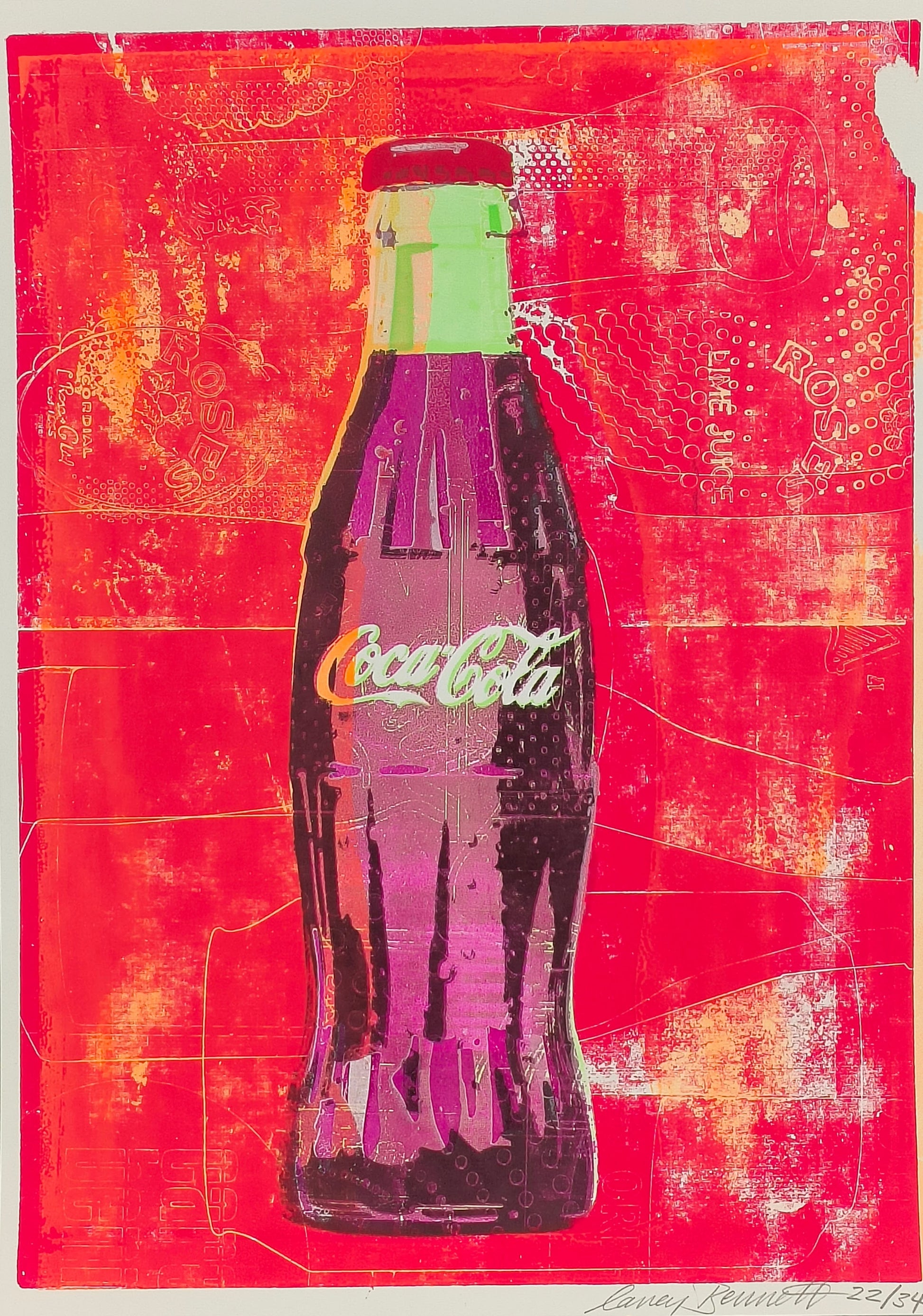 This A4 multi-layered screen prints pays homage to the iconic design of the Coca Cola bottle and brand. Each print is uniquely layered with texture and vibrant colours. Retro halftones pay homage to its vintage heritage, invoking a sense of nostalgia.