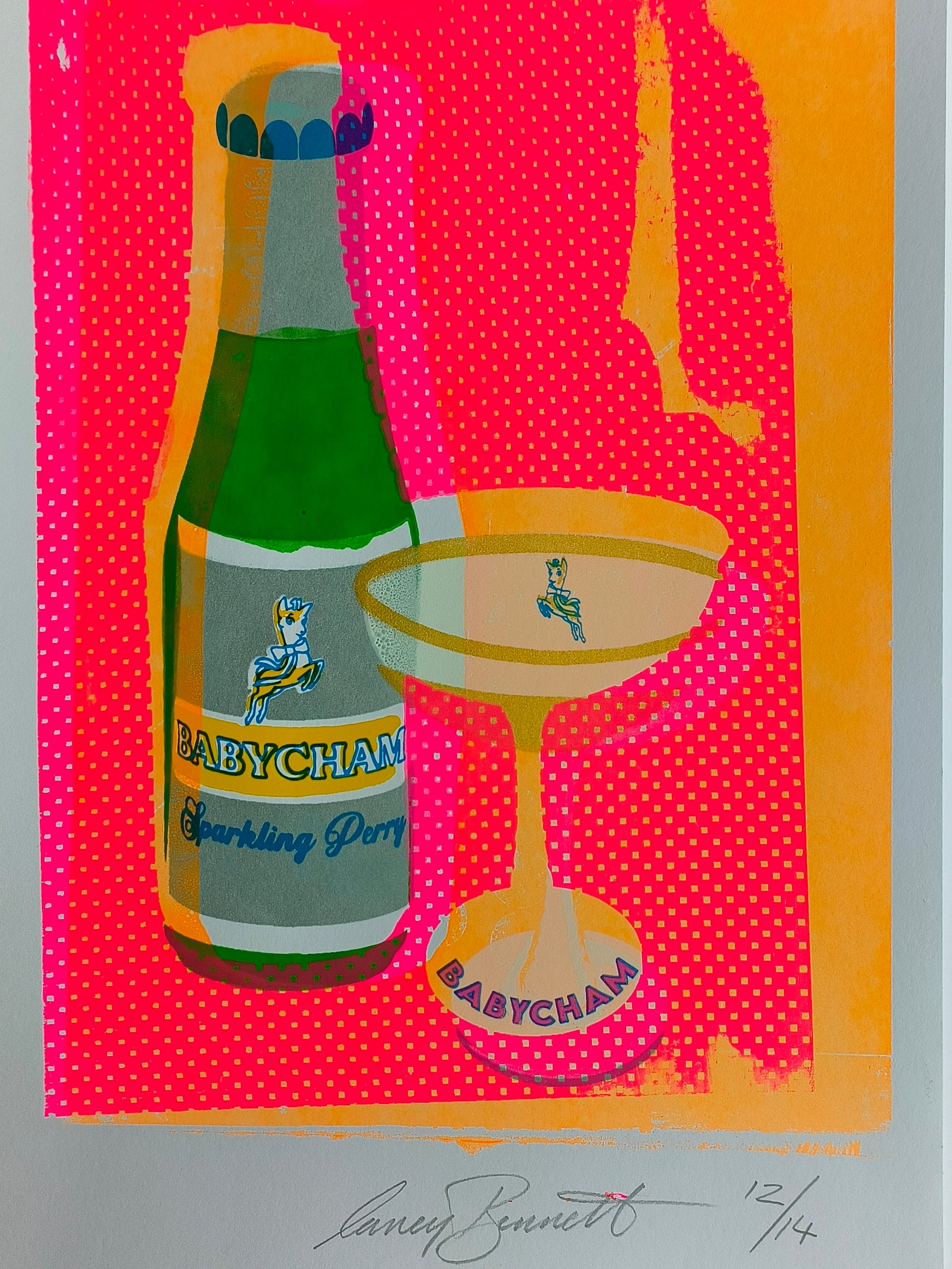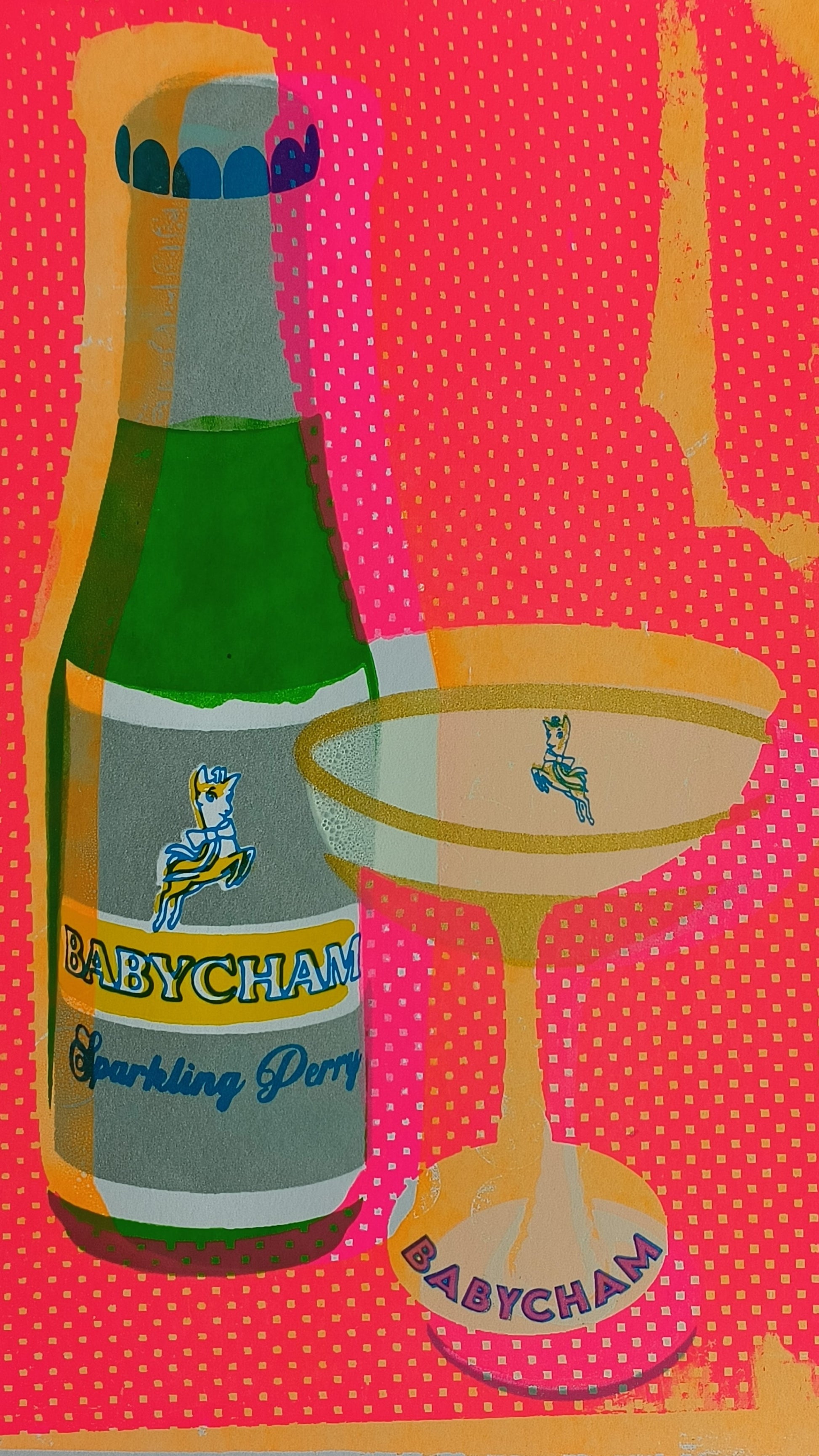 These multi layered screen prints capture the essence of nostalgia depicting a retro Babycham bottle and glass. The vibrant colours, gold overlays and halftones evoke a sense of celebration and luxury. The quirky offset typography and deliberate misalignment adds a playful touch, evoking cherished memories of secretly being given glasses of it by Grandparents at Christmas. Recalling happy times of small glasses and retro drinks cabinets.