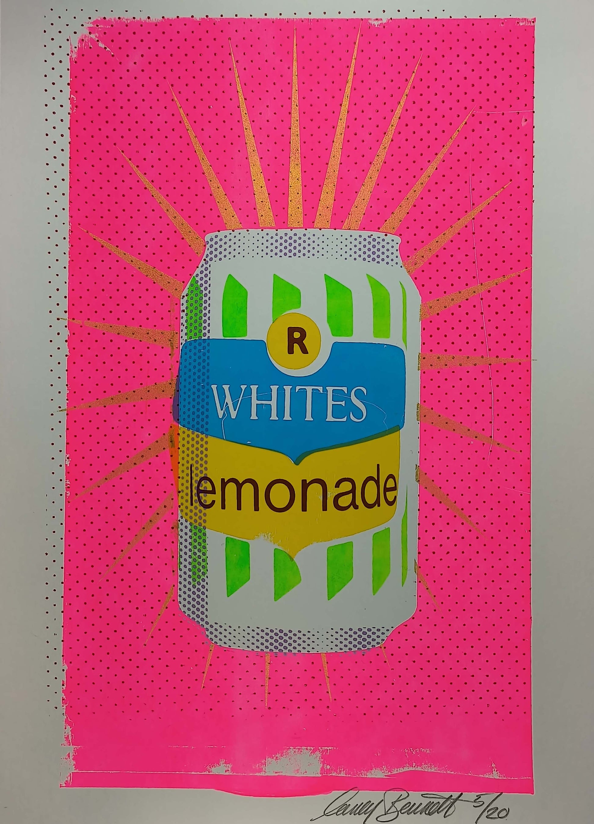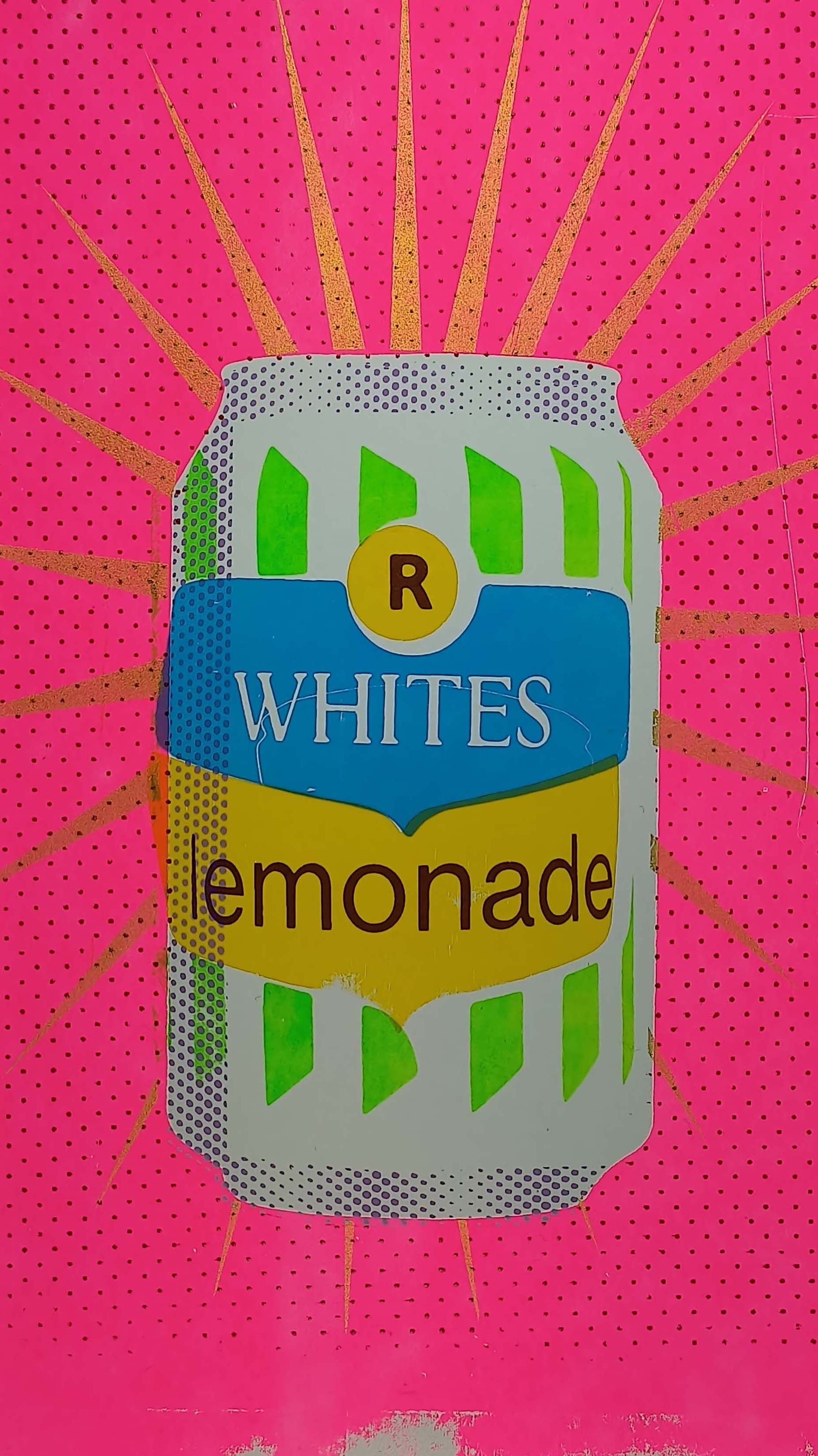 Are you a secret lemonade drinker? This collection of A4 multi-layered screen prints presents a captivating revival of a retro can of R White's lemonade. Deliberately imperfect to represent the uncertain nature of memory. Its vibrant fluorescent palette gives a sense of nostalgia. The offset typography adds a quirky charm. These prints merge vintage aesthetics with contemporary artistry, evoking a delightful sense of timelessness. The brand is significant to me as it was a special treat when I was a child. Especially, when mixed with the Advocaat at Christmas!