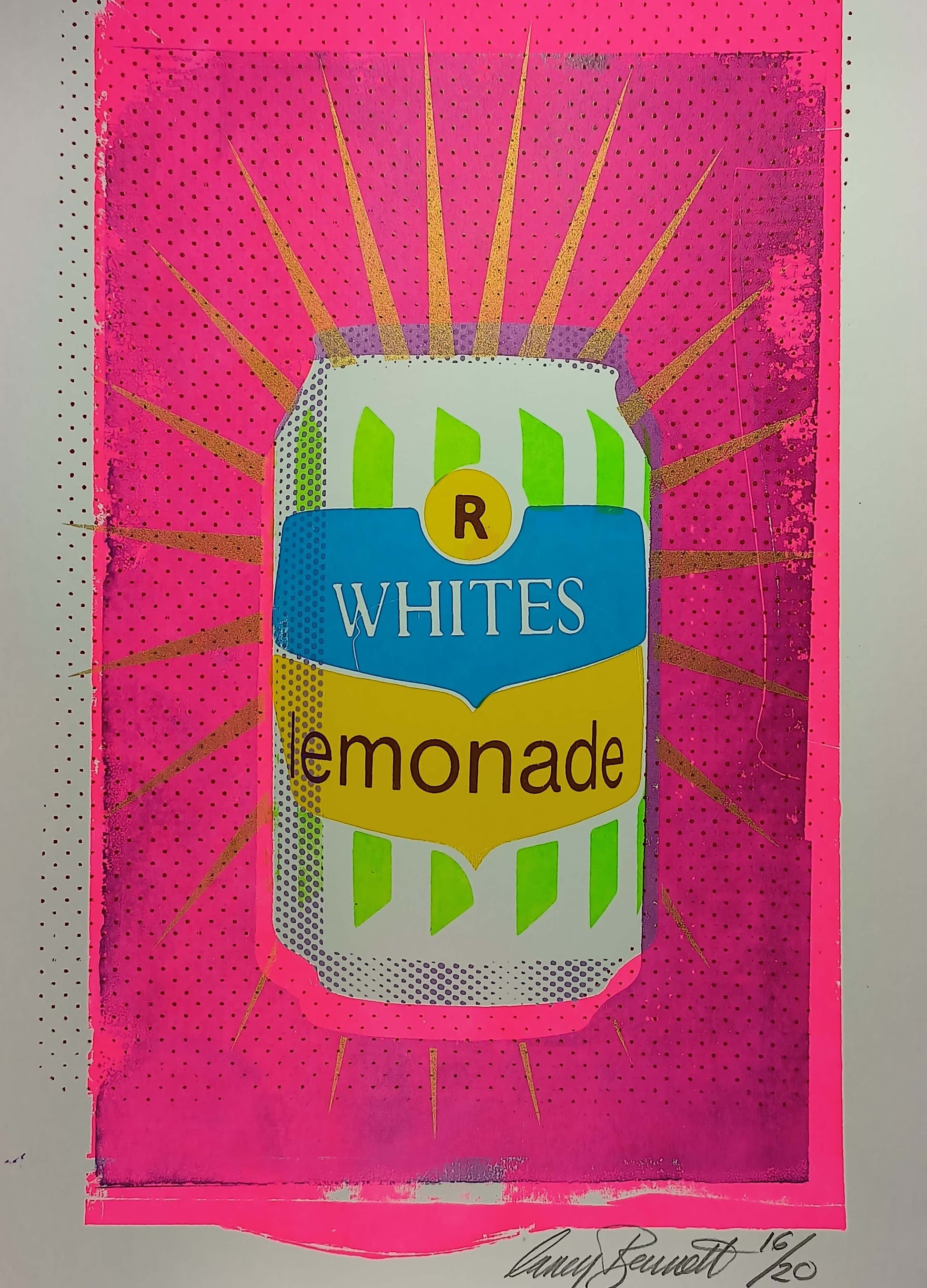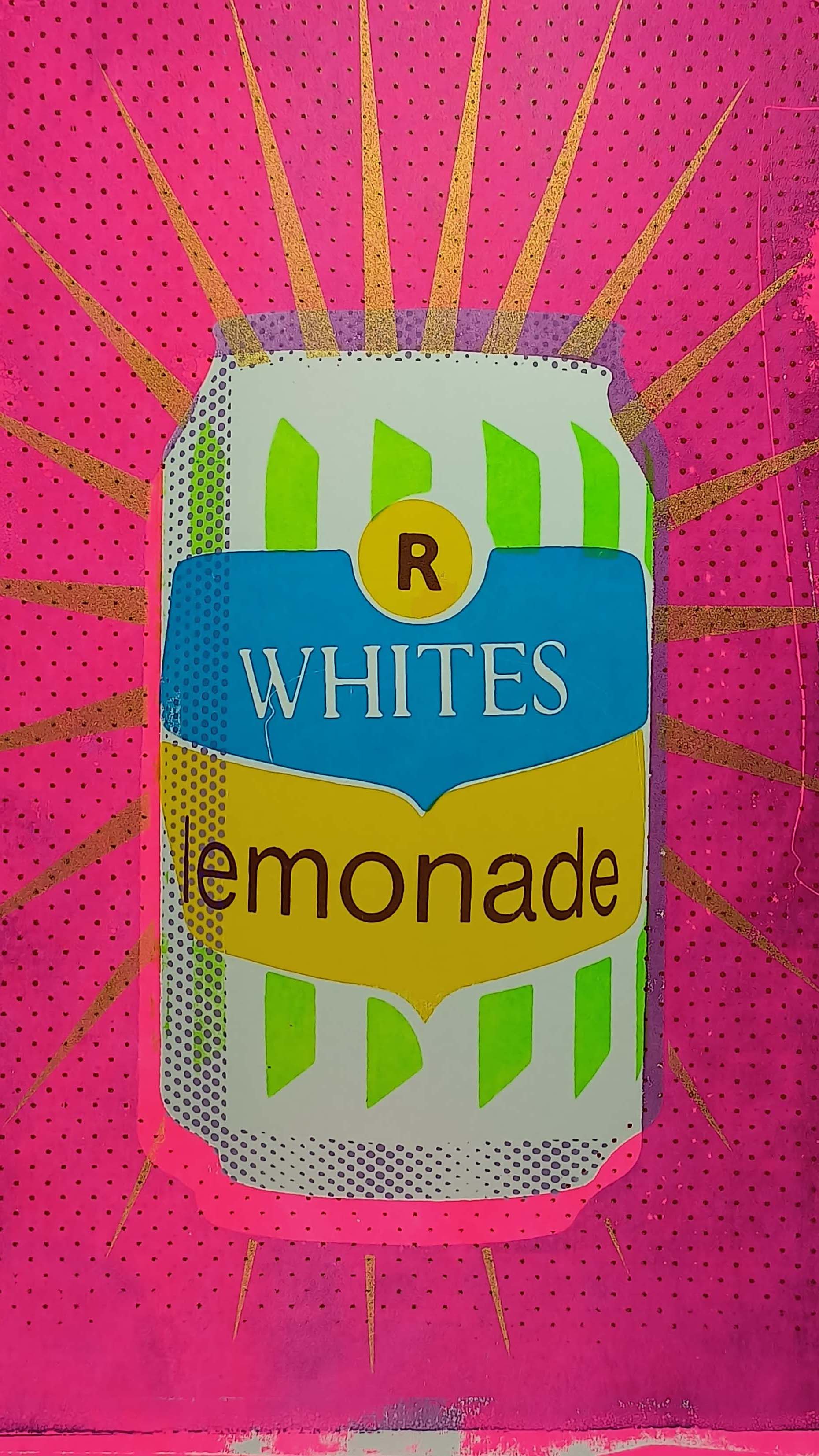 Are you a secret lemonade drinker? This collection of A4 multi-layered screen prints presents a captivating revival of a retro can of R White's lemonade. Deliberately imperfect to represent the uncertain nature of memory. Its vibrant fluorescent palette gives a sense of nostalgia. The offset typography adds a quirky charm. These prints merge vintage aesthetics with contemporary artistry, evoking a delightful sense of timelessness. The brand is significant to me as it was a special treat when I was a child. Especially, when mixed with the Advocaat at Christmas!