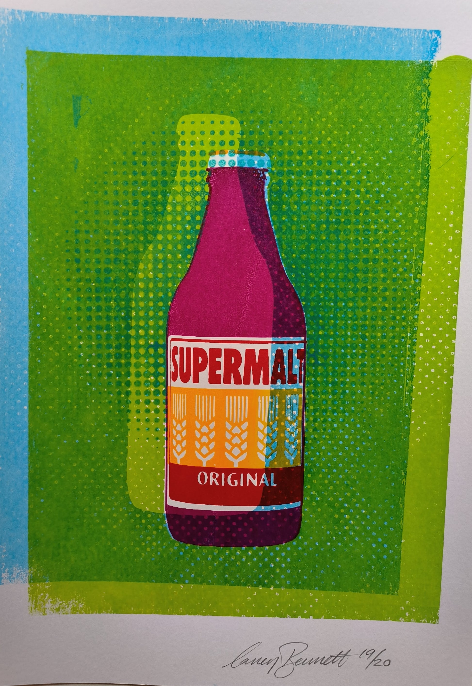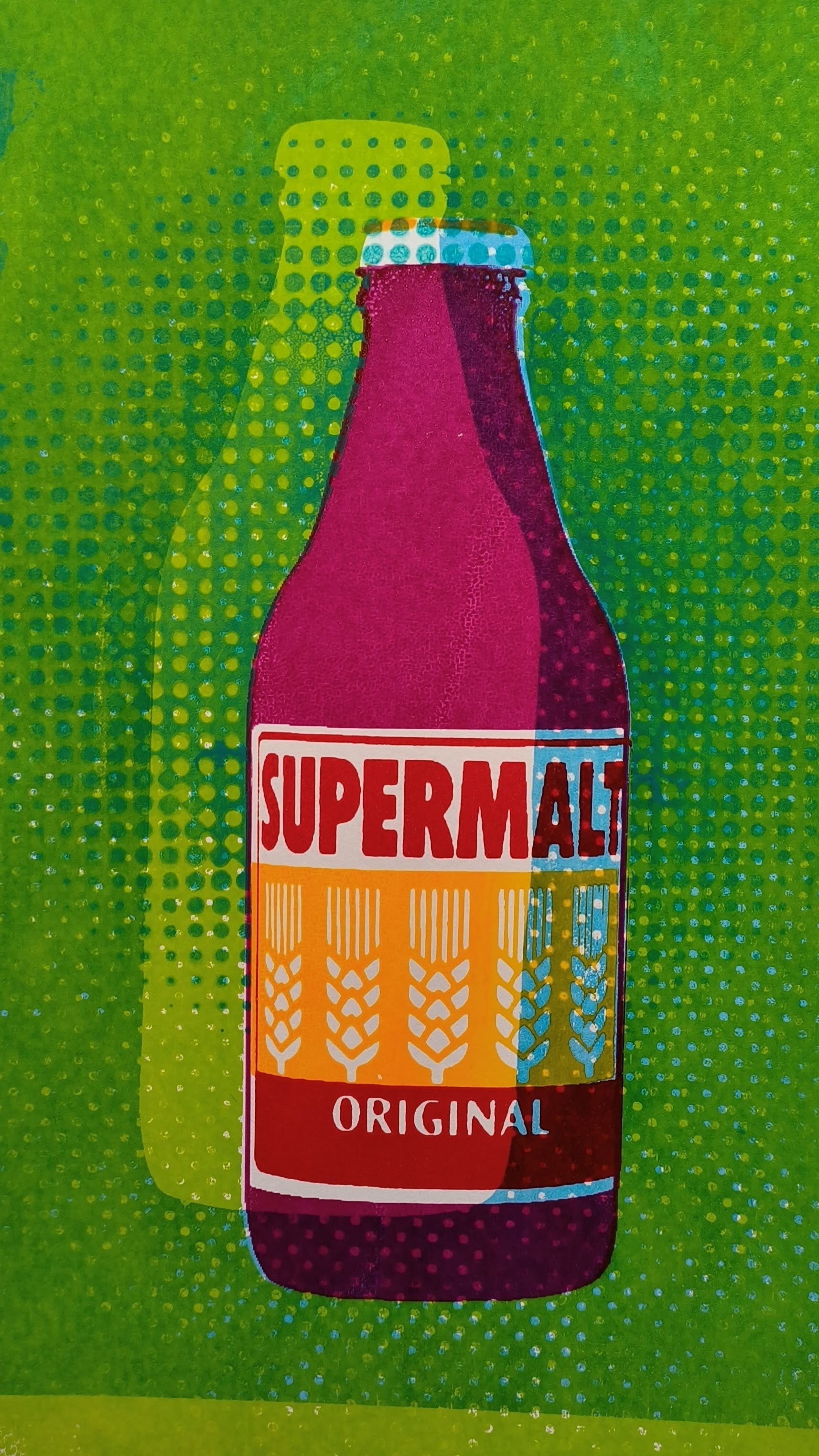 This A4 multi layered screenprint celebrates the iconic Supermalt bottle, a drink with a rich history dating back to its inception for the Nigerian army in 1972. The print seamlessly blends vibrant overlapping colors, conveying dynamism and strength, reminiscent of the drink's origins. Retro halftones pay homage to its vintage heritage, invoking a sense of nostalgia. The inclusion of quirky offset typography adds a playful touch, mirroring the drink's unique character. With its layered design, this print captures the essence of vigor and history, making it an ideal gift for the bodybuilder in your life, encapsulating their dedication and celebrating Supermalt's legacy.