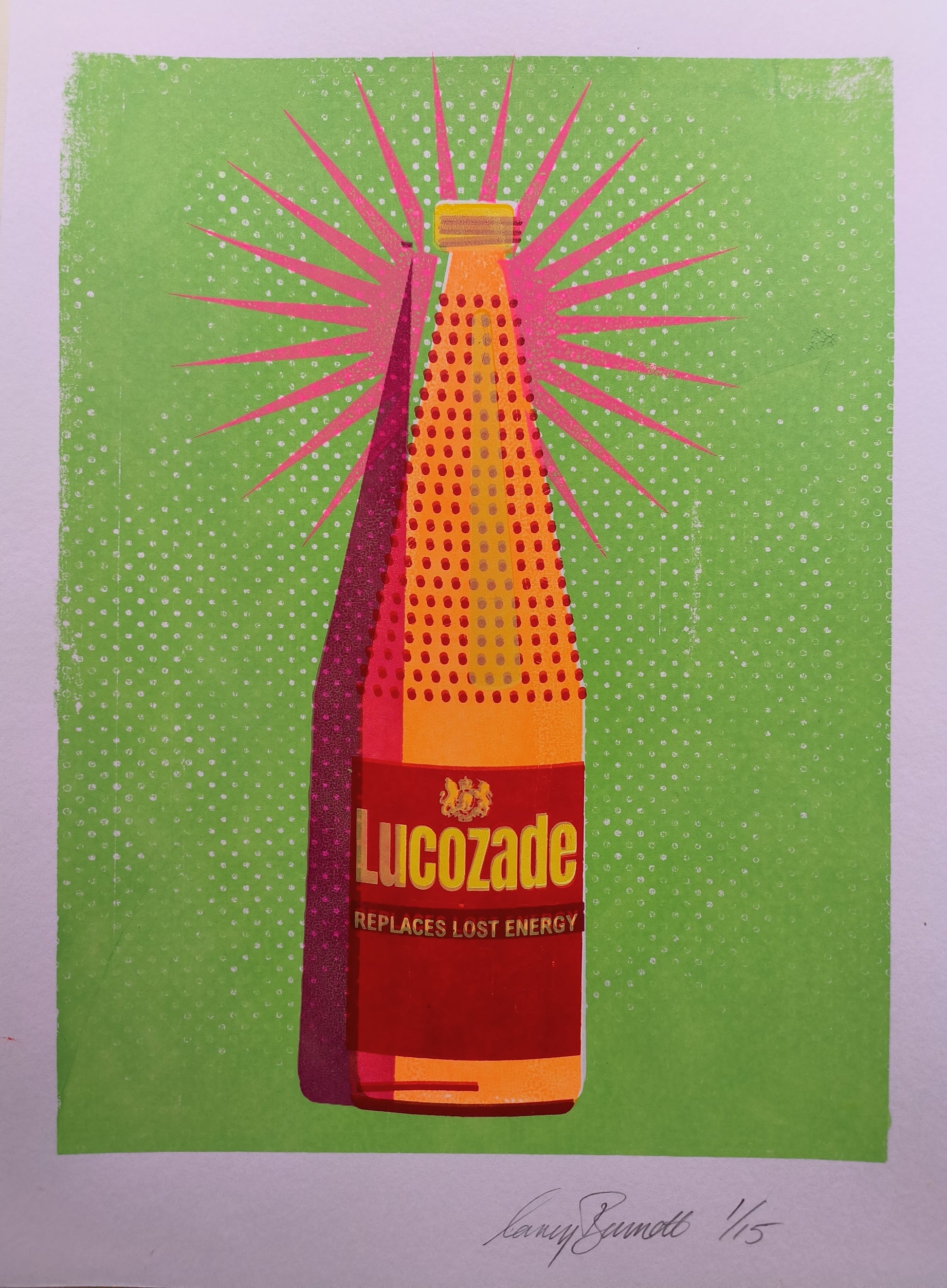 This multilayered screen print presents a captivating revival of a retro Lucozade bottle. Its vibrant color palette infuses a sense of nostalgic energy, while the strategic use of overlays adds a touch of elegance and luxury. The offset typography exudes a quirky charm, playing with the viewer's perception. The layers intertwine seamlessly, crafting a dynamic depth that invites exploration. This print masterfully fuses vintage aesthetics with contemporary artistry, evoking a delightful sense of timelessness and innovation.