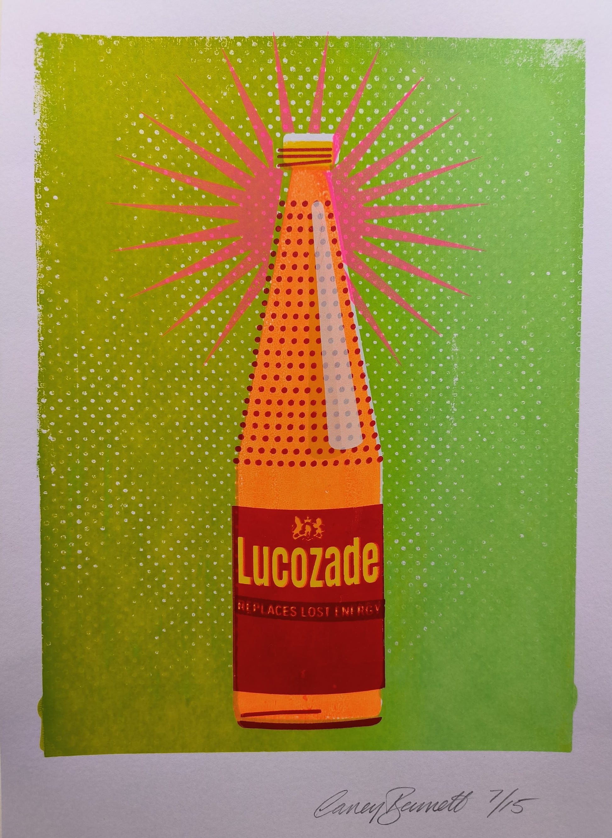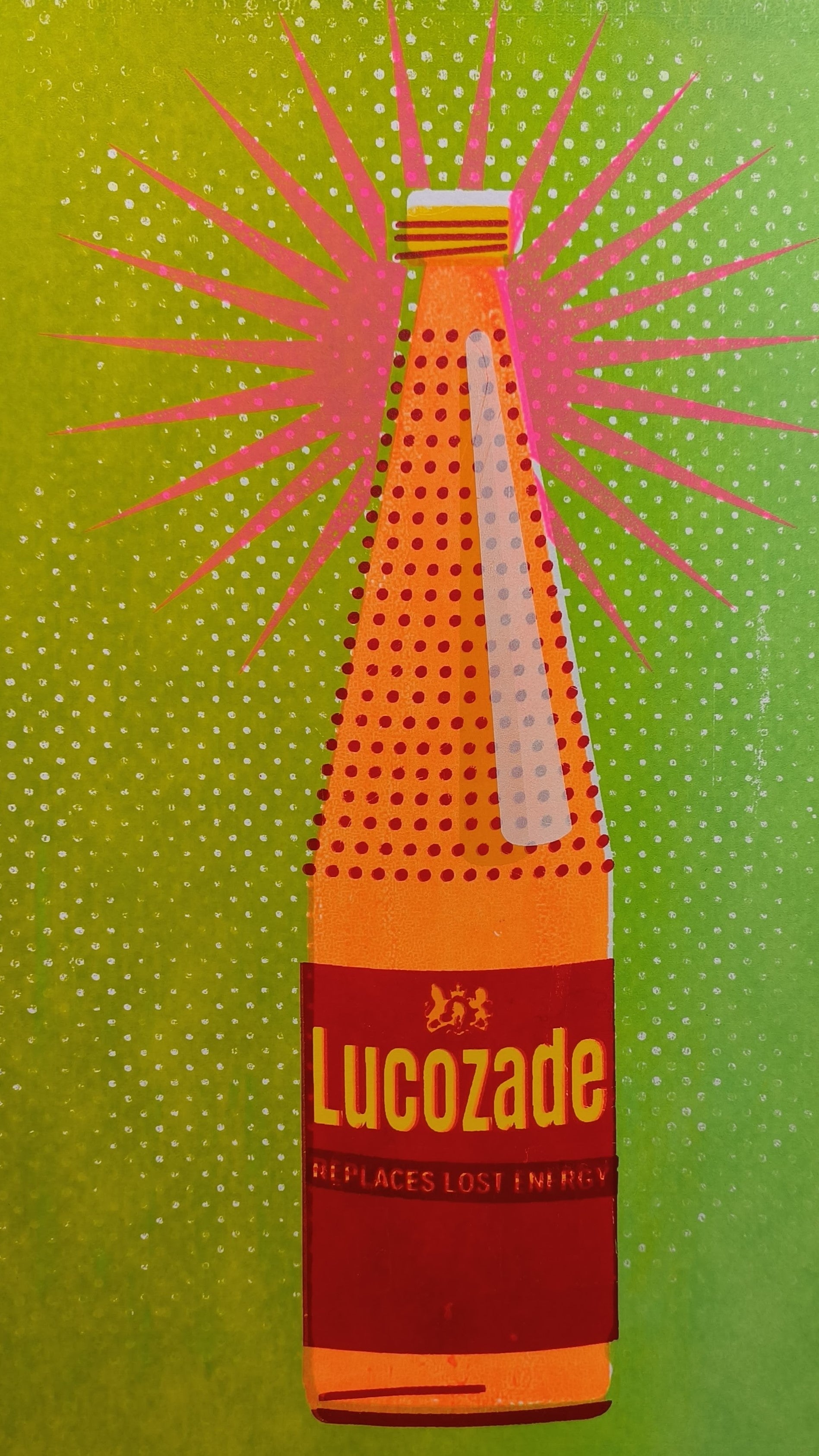 This multilayered screen print presents a captivating revival of a retro Lucozade bottle. Its vibrant color palette infuses a sense of nostalgic energy, while the strategic use of overlays adds a touch of elegance and luxury. The offset typography exudes a quirky charm, playing with the viewer's perception. The layers intertwine seamlessly, crafting a dynamic depth that invites exploration. This print masterfully fuses vintage aesthetics with contemporary artistry, evoking a delightful sense of timelessness and innovation.