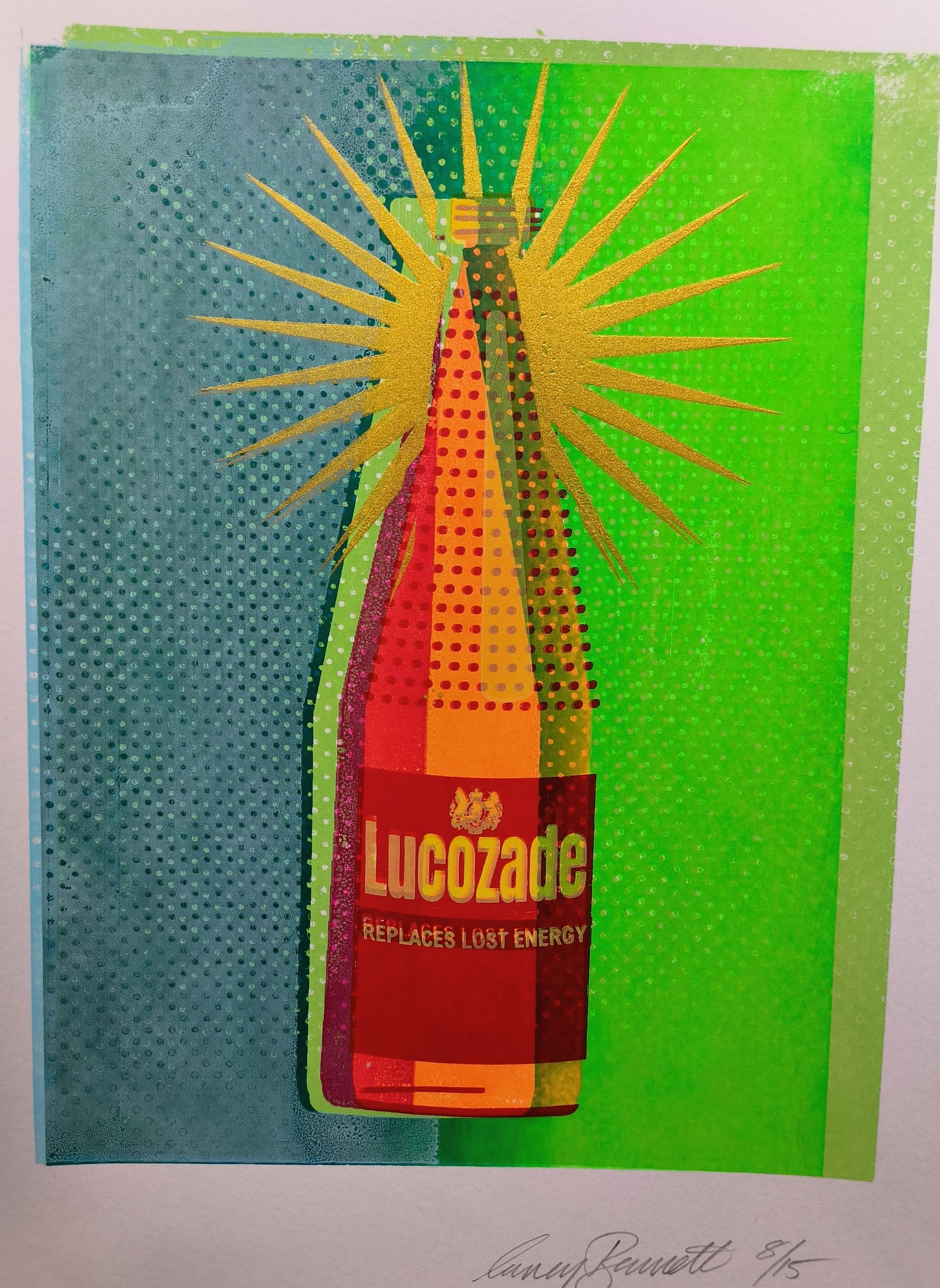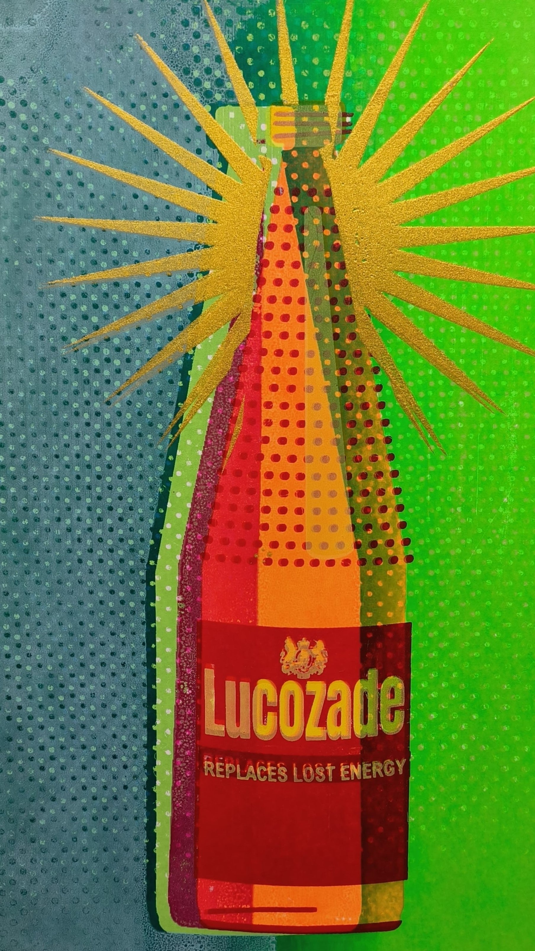 This multilayered screen print presents a captivating revival of a retro Lucozade bottle. Its vibrant colour palette infuses a sense of nostalgic energy, while the strategic use of gold overlays adds a touch of elegance and luxury. The offset typography exudes a quirky charm, playing with the viewer's perception. The layers intertwine seamlessly, crafting a dynamic depth that invites exploration. This print masterfully fuses vintage aesthetics with contemporary artistry, evoking a delightful sense of timelessness and innovation.