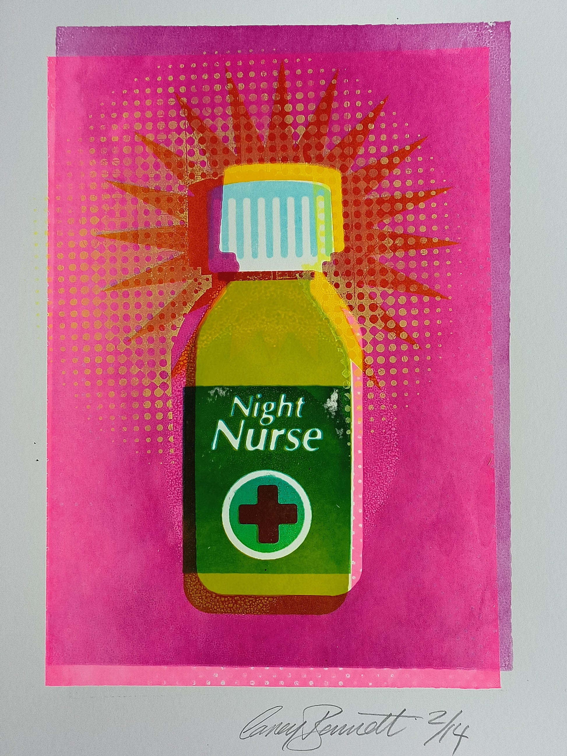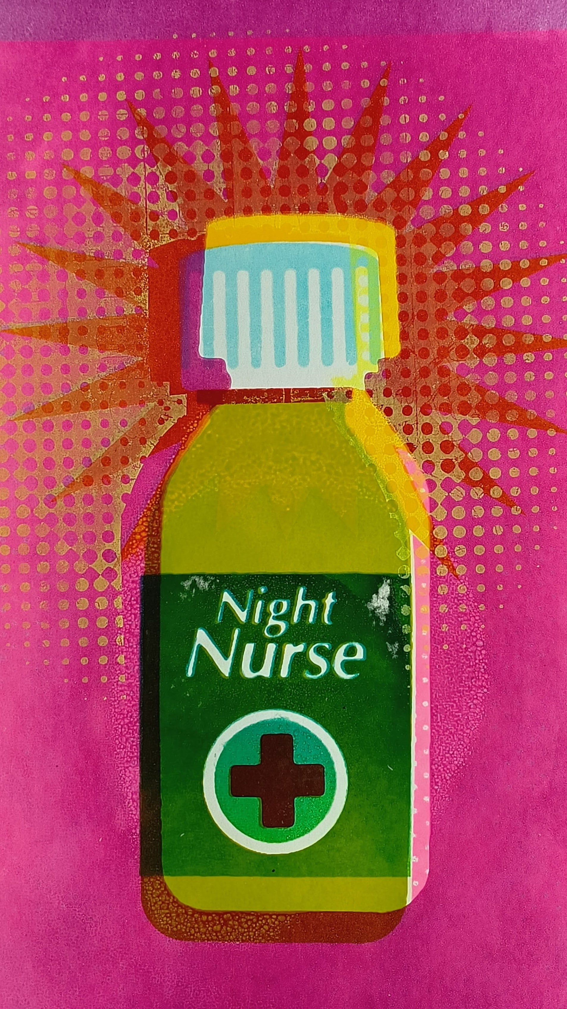 This multi layered screen print of a retro Night Nurse bottle harmoniously blends nostalgia with a contemporary twist. The vibrant colour palette exudes a sense of vitality and optimism, making it a fitting 'get well soon' gift. The use of halftones adds a touch of vintage, evoking memories of classic advertisements. The offset typography injects a playful quirkiness, infusing the artwork with personality. This print captures the essence of care and recovery through its layered design, making it a thoughtful and captivating present.
