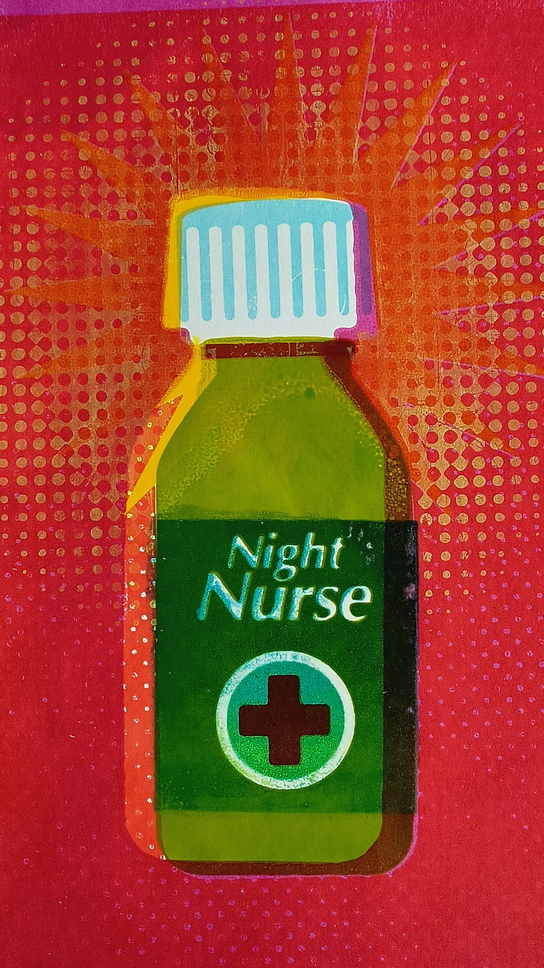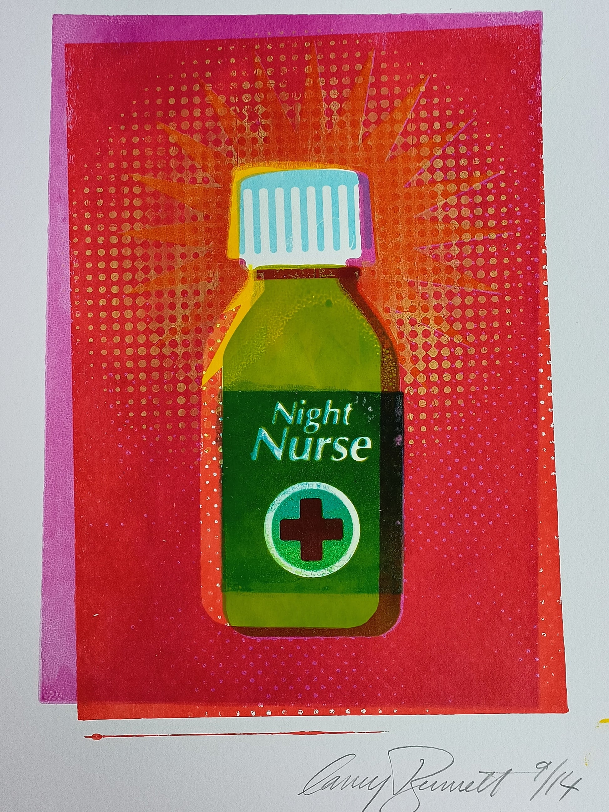 This multi layered screen print of a retro Night Nurse bottle harmoniously blends nostalgia with a contemporary twist. The vibrant colour palette exudes a sense of vitality and optimism, making it a fitting 'get well soon' gift. The use of halftones adds a touch of vintage, evoking memories of classic advertisements. The offset typography injects a playful quirkiness, infusing the artwork with personality. This print captures the essence of care and recovery through its layered design, making it a thoughtful and captivating present.