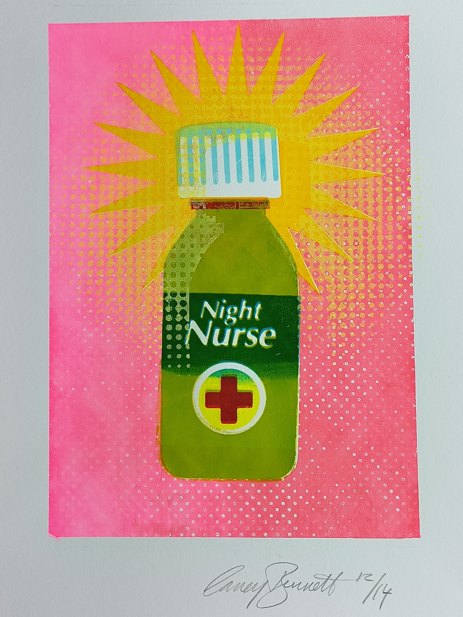This multi layered screen print of a retro Night Nurse bottle harmoniously blends nostalgia with a contemporary twist. The vibrant colour palette exudes a sense of vitality and optimism, making it a fitting 'get well soon' gift. The use of halftones adds a touch of vintage, evoking memories of classic advertisements. The offset typography injects a playful quirkiness, infusing the artwork with personality. This print captures the essence of care and recovery through its layered design, making it a thoughtful and captivating present.