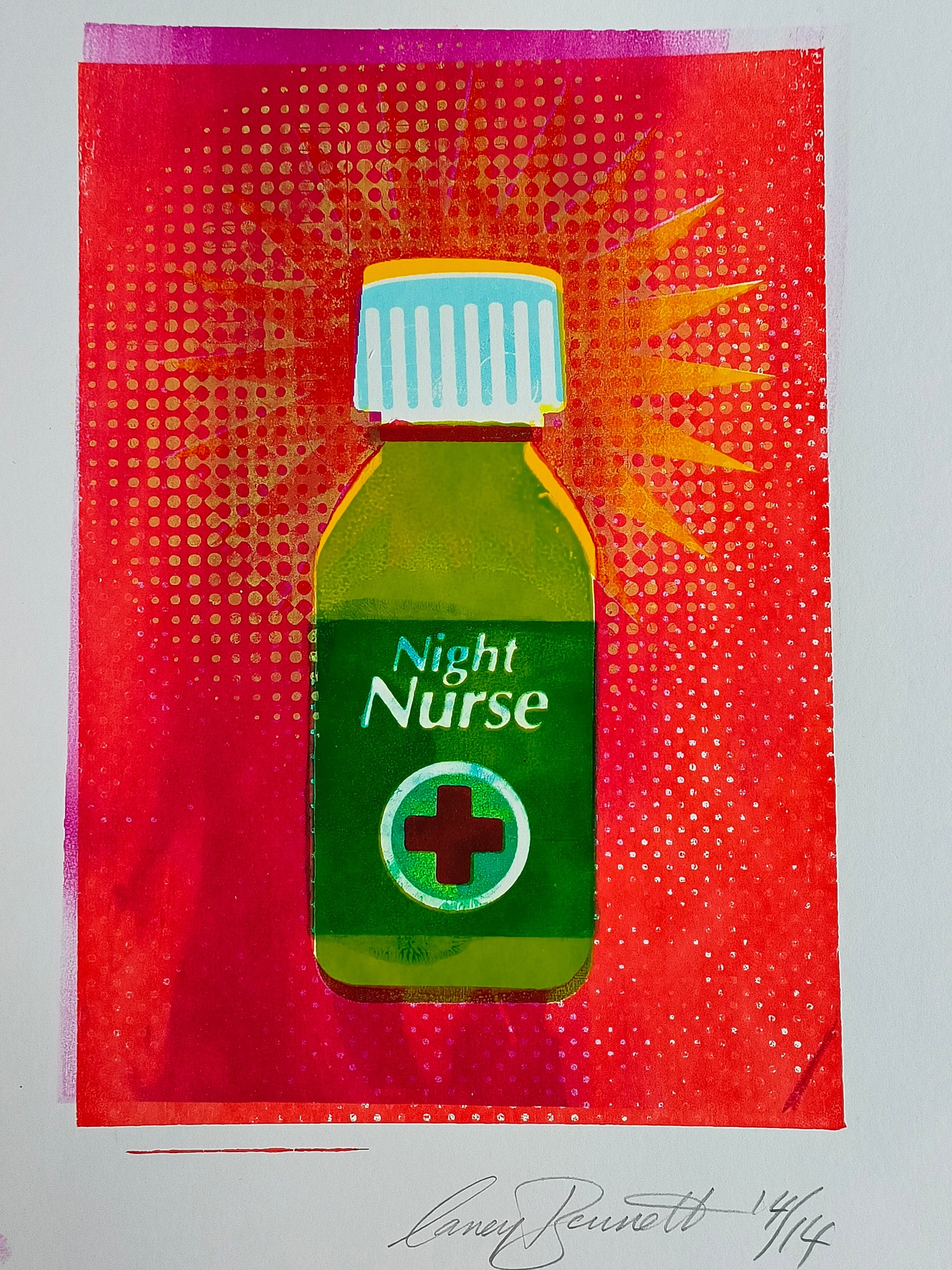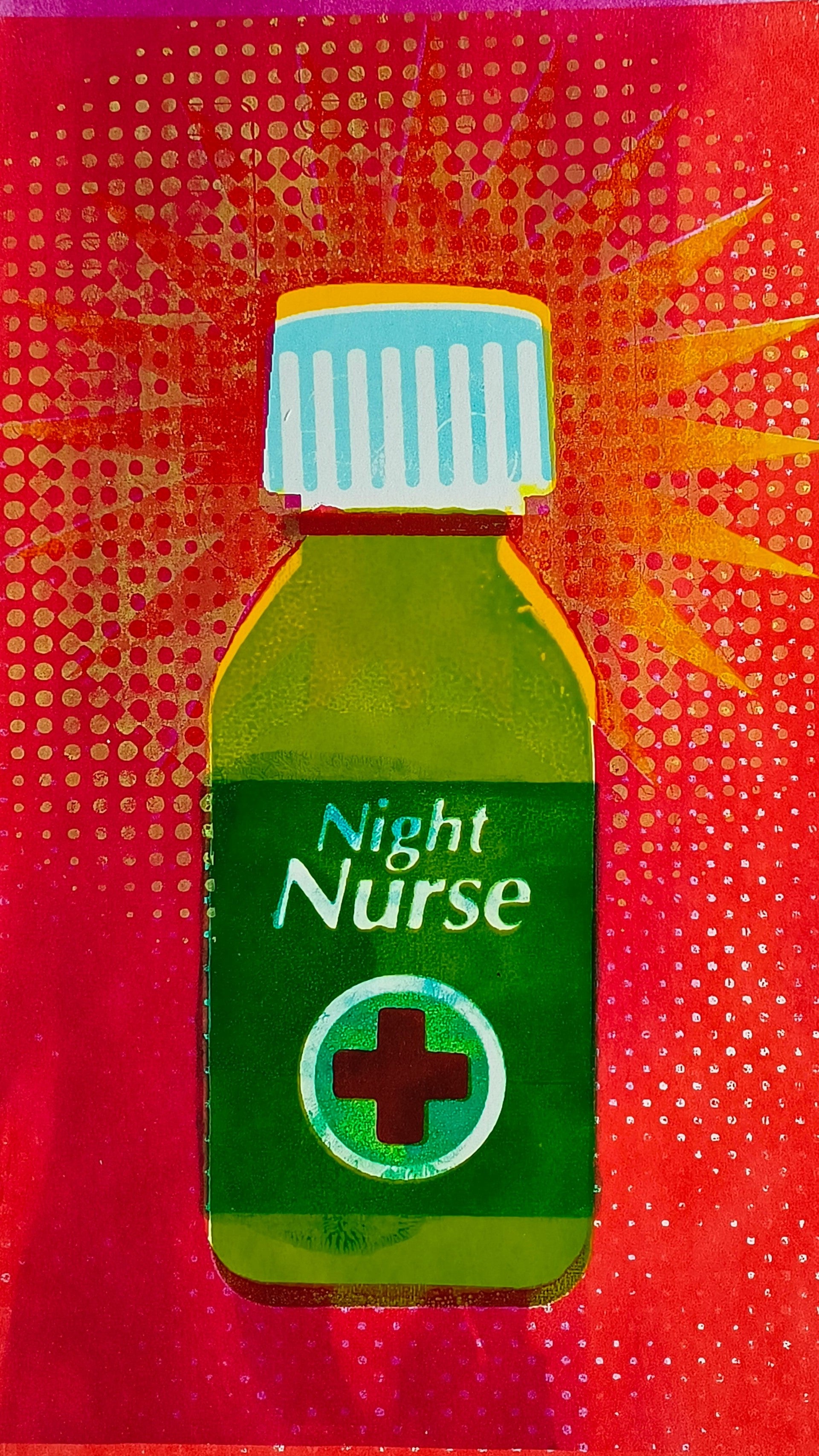 This multi layered screen print of a retro Night Nurse bottle harmoniously blends nostalgia with a contemporary twist. The vibrant colour palette exudes a sense of vitality and optimism, making it a fitting 'get well soon' gift. The use of halftones adds a touch of vintage, evoking memories of classic advertisements. The offset typography injects a playful quirkiness, infusing the artwork with personality. This print captures the essence of care and recovery through its layered design, making it a thoughtful and captivating present.