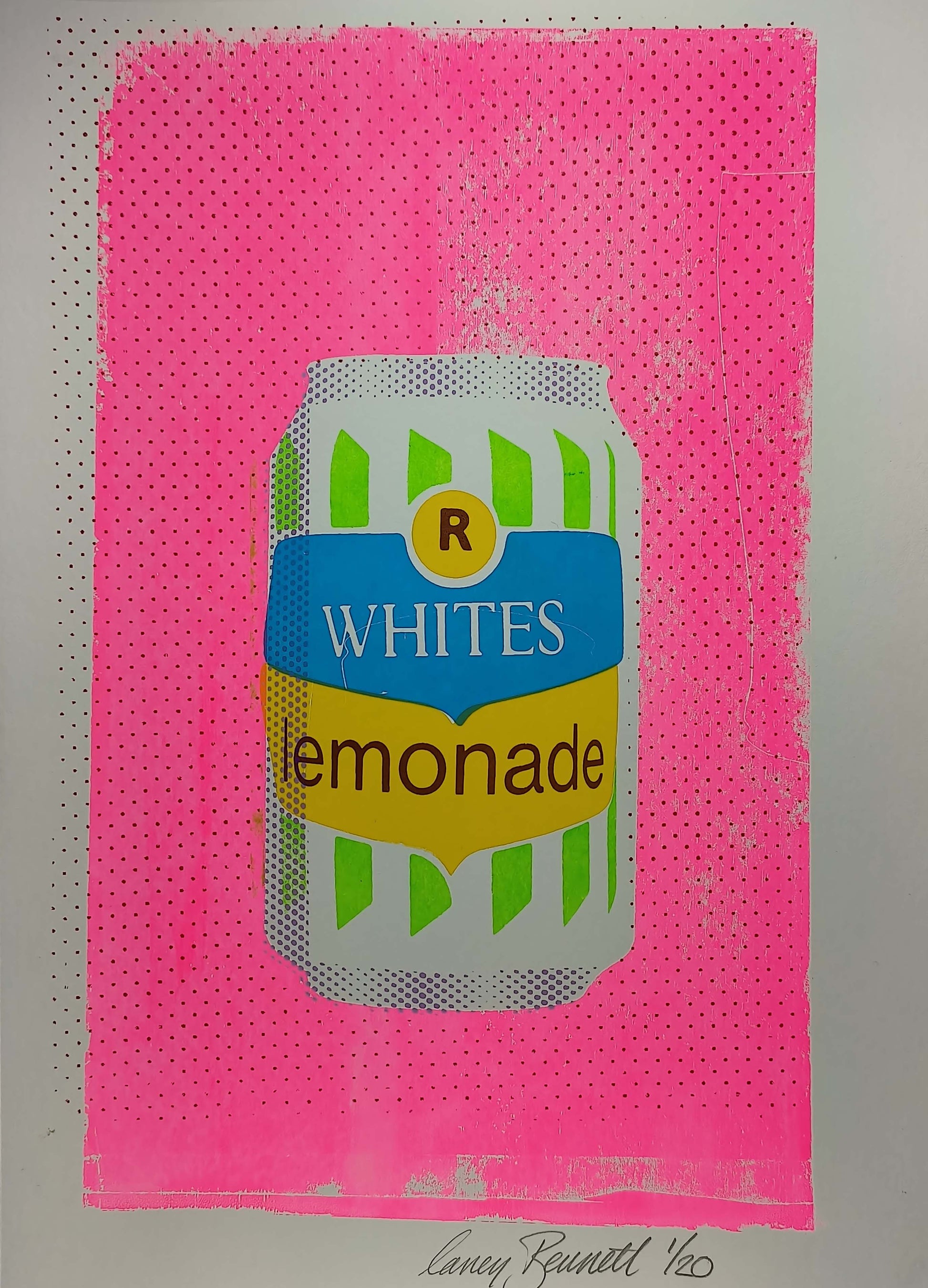 Are you a secret lemonade drinker? This collection of A4 multi-layered screen prints presents a captivating revival of a retro can of R White's lemonade. Deliberately imperfect to represent the uncertain nature of memory. Its vibrant fluorescent palette gives a sense of nostalgia. The offset typography adds a quirky charm. These prints merge vintage aesthetics with contemporary artistry, evoking a delightful sense of timelessness. The brand is significant to me as it was a special treat when I was a child. Especially, when mixed with the Advocaat at Christmas!