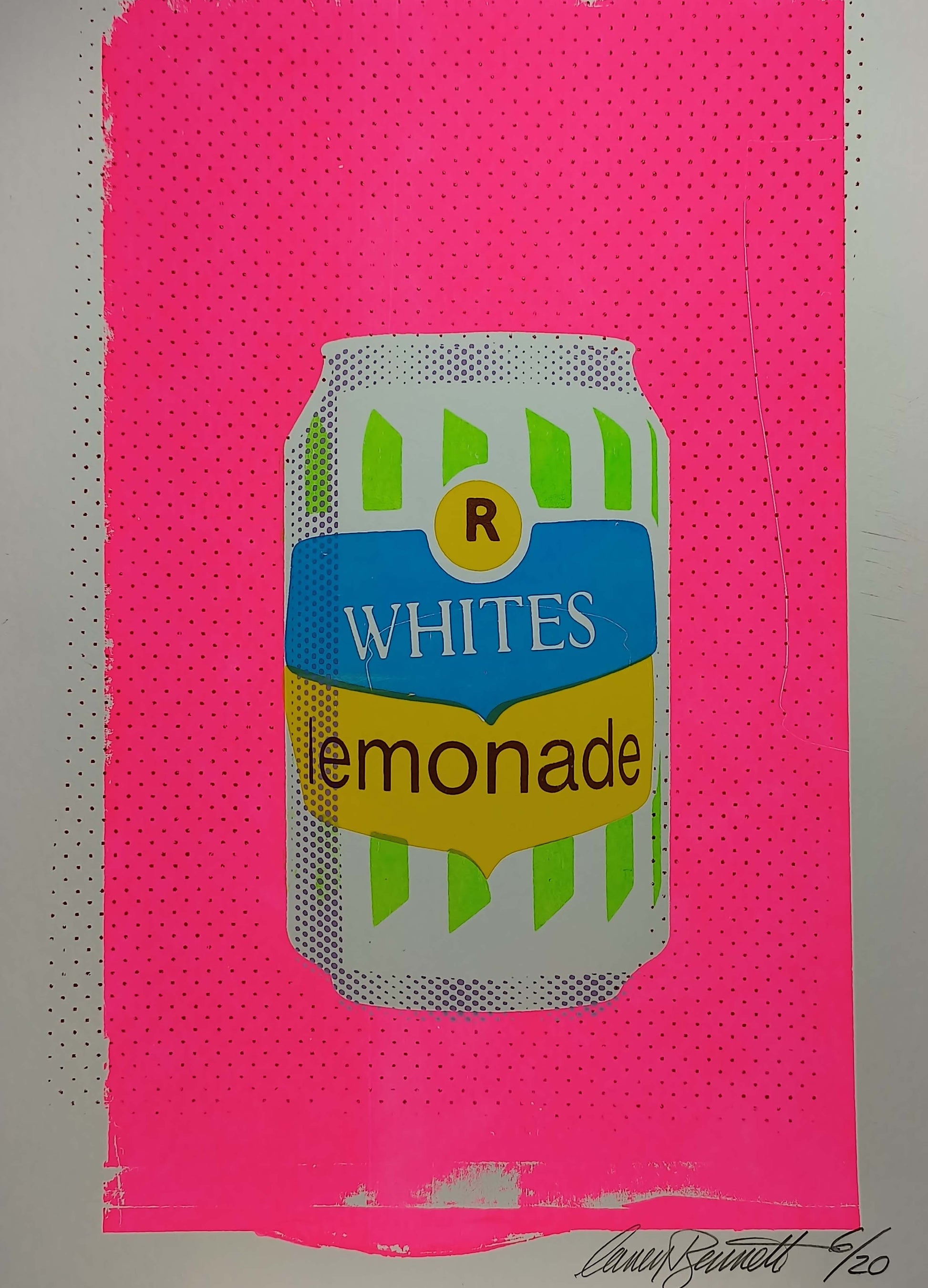 Are you a secret lemonade drinker? This collection of A4 multi-layered screen prints presents a captivating revival of a retro can of R White's lemonade. Deliberately imperfect to represent the uncertain nature of memory. Its vibrant fluorescent palette gives a sense of nostalgia. The offset typography adds a quirky charm. These prints merge vintage aesthetics with contemporary artistry, evoking a delightful sense of timelessness. The brand is significant to me as it was a special treat when I was a child. Especially, when mixed with the Advocaat at Christmas!