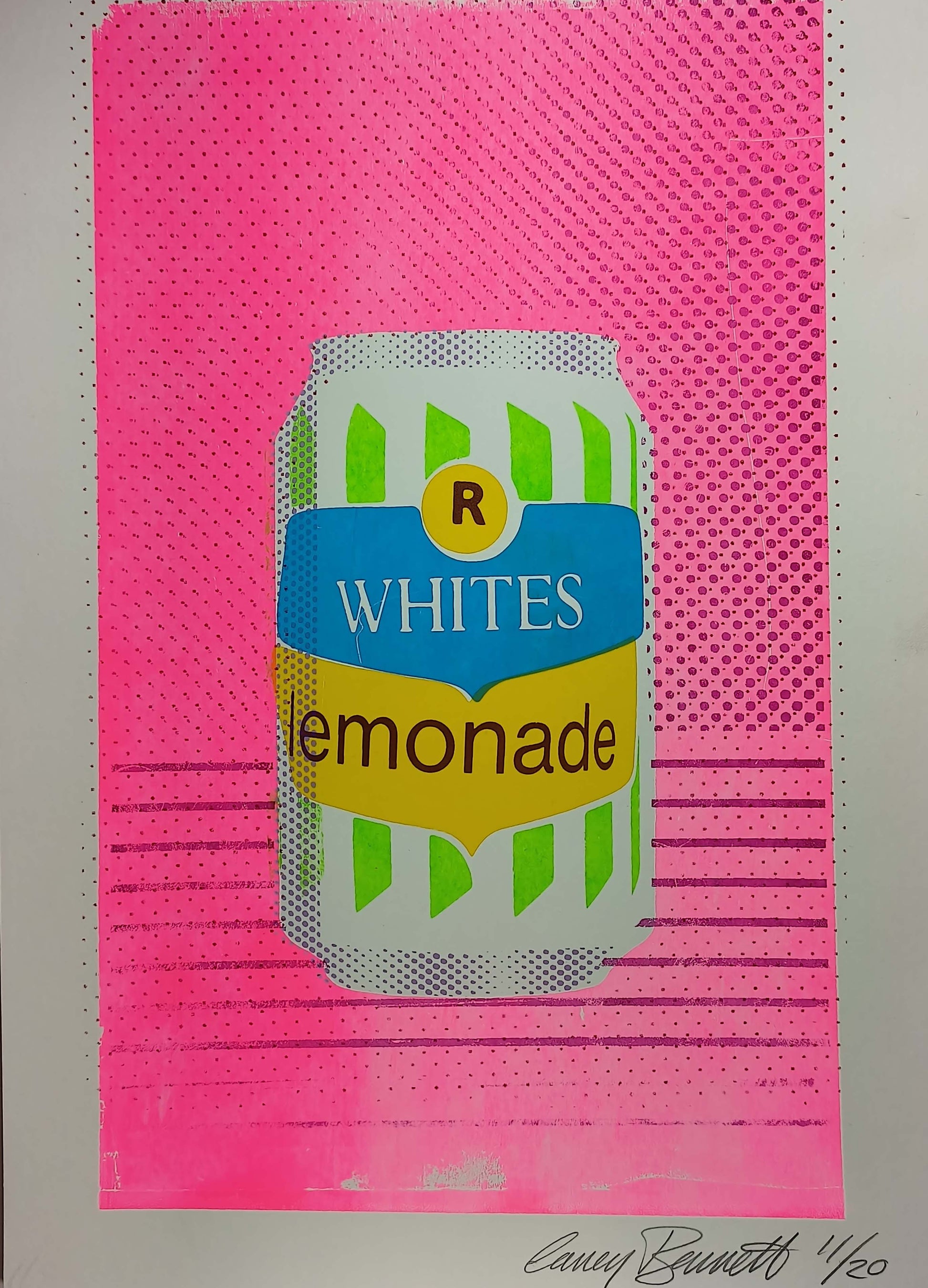 Are you a secret lemonade drinker? This collection of A4 multi-layered screen prints presents a captivating revival of a retro can of R White's lemonade. Deliberately imperfect to represent the uncertain nature of memory. Its vibrant fluorescent palette gives a sense of nostalgia. The offset typography adds a quirky charm. These prints merge vintage aesthetics with contemporary artistry, evoking a delightful sense of timelessness. The brand is significant to me as it was a special treat when I was a child. Especially, when mixed with the Advocaat at Christmas!