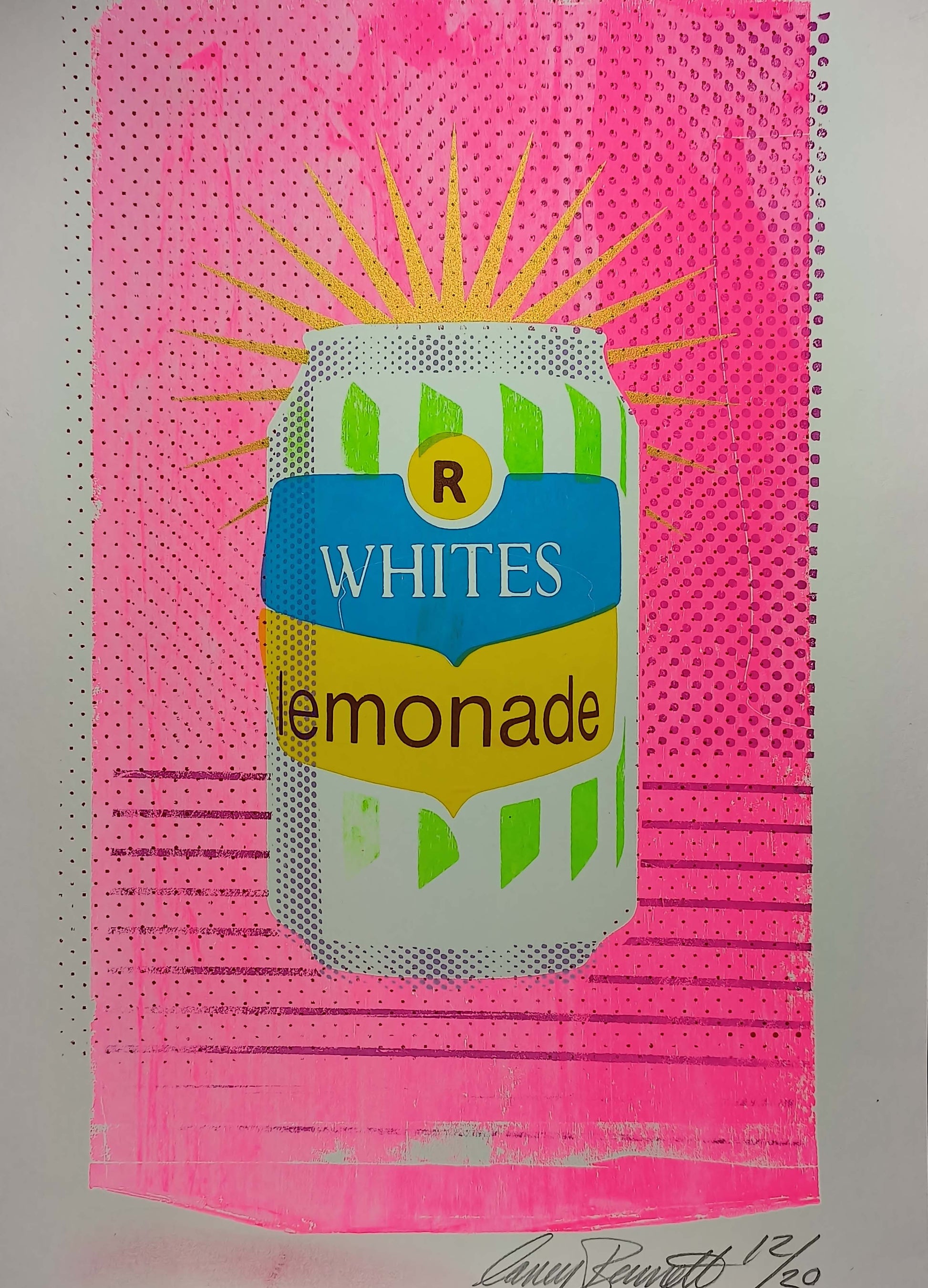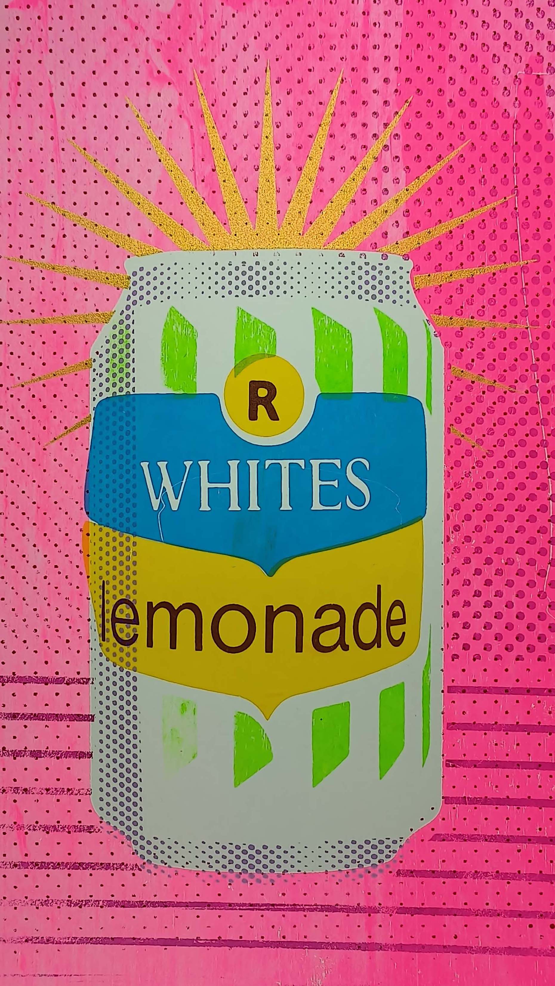 Are you a secret lemonade drinker? This collection of A4 multi-layered screen prints presents a captivating revival of a retro can of R White's lemonade. Deliberately imperfect to represent the uncertain nature of memory. Its vibrant fluorescent palette gives a sense of nostalgia. The offset typography adds a quirky charm. These prints merge vintage aesthetics with contemporary artistry, evoking a delightful sense of timelessness. The brand is significant to me as it was a special treat when I was a child. Especially, when mixed with the Advocaat at Christmas!
