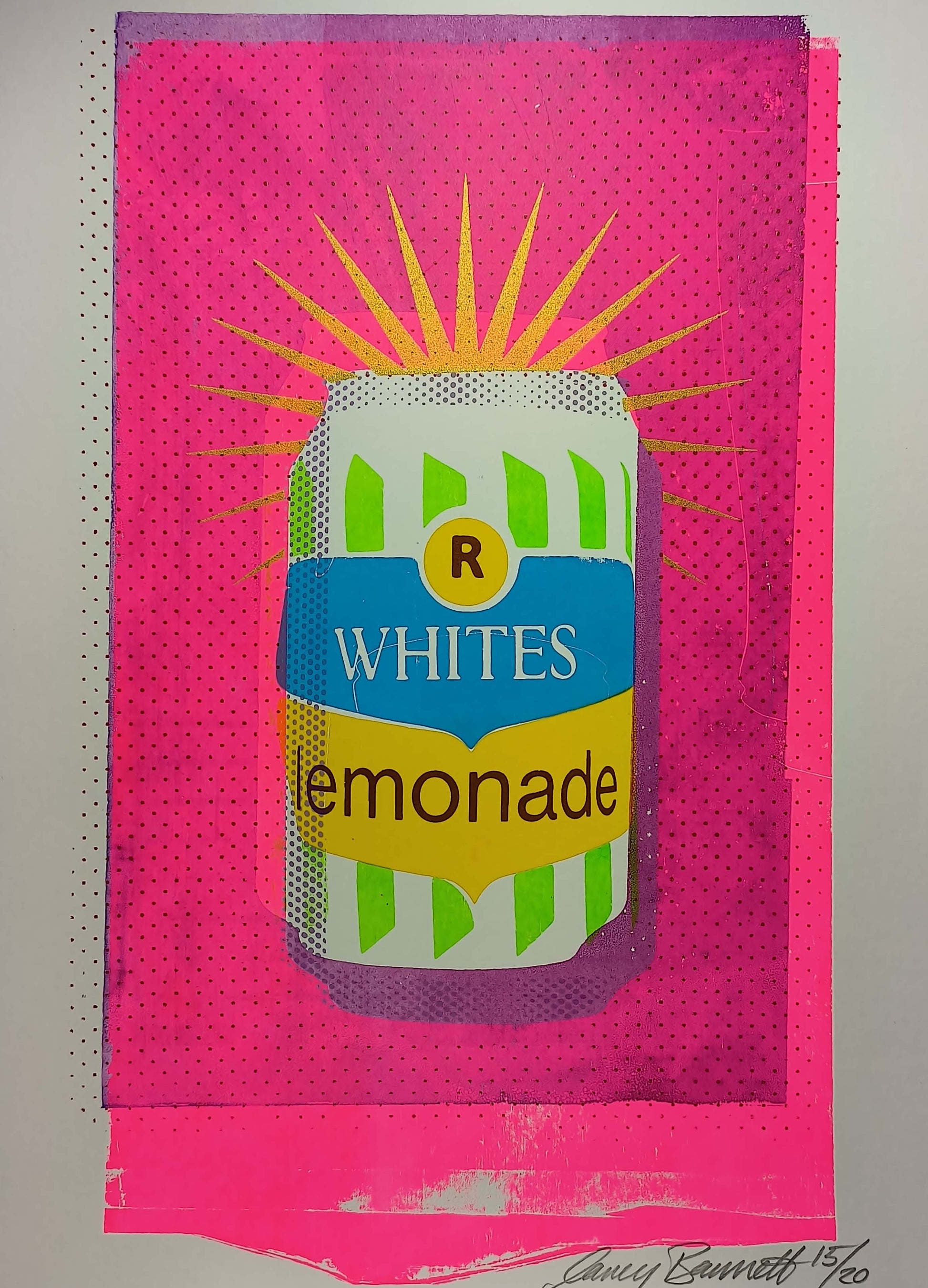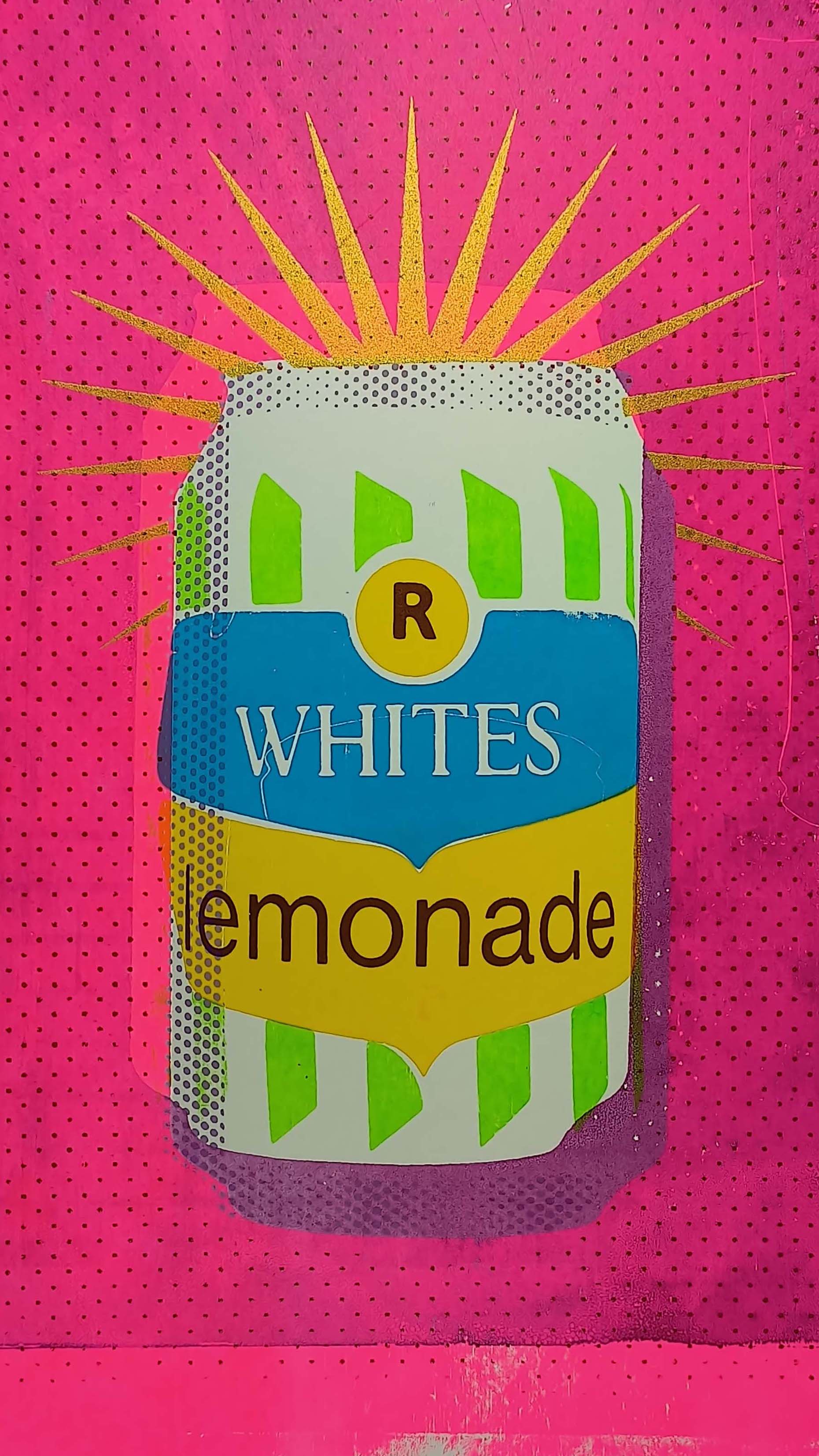Are you a secret lemonade drinker? This collection of A4 multi-layered screen prints presents a captivating revival of a retro can of R White's lemonade. Deliberately imperfect to represent the uncertain nature of memory. Its vibrant fluorescent palette gives a sense of nostalgia. The offset typography adds a quirky charm. These prints merge vintage aesthetics with contemporary artistry, evoking a delightful sense of timelessness. The brand is significant to me as it was a special treat when I was a child. Especially, when mixed with the Advocaat at Christmas!
