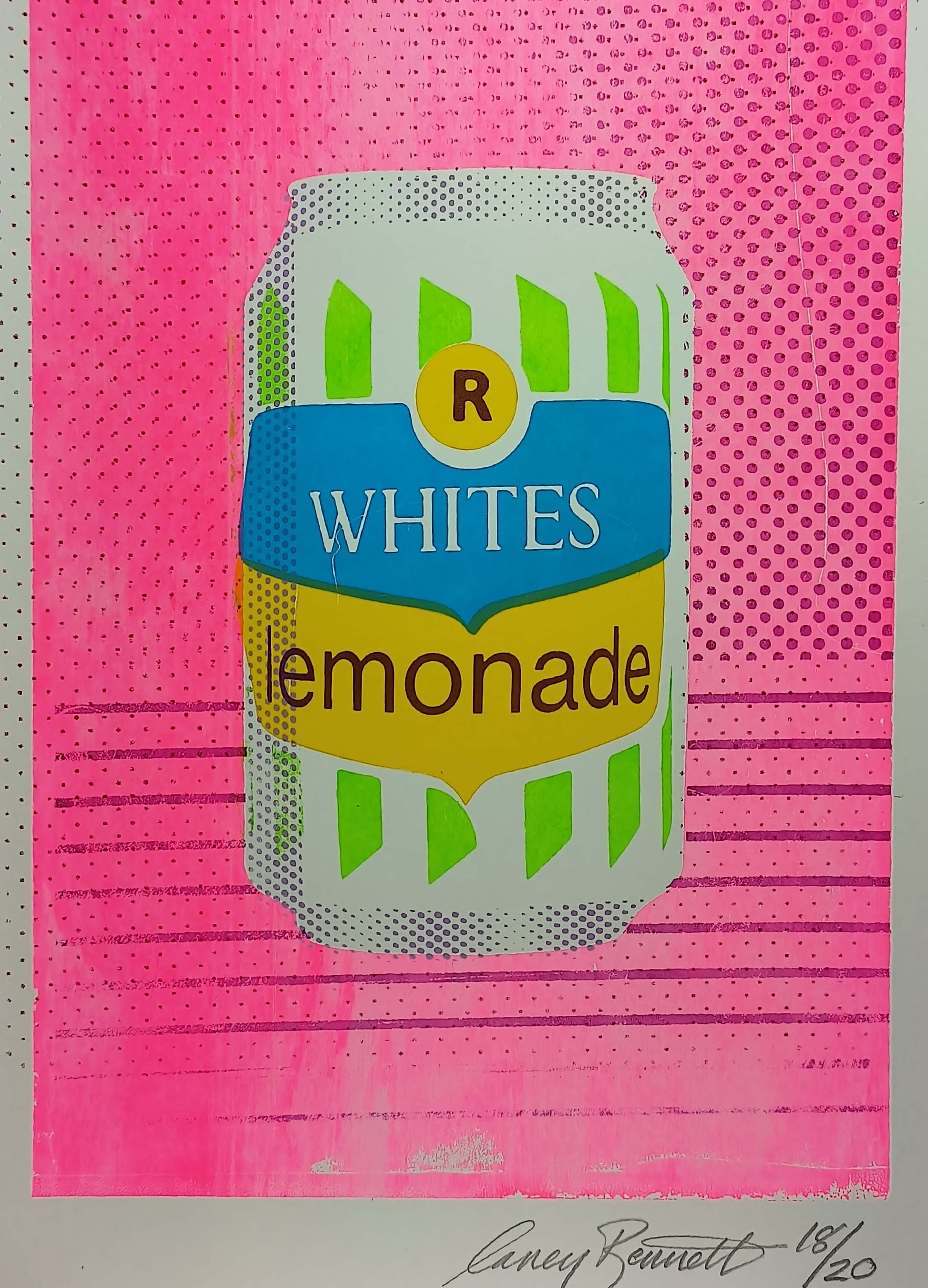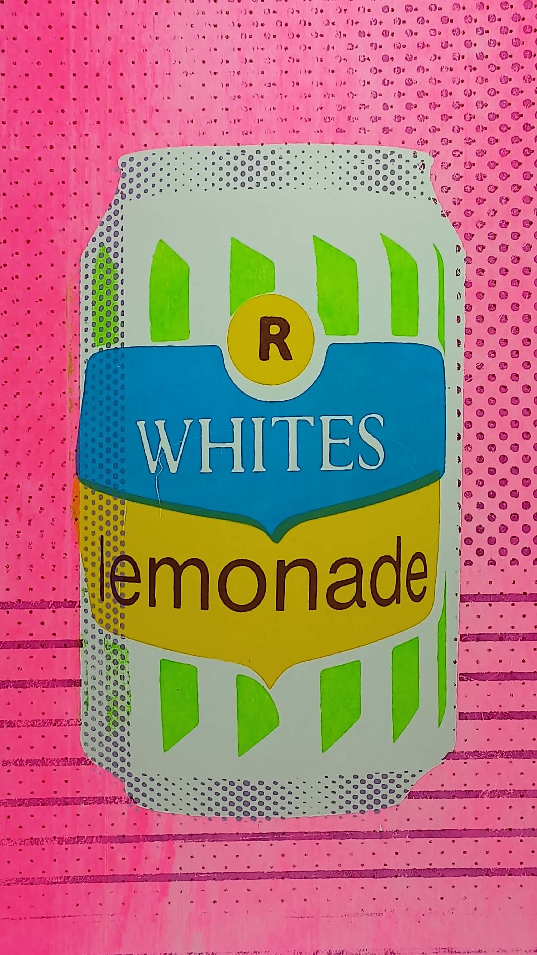 Are you a secret lemonade drinker? This collection of A4 multi-layered screen prints presents a captivating revival of a retro can of R White's lemonade. Deliberately imperfect to represent the uncertain nature of memory. Its vibrant fluorescent palette gives a sense of nostalgia. The offset typography adds a quirky charm. These prints merge vintage aesthetics with contemporary artistry, evoking a delightful sense of timelessness. The brand is significant to me as it was a special treat when I was a child. Especially, when mixed with the Advocaat at Christmas!