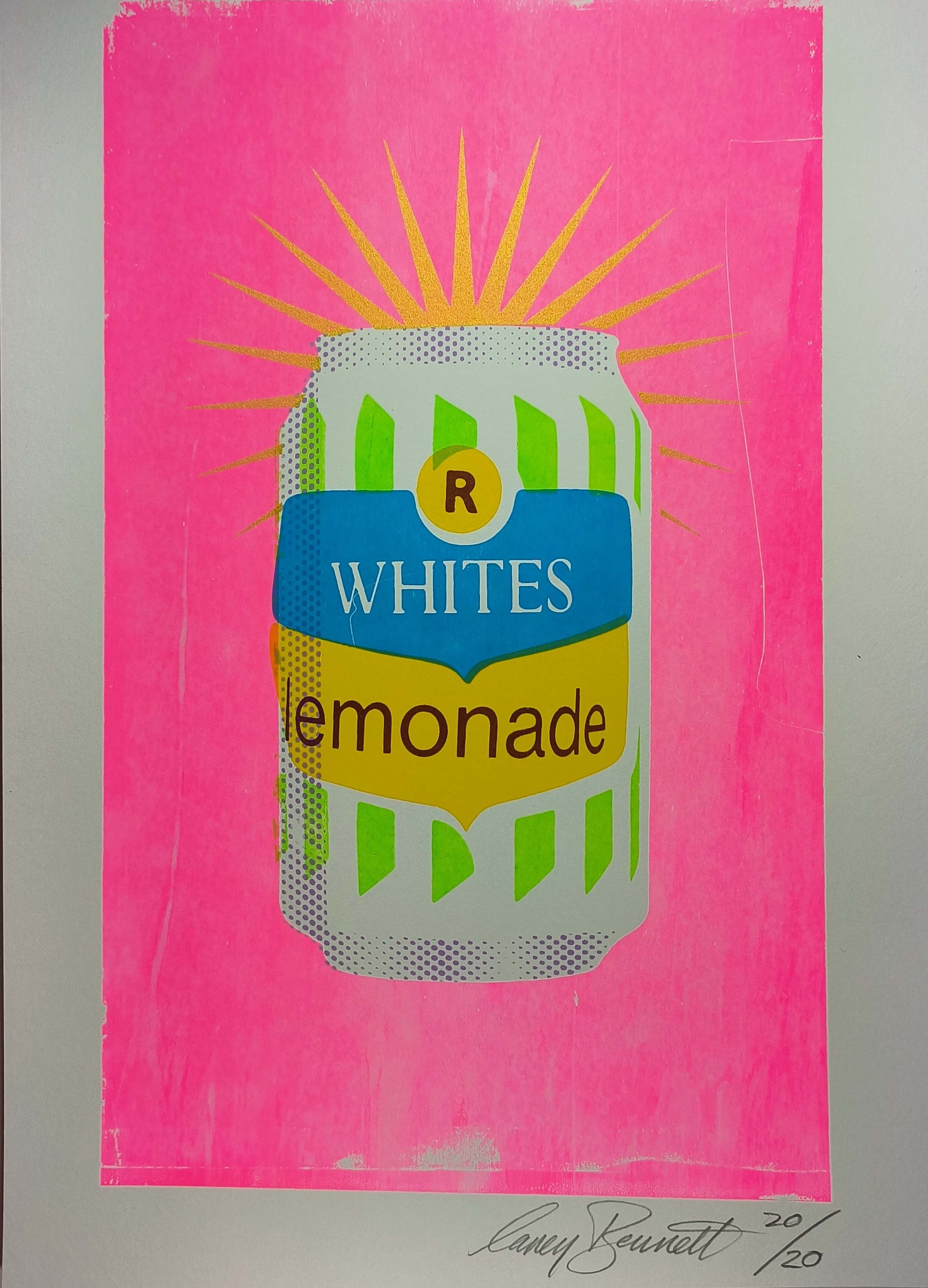 Are you a secret lemonade drinker? This collection of A4 multi-layered screen prints presents a captivating revival of a retro can of R White's lemonade. Deliberately imperfect to represent the uncertain nature of memory. Its vibrant fluorescent palette gives a sense of nostalgia. The offset typography adds a quirky charm. These prints merge vintage aesthetics with contemporary artistry, evoking a delightful sense of timelessness. The brand is significant to me as it was a special treat when I was a child. Especially, when mixed with the Advocaat at Christmas!