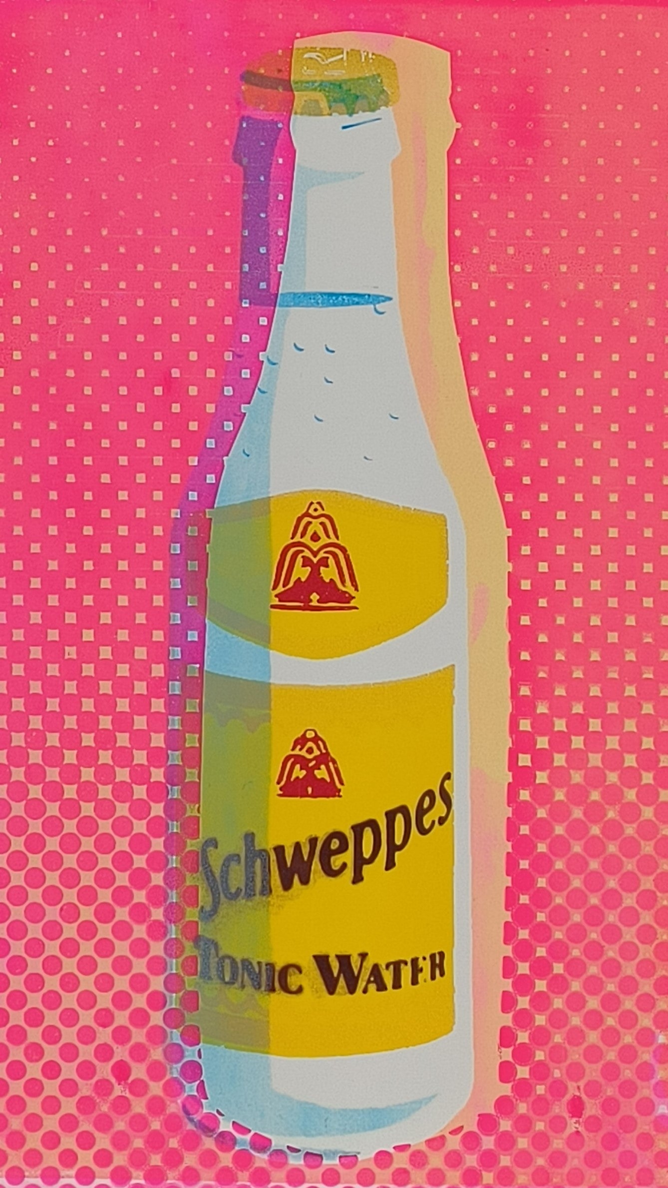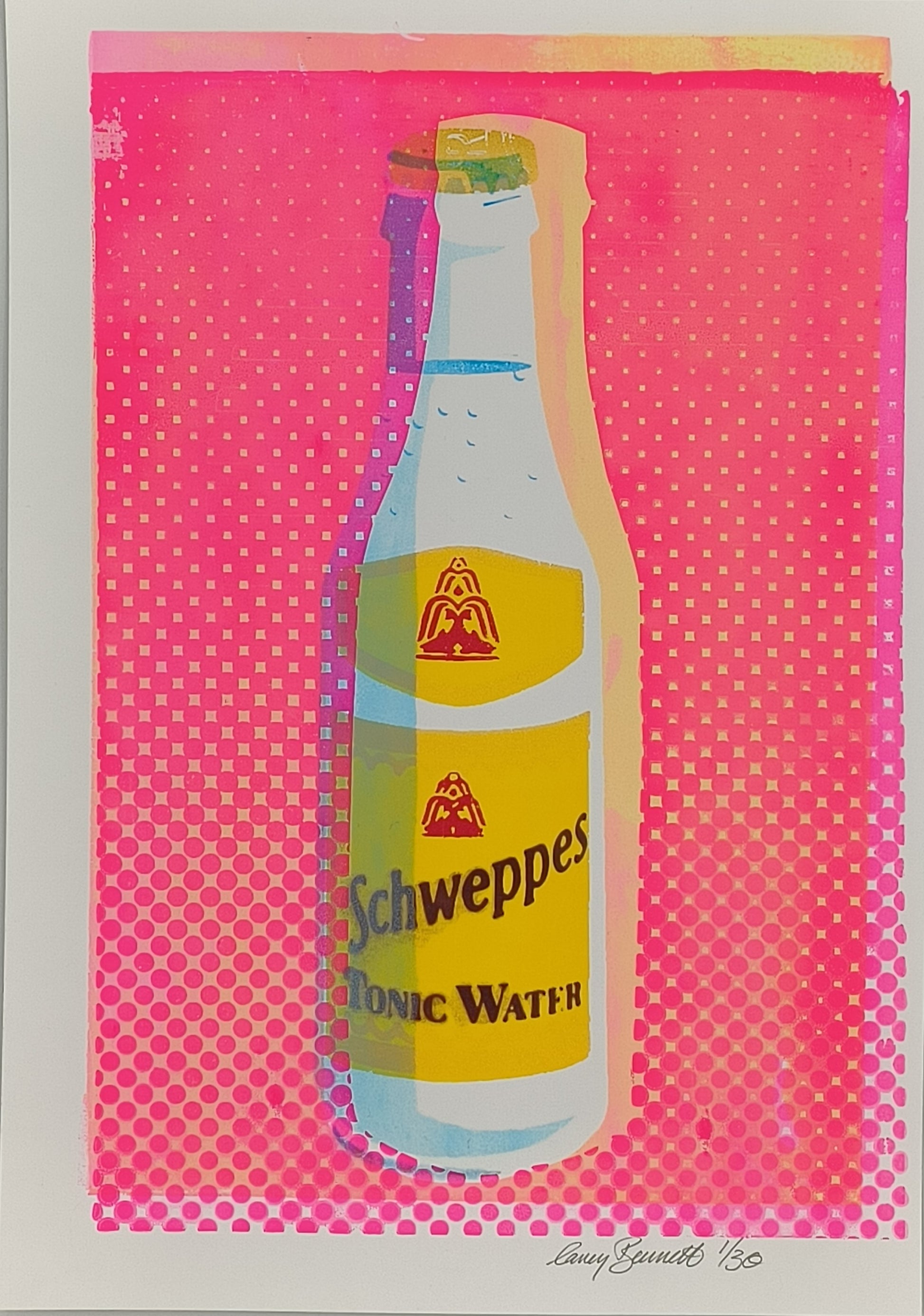 This series of multi-layered A4 screen-prints represent the quintessential mixer. There are currently all sorts of options for tonic water but back in the day ,this was it. It not only tasted very nice, but if there was an unexpected outbreak of Malaria in N.W. London, this had you covered. In addition, if you had the measures of gin my Dad poured, Malaria would not be foremost in your mind. Needless to say, this print works well alongside the Gordon's Gin print.