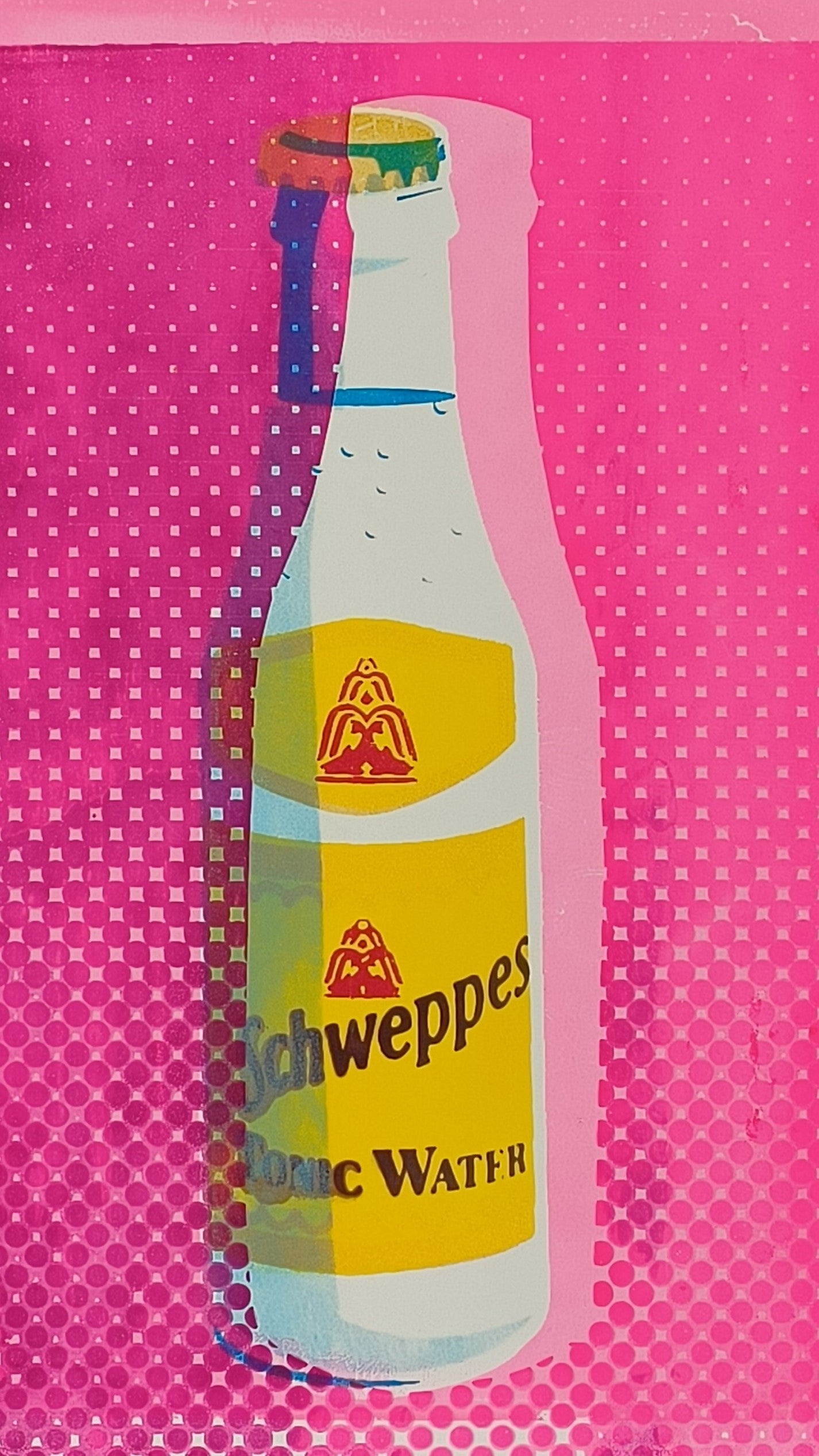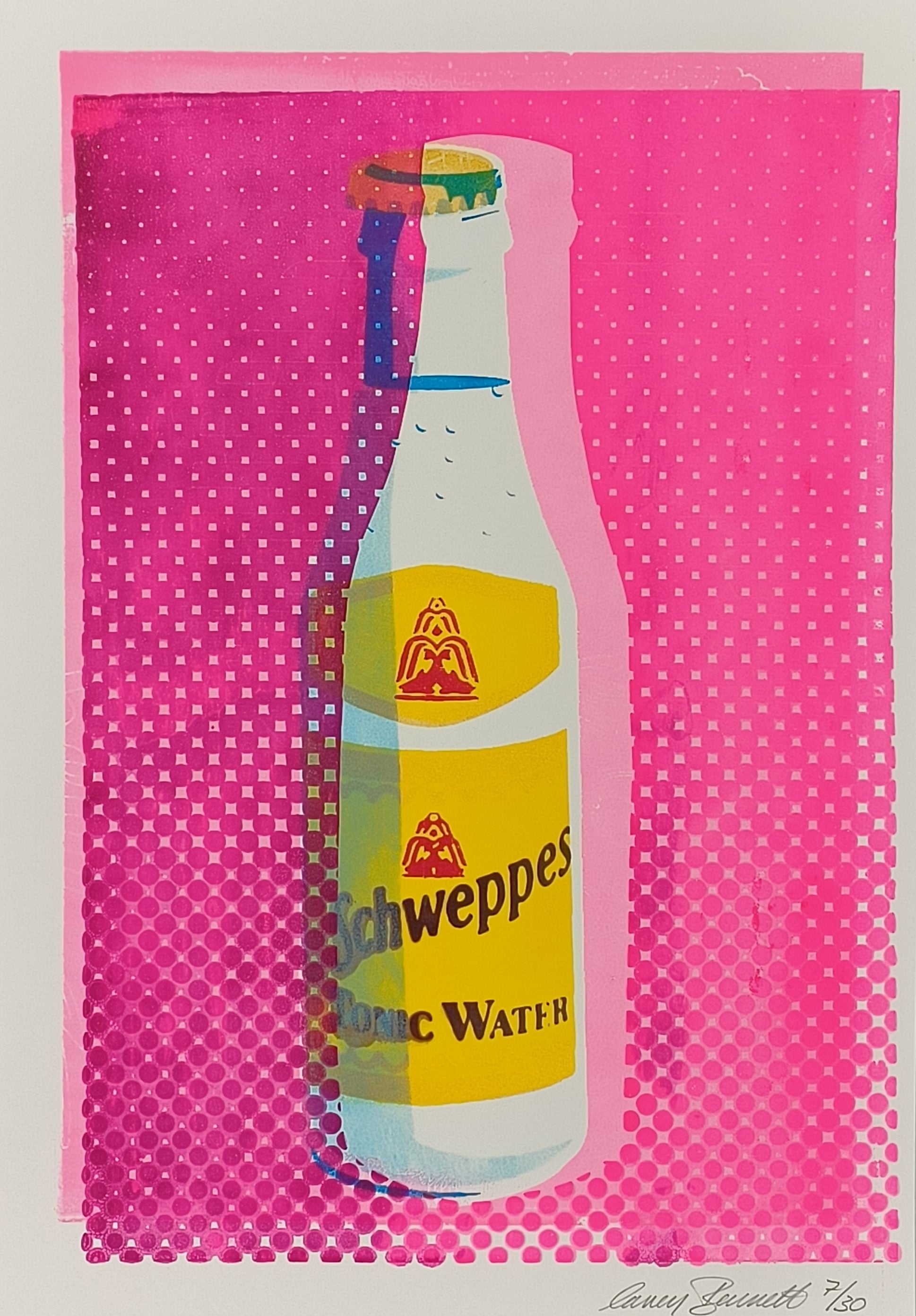 This series of multi-layered A4 screen-prints represent the quintessential mixer. There are currently all sorts of options for tonic water but back in the day ,this was it. It not only tasted very nice, but if there was an unexpected outbreak of Malaria in N.W. London, this had you covered. In addition, if you had the measures of gin my Dad poured, Malaria would not be foremost in your mind. Needless to say, this print works well alongside the Gordon's Gin print.