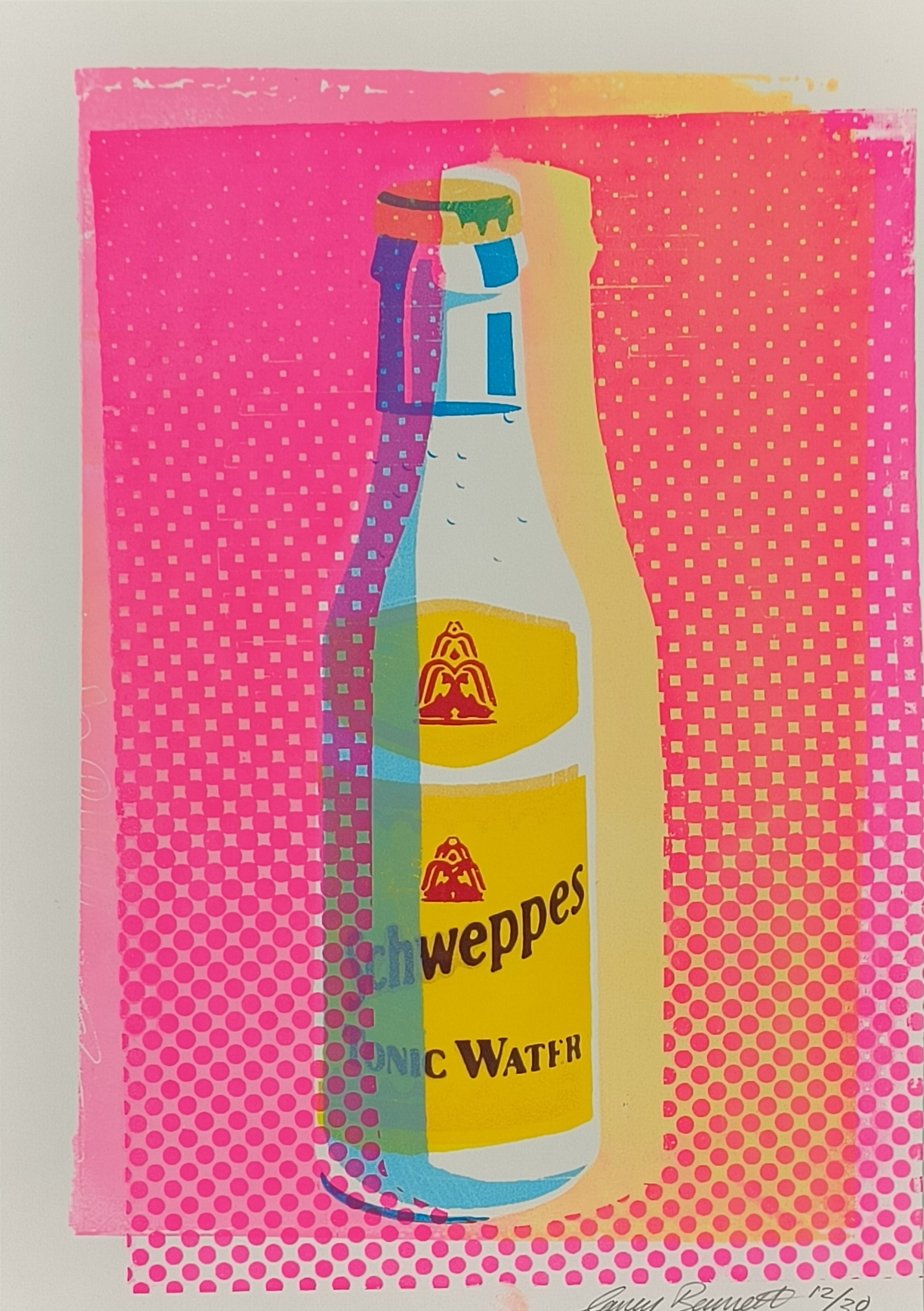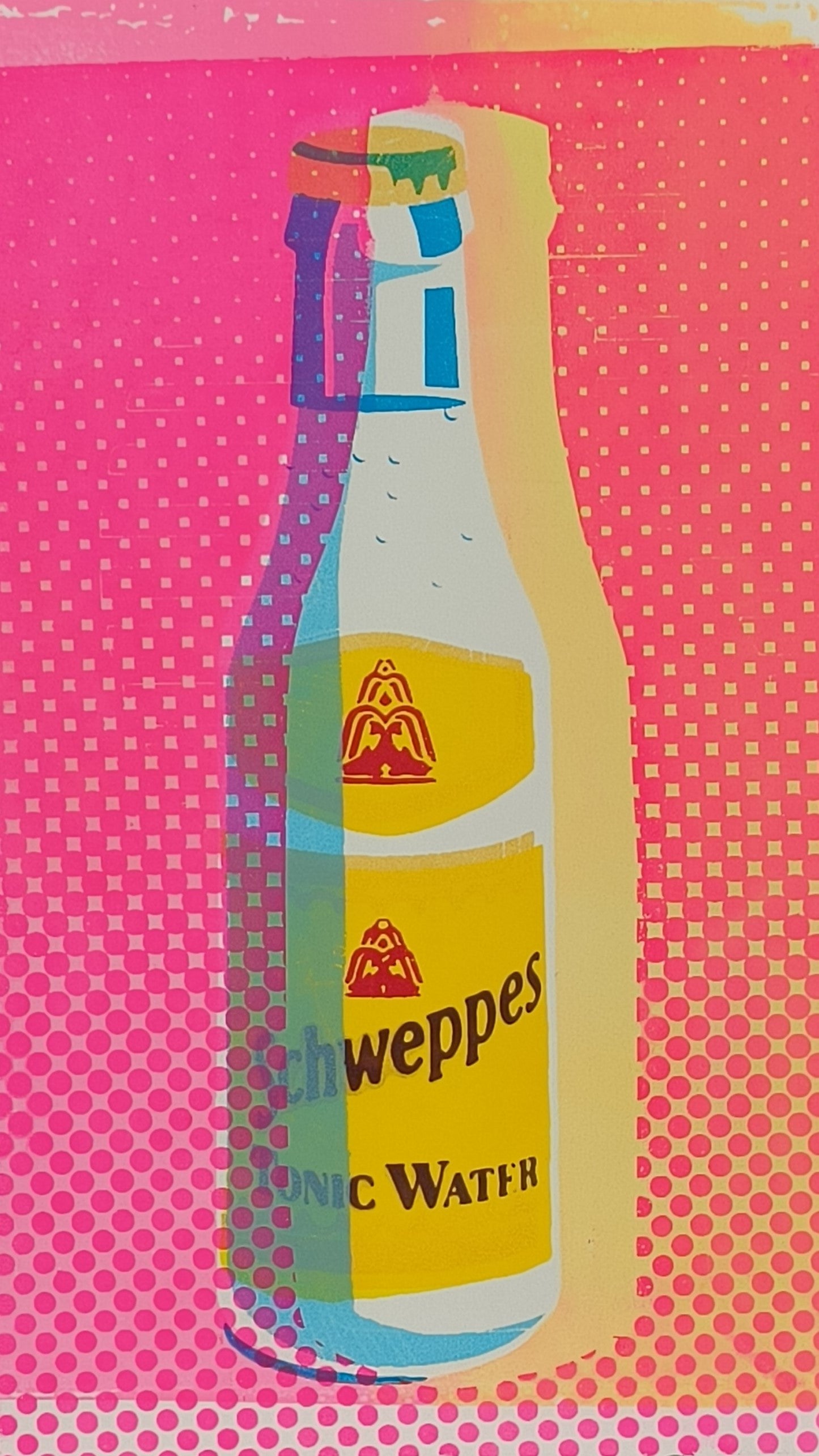 This series of multi-layered A4 screen-prints represent the quintessential mixer. There are currently all sorts of options for tonic water but back in the day ,this was it. It not only tasted very nice, but if there was an unexpected outbreak of Malaria in N.W. London, this had you covered. In addition, if you had the measures of gin my Dad poured, Malaria would not be foremost in your mind. Needless to say, this print works well alongside the Gordon's Gin print.