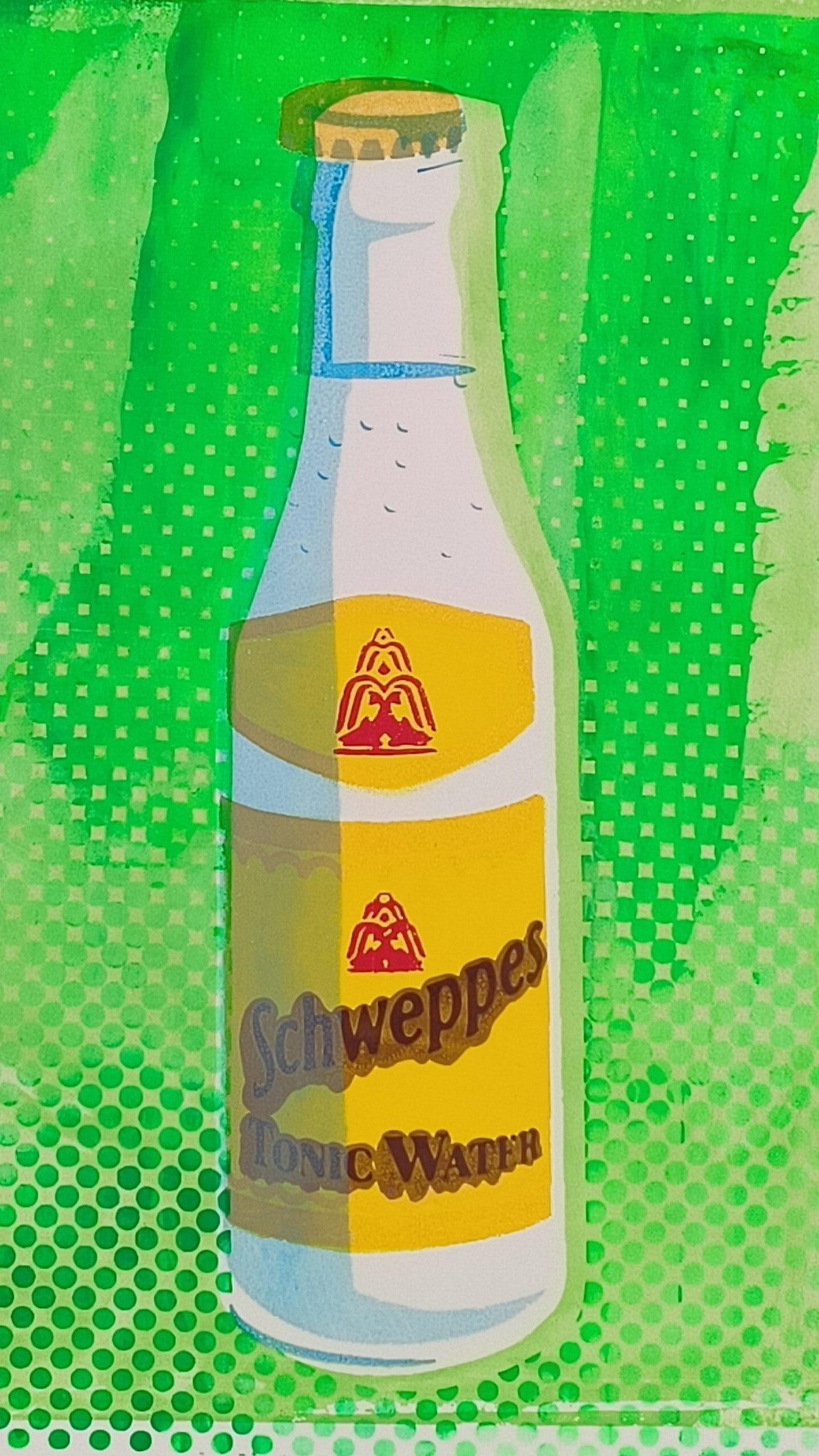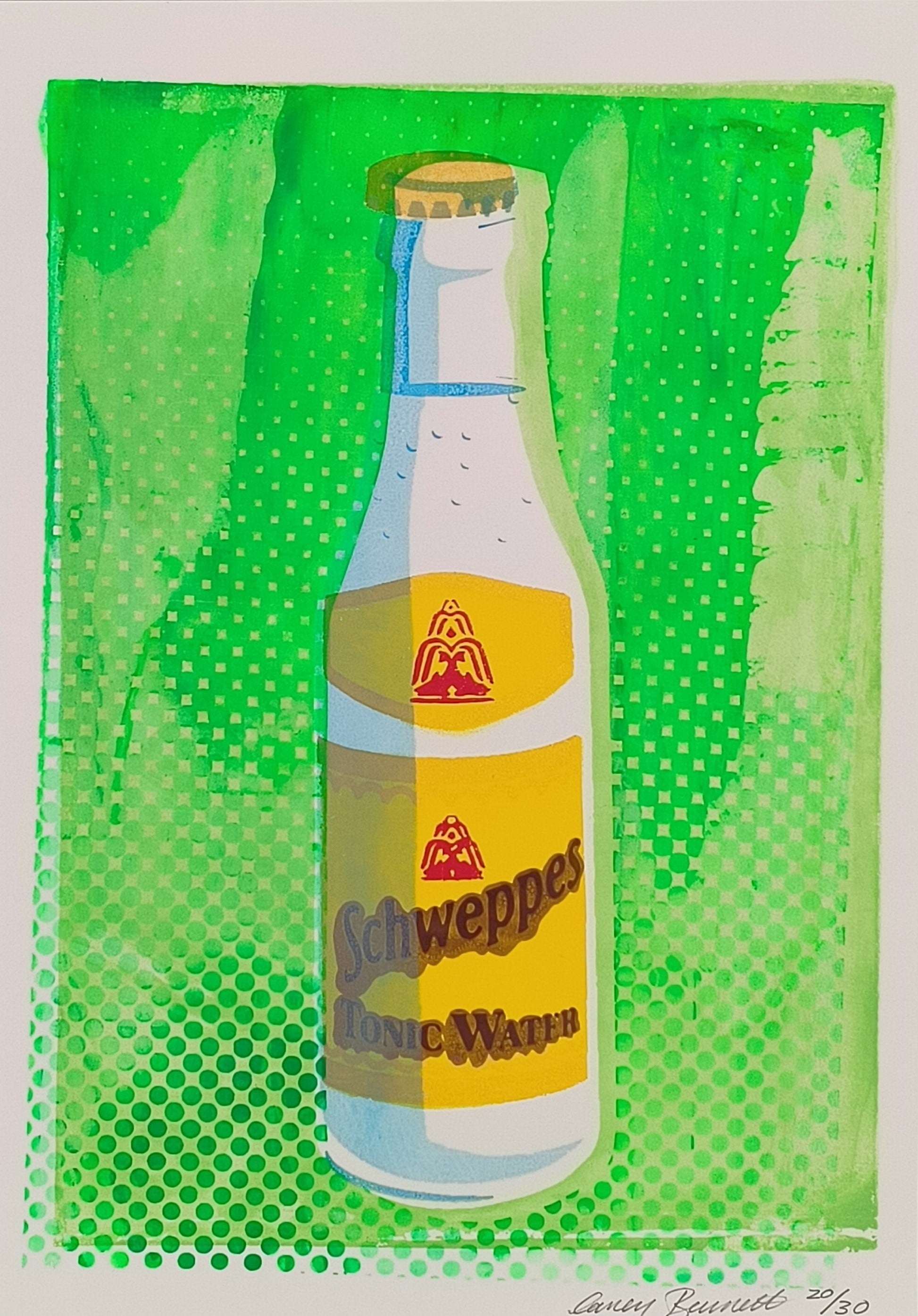 This series of multi-layered A4 screen-prints represent the quintessential mixer. There are currently all sorts of options for tonic water but back in the day ,this was it. It not only tasted very nice, but if there was an unexpected outbreak of Malaria in N.W. London, this had you covered. In addition, if you had the measures of gin my Dad poured, Malaria would not be foremost in your mind. Needless to say, this print works well alongside the Gordon's Gin print.
