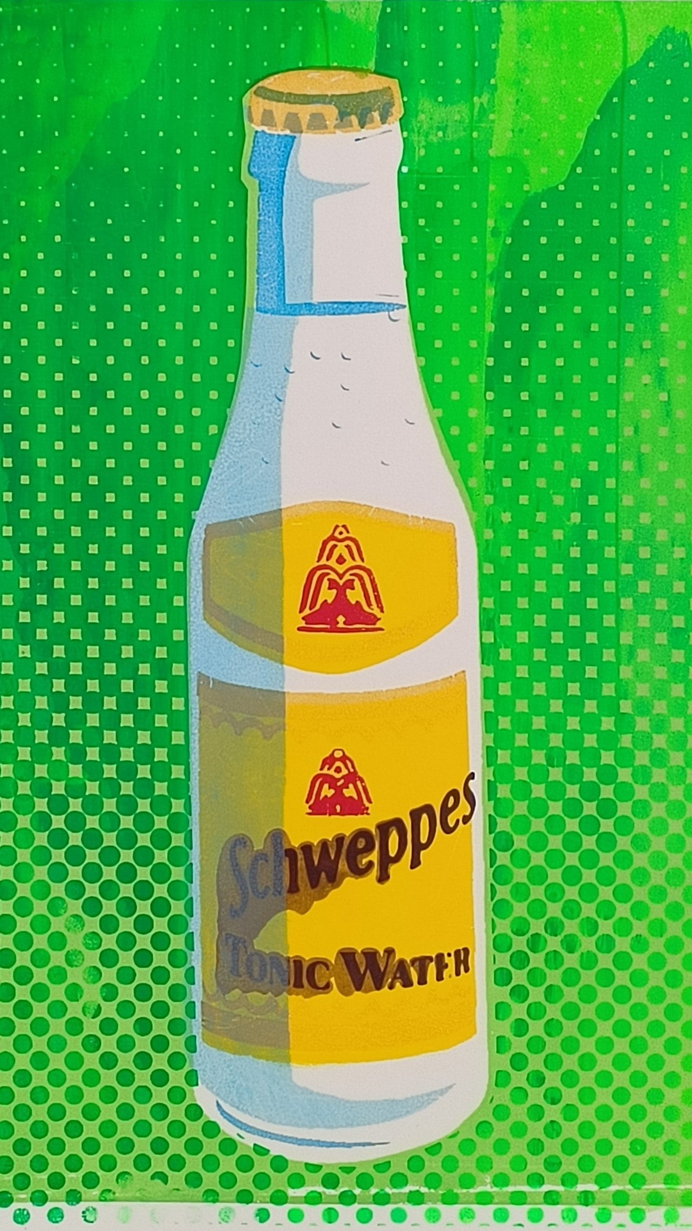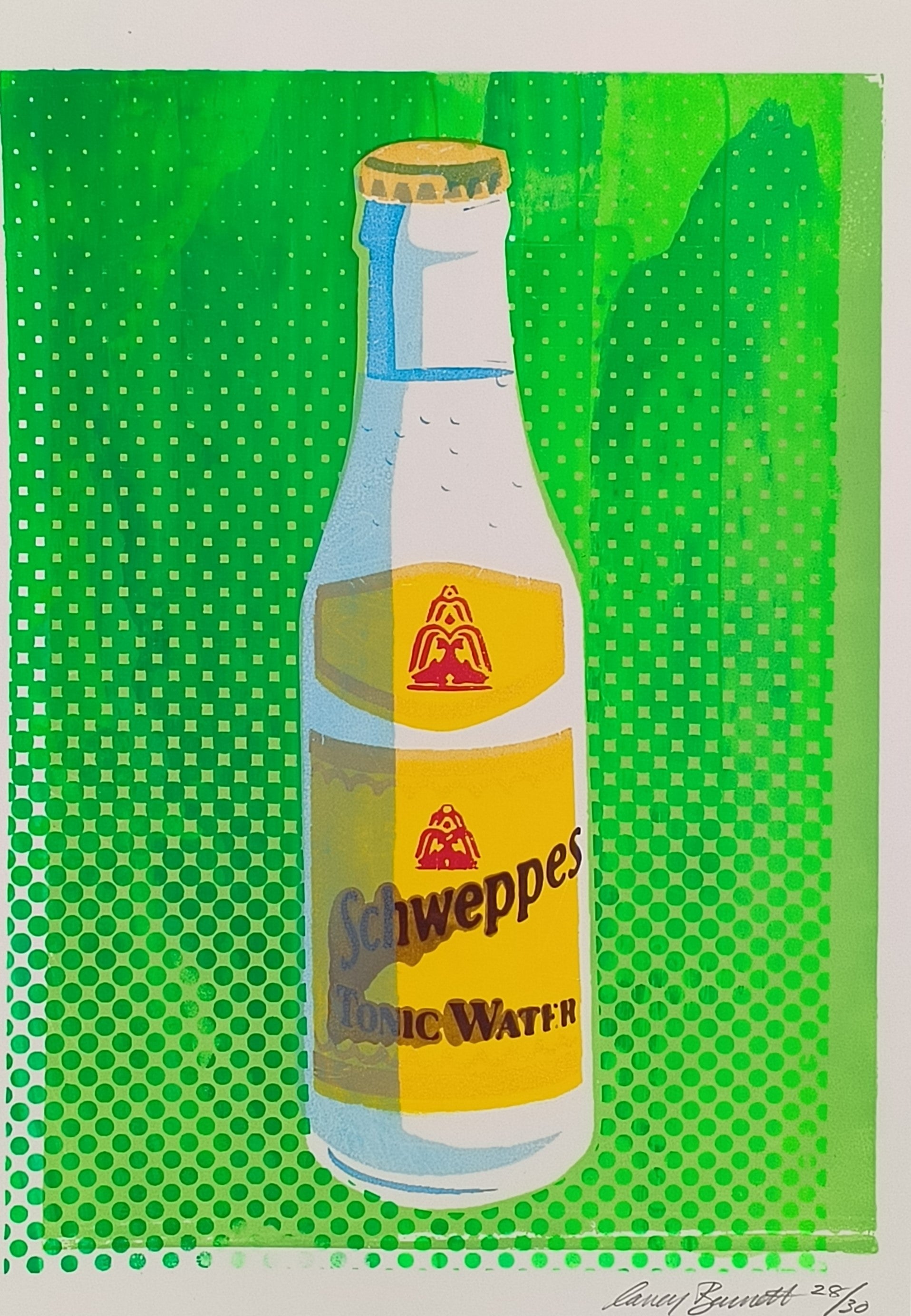 This series of multi-layered A4 screen-prints represent the quintessential mixer. There are currently all sorts of options for tonic water but back in the day ,this was it. It not only tasted very nice, but if there was an unexpected outbreak of Malaria in N.W. London, this had you covered. In addition, if you had the measures of gin my Dad poured, Malaria would not be foremost in your mind. Needless to say, this print works well alongside the Gordon's Gin print.