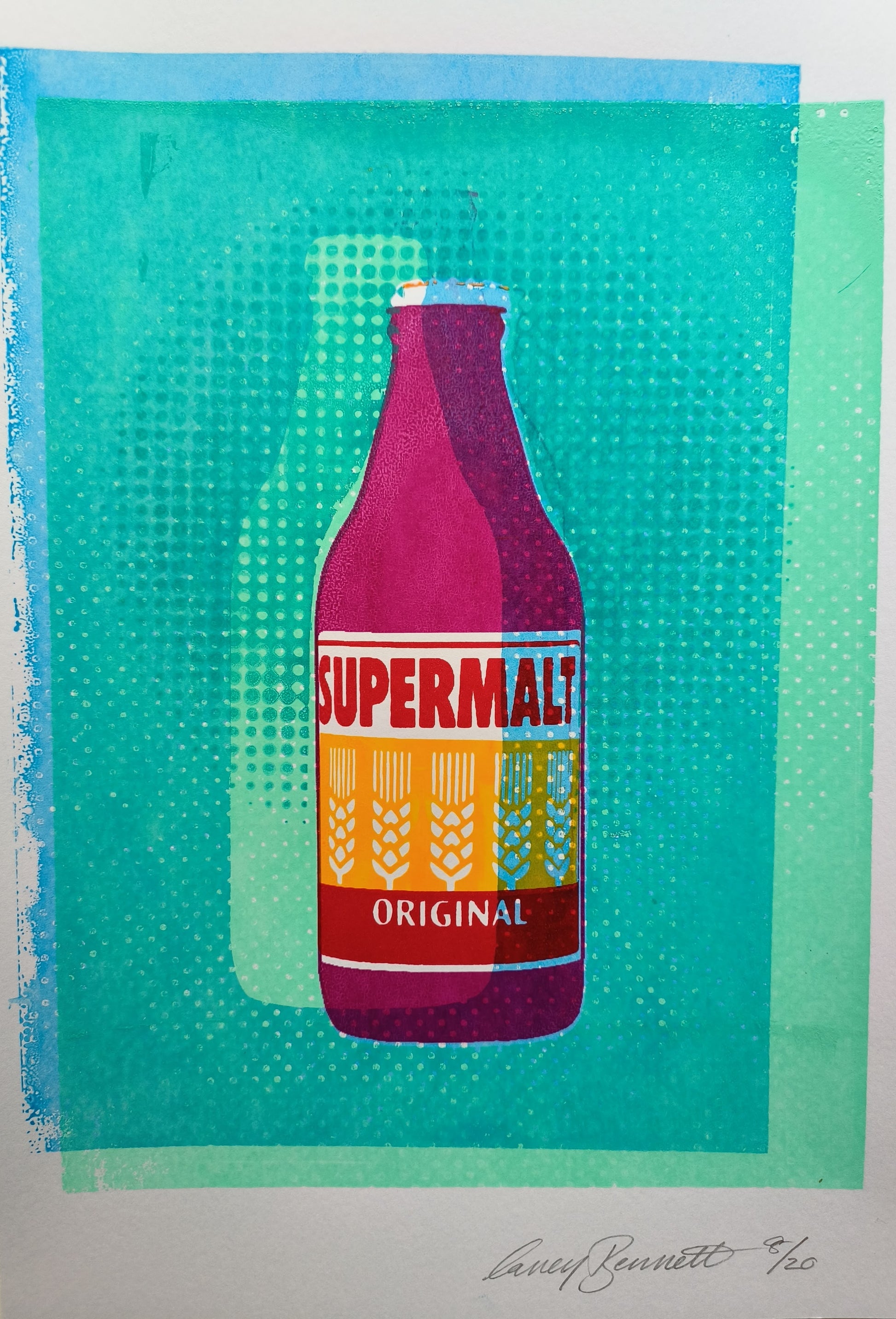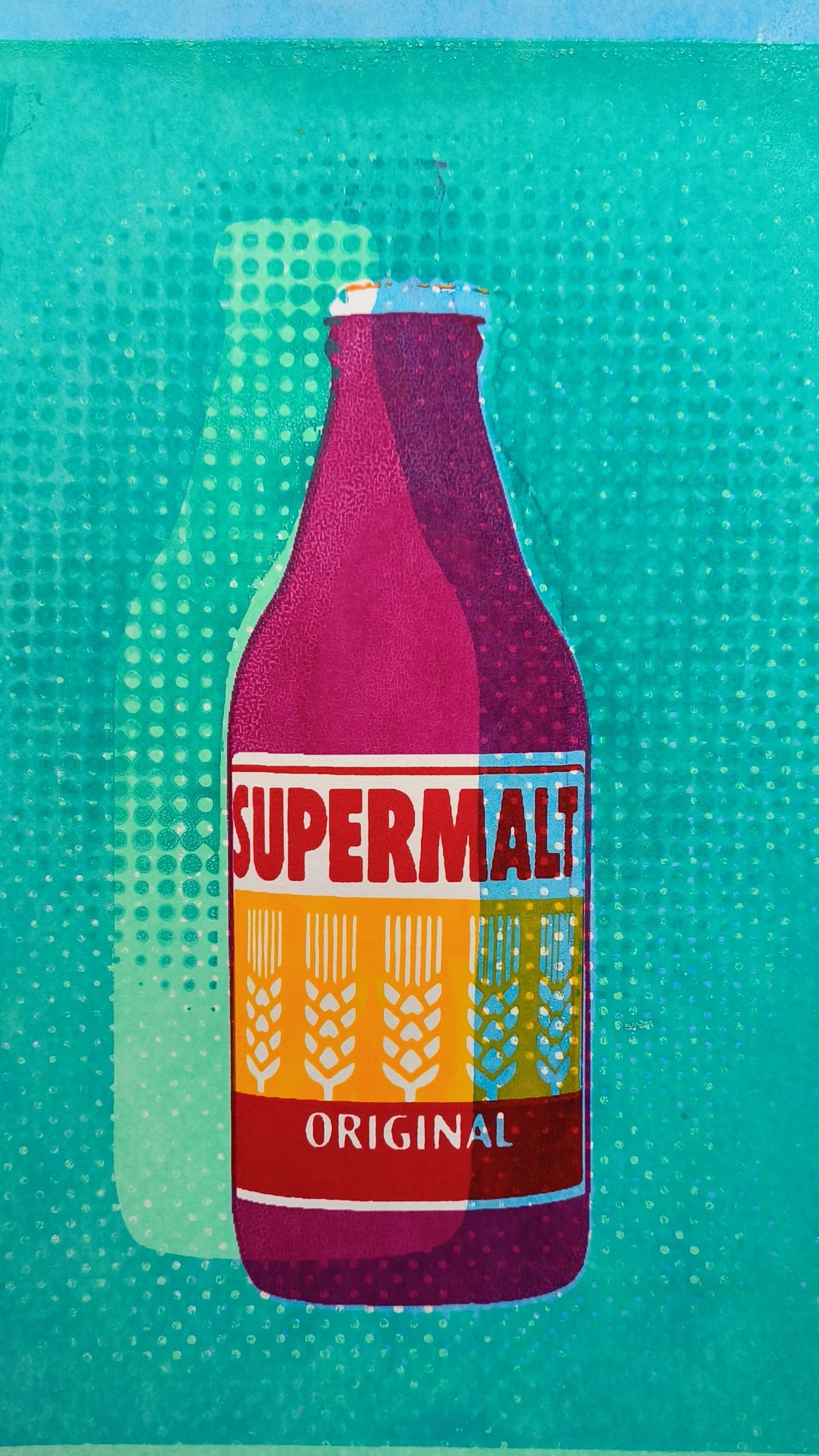This A4 multi layered screenprint celebrates the iconic Supermalt bottle, a drink with a rich history dating back to its inception for the Nigerian army in 1972. The print seamlessly blends vibrant overlapping colors, conveying dynamism and strength, reminiscent of the drink's origins. Retro halftones pay homage to its vintage heritage, invoking a sense of nostalgia. The inclusion of quirky offset typography adds a playful touch, mirroring the drink's unique character. With its layered design, this print captures the essence of vigor and history, making it an ideal gift for the bodybuilder in your life, encapsulating their dedication and celebrating Supermalt's legacy.