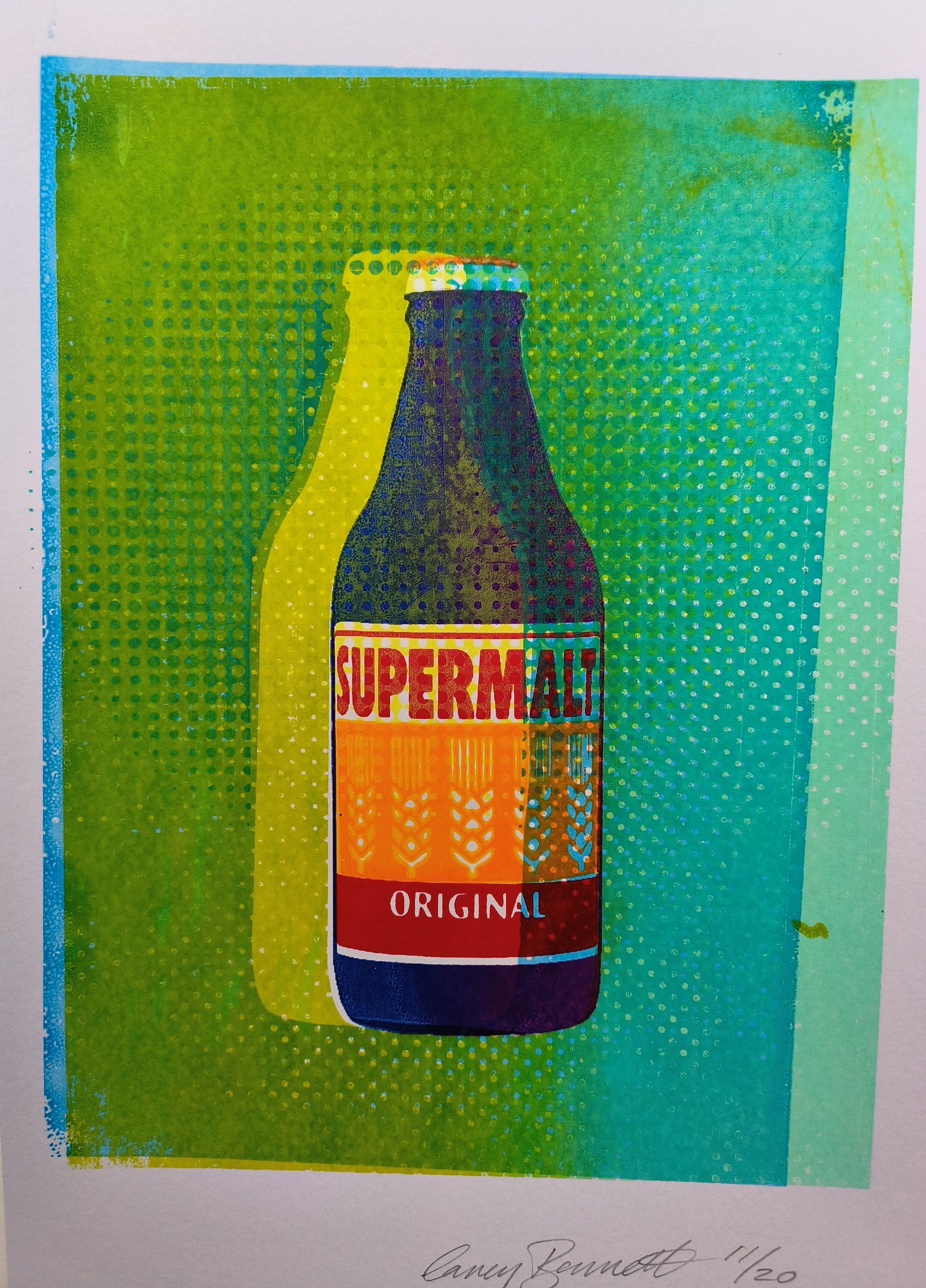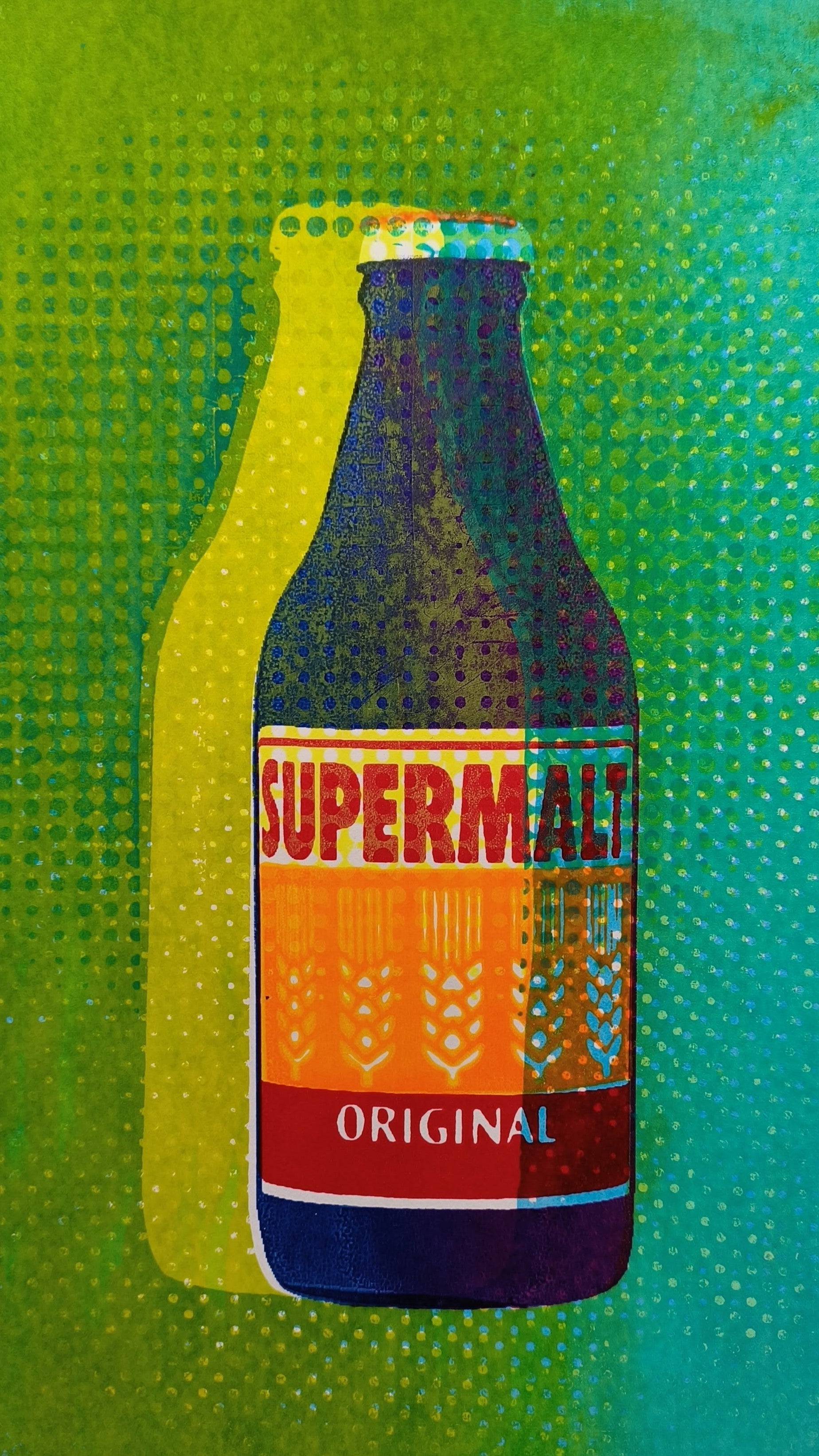 This A4 multi layered screenprint celebrates the iconic Supermalt bottle, a drink with a rich history dating back to its inception for the Nigerian army in 1972. The print seamlessly blends vibrant overlapping colors, conveying dynamism and strength, reminiscent of the drink's origins. Retro halftones pay homage to its vintage heritage, invoking a sense of nostalgia. The inclusion of quirky offset typography adds a playful touch, mirroring the drink's unique character. With its layered design, this print captures the essence of vigor and history, making it an ideal gift for the bodybuilder in your life, encapsulating their dedication and celebrating Supermalt's legacy.