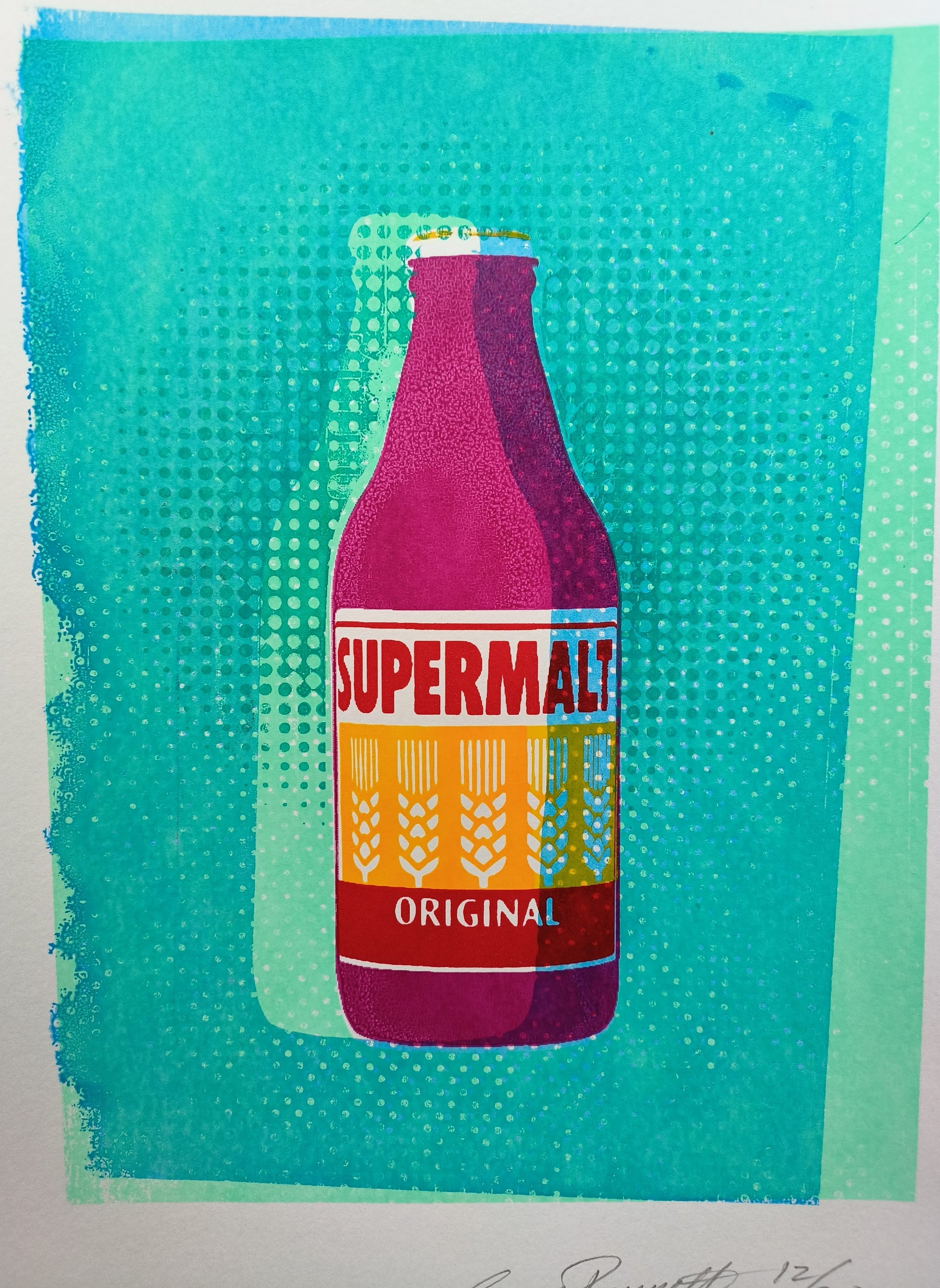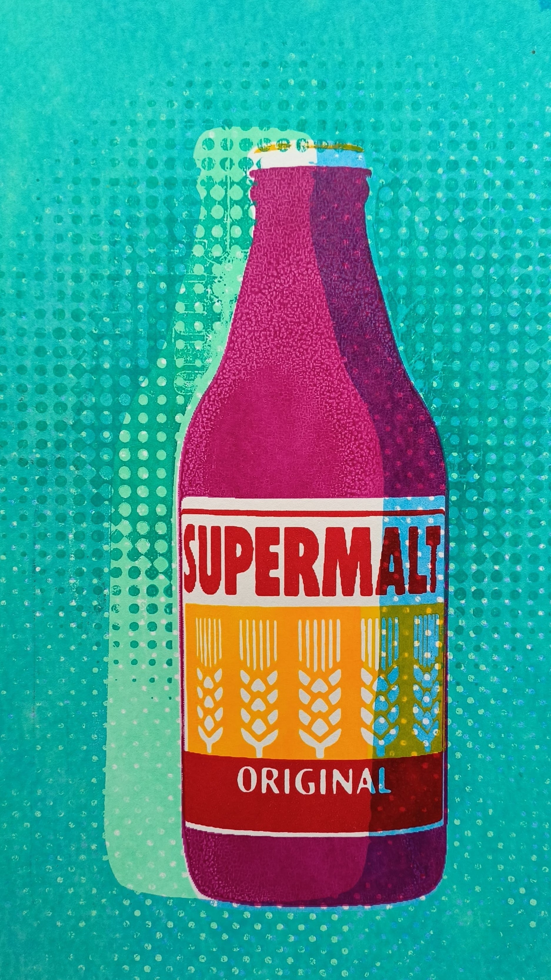 This A4 multi layered screenprint celebrates the iconic Supermalt bottle, a drink with a rich history dating back to its inception for the Nigerian army in 1972. The print seamlessly blends vibrant overlapping colors, conveying dynamism and strength, reminiscent of the drink's origins. Retro halftones pay homage to its vintage heritage, invoking a sense of nostalgia. The inclusion of quirky offset typography adds a playful touch, mirroring the drink's unique character. With its layered design, this print captures the essence of vigor and history, making it an ideal gift for the bodybuilder in your life, encapsulating their dedication and celebrating Supermalt's legacy.