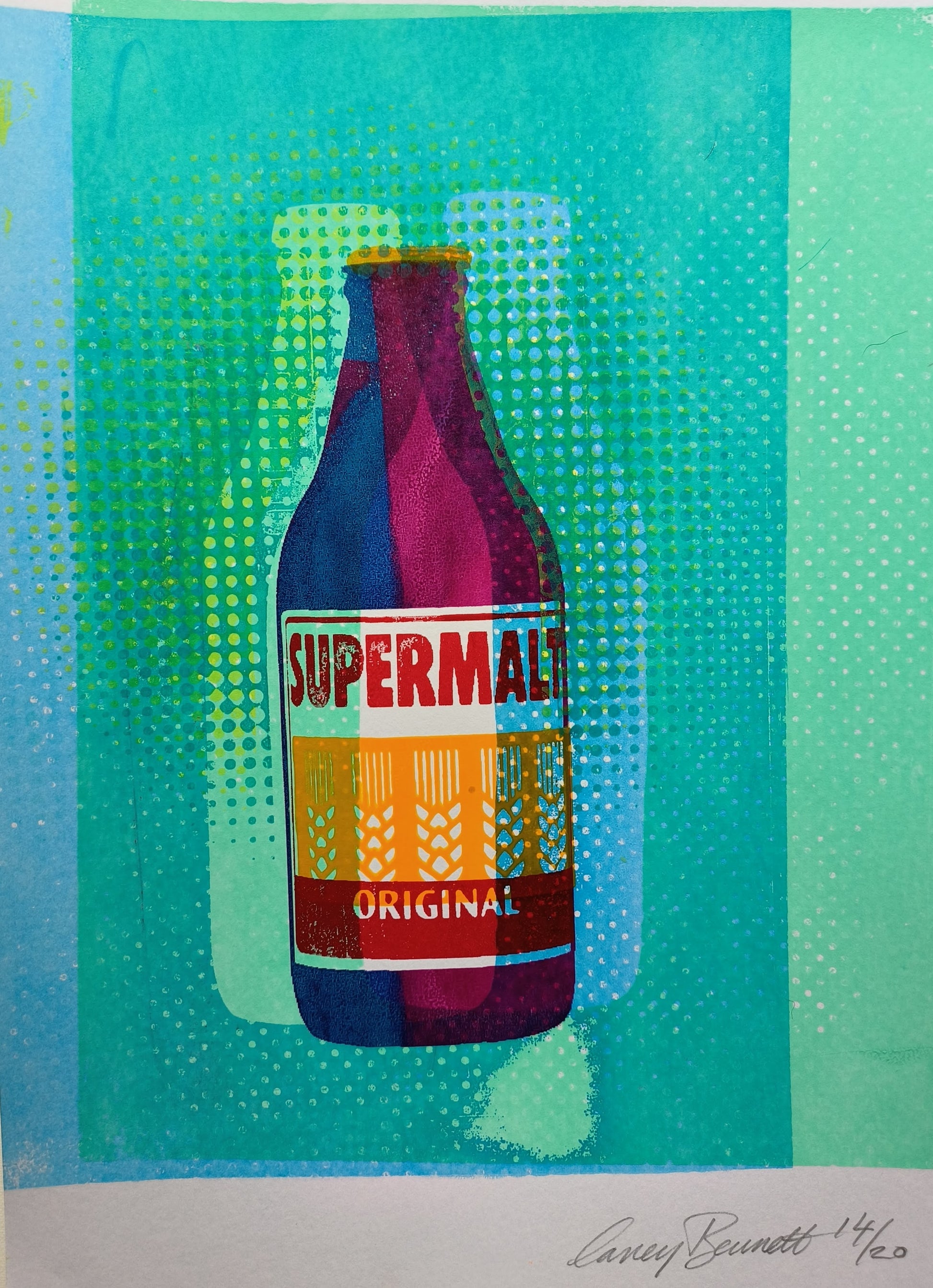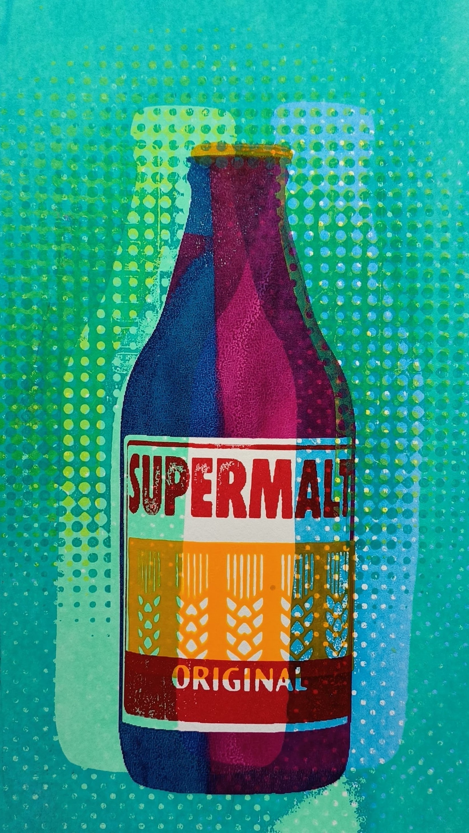 This A4 multi layered screenprint celebrates the iconic Supermalt bottle, a drink with a rich history dating back to its inception for the Nigerian army in 1972. The print seamlessly blends vibrant overlapping colors, conveying dynamism and strength, reminiscent of the drink's origins. Retro halftones pay homage to its vintage heritage, invoking a sense of nostalgia. The inclusion of quirky offset typography adds a playful touch, mirroring the drink's unique character. With its layered design, this print captures the essence of vigor and history, making it an ideal gift for the bodybuilder in your life, encapsulating their dedication and celebrating Supermalt's legacy.