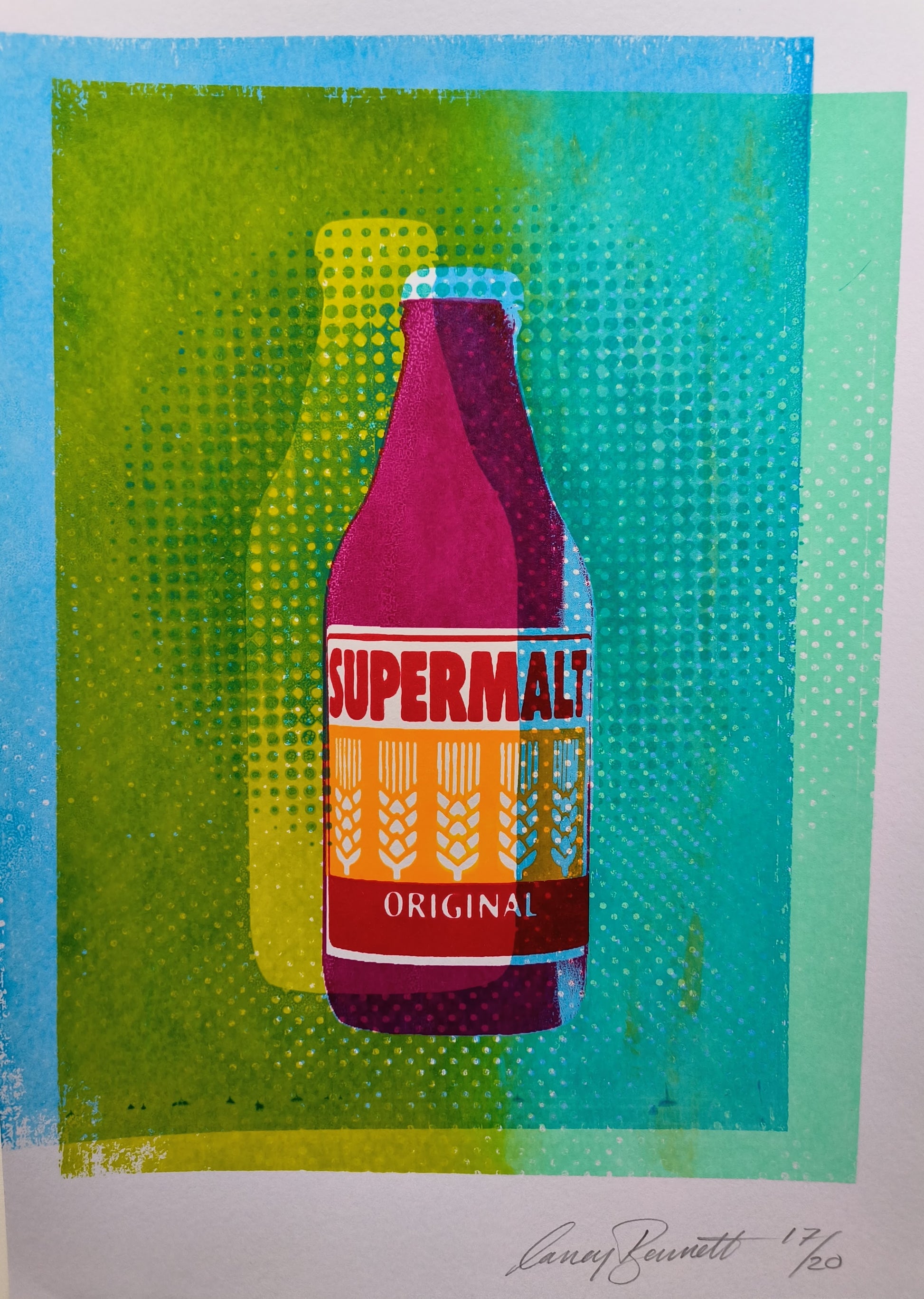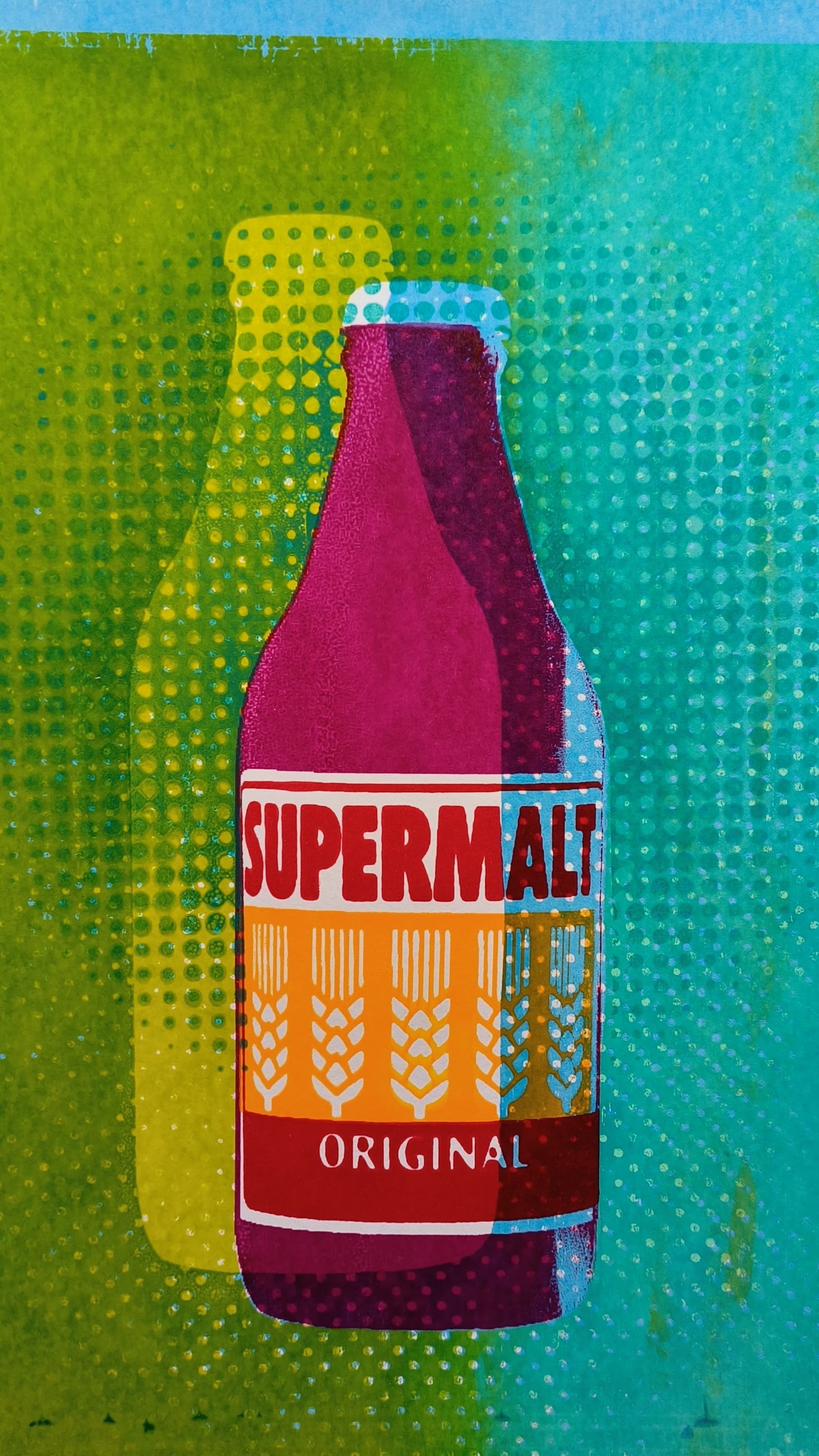 This A4 multi layered screenprint celebrates the iconic Supermalt bottle, a drink with a rich history dating back to its inception for the Nigerian army in 1972. The print seamlessly blends vibrant overlapping colors, conveying dynamism and strength, reminiscent of the drink's origins. Retro halftones pay homage to its vintage heritage, invoking a sense of nostalgia. The inclusion of quirky offset typography adds a playful touch, mirroring the drink's unique character. With its layered design, this print captures the essence of vigor and history, making it an ideal gift for the bodybuilder in your life, encapsulating their dedication and celebrating Supermalt's legacy.