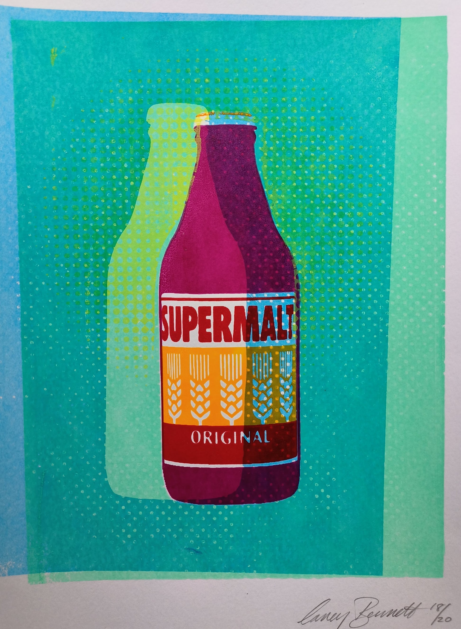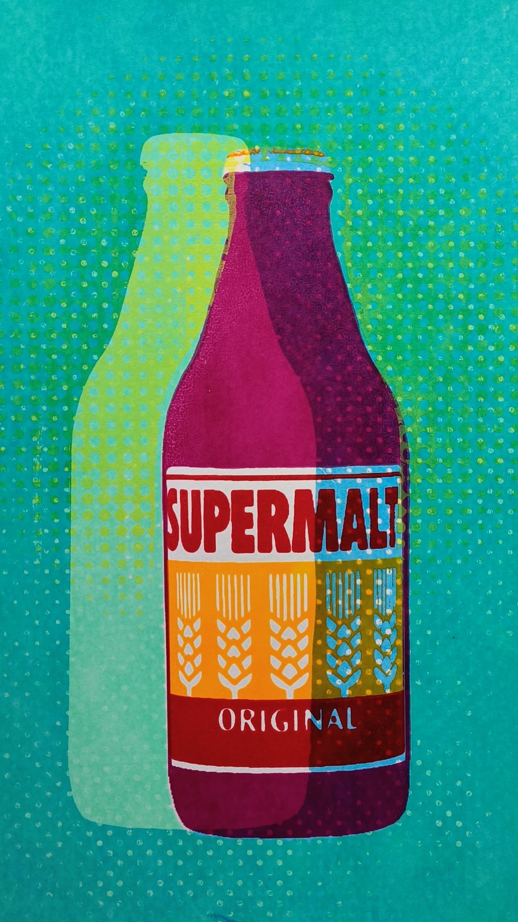 This A4 multi layered screen-print celebrates the iconic Supermalt bottle, a drink with a rich history dating back to its inception for the Nigerian army in 1972. The print seamlessly blends vibrant overlapping colours, conveying dynamism and strength, reminiscent of the drink's origins. Retro halftones pay homage to its vintage heritage, invoking a sense of nostalgia. The inclusion of quirky offset typography adds a playful touch, mirroring the drink's unique character. With its layered design, this print captures the essence of vigour and history, making it an ideal gift for the bodybuilder in your life, encapsulating their dedication and celebrating Supermalt's legacy.