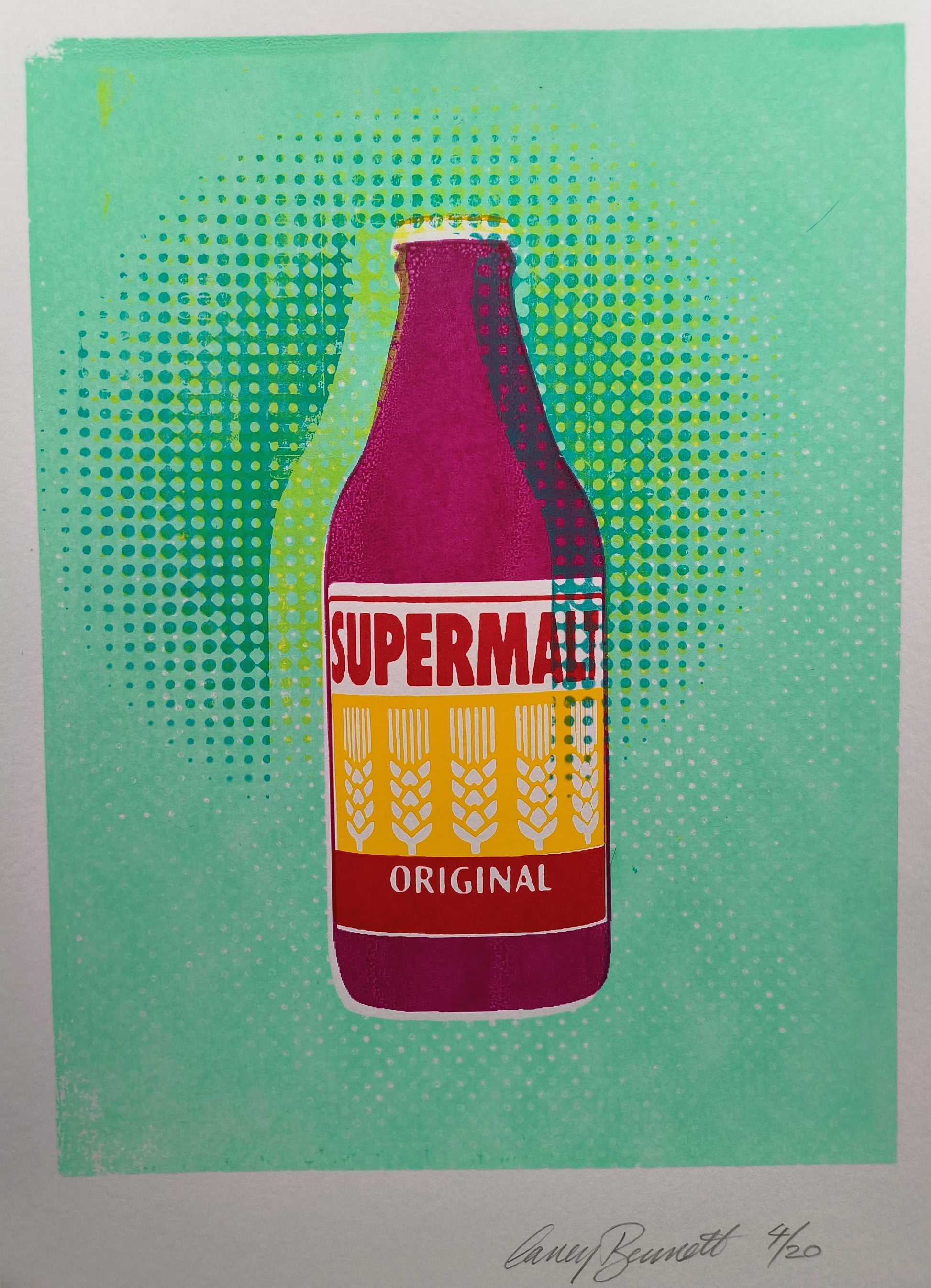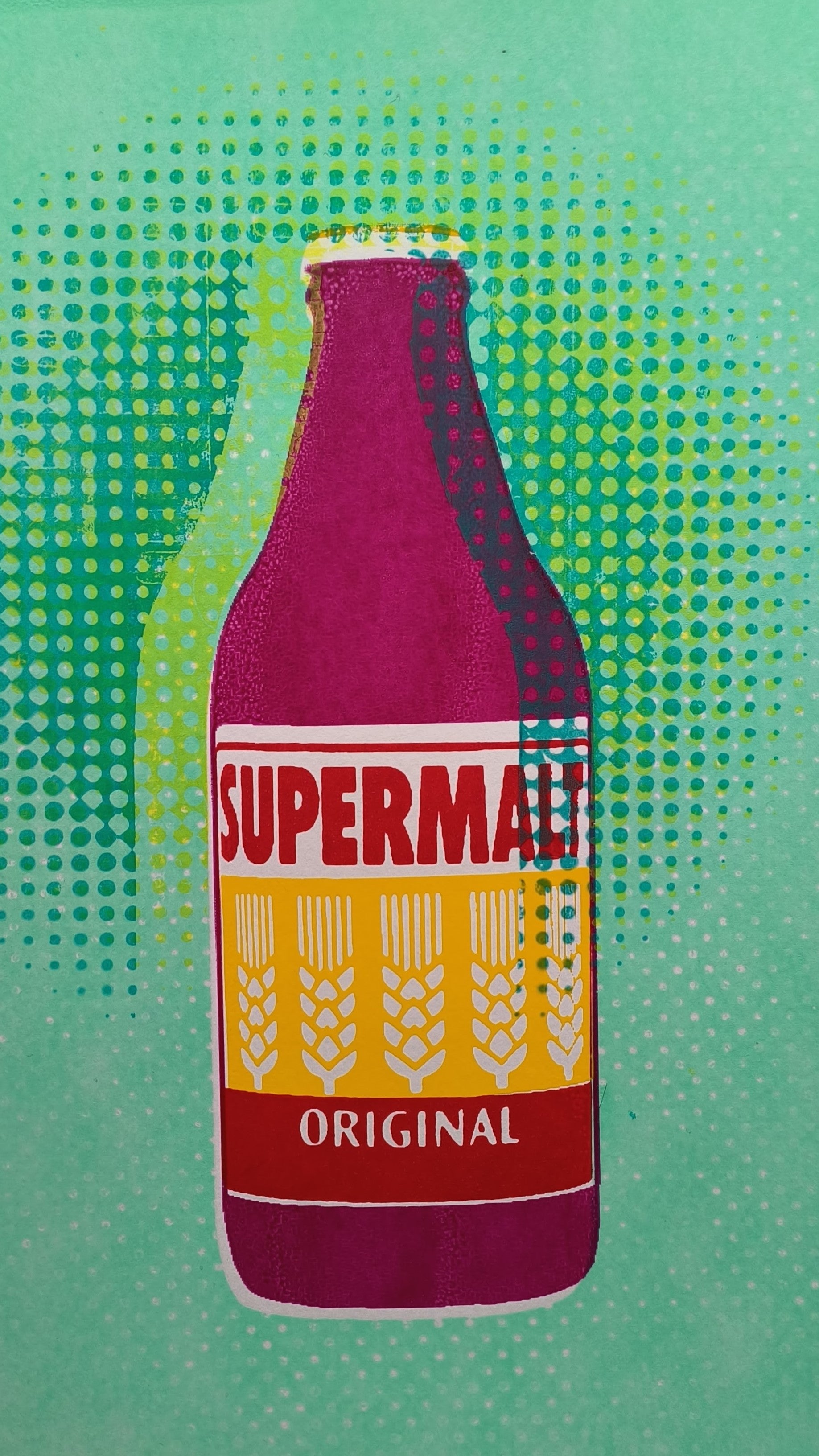 This A4 multi layered screenprint celebrates the iconic Supermalt bottle, a drink with a rich history dating back to its inception for the Nigerian army in 1972. The print seamlessly blends vibrant overlapping colors, conveying dynamism and strength, reminiscent of the drink's origins. Retro halftones pay homage to its vintage heritage, invoking a sense of nostalgia. The inclusion of quirky offset typography adds a playful touch, mirroring the drink's unique character. With its layered design, this print captures the essence of vigor and history, making it an ideal gift for the bodybuilder in your life, encapsulating their dedication and celebrating Supermalt's legacy.