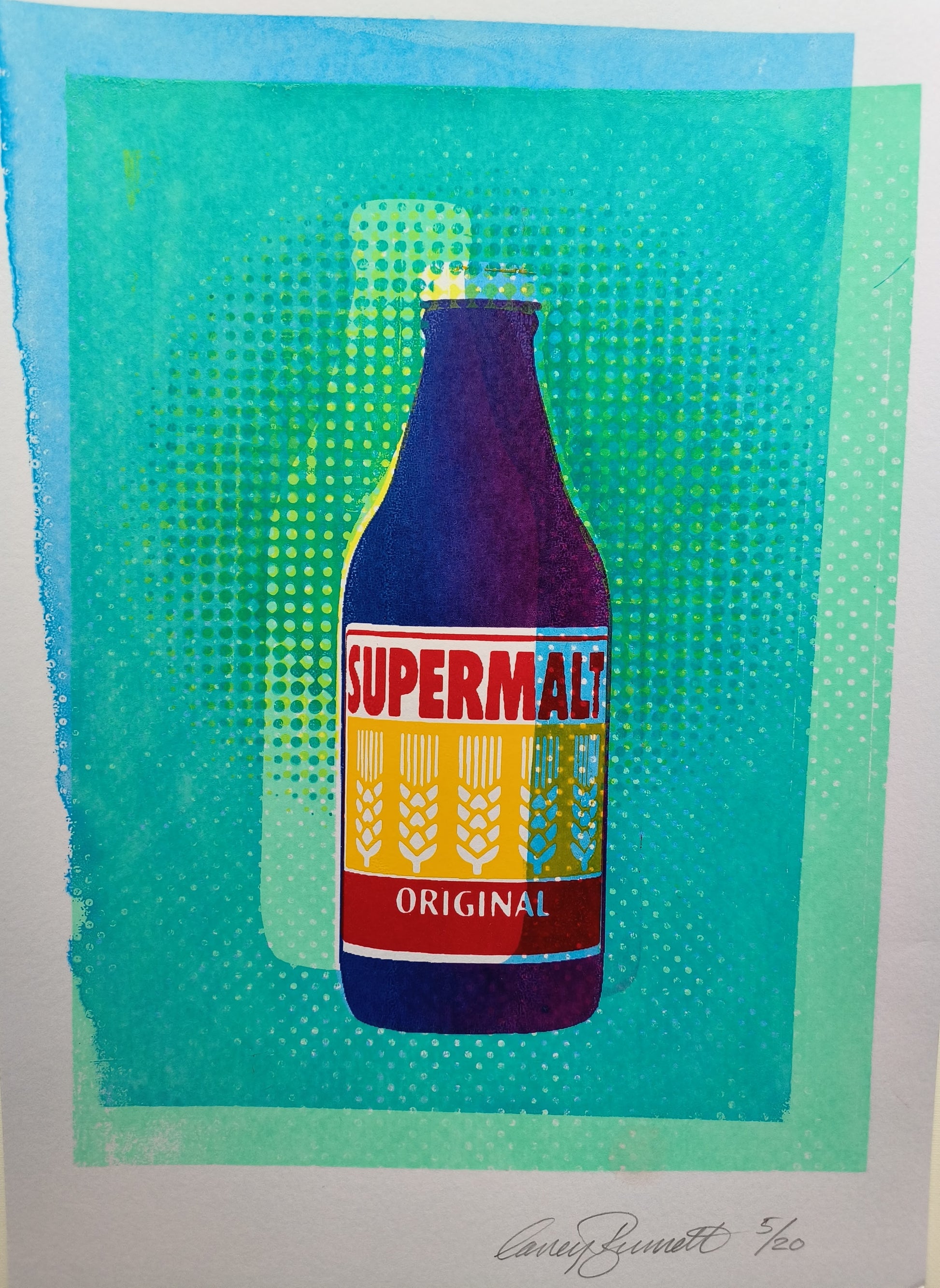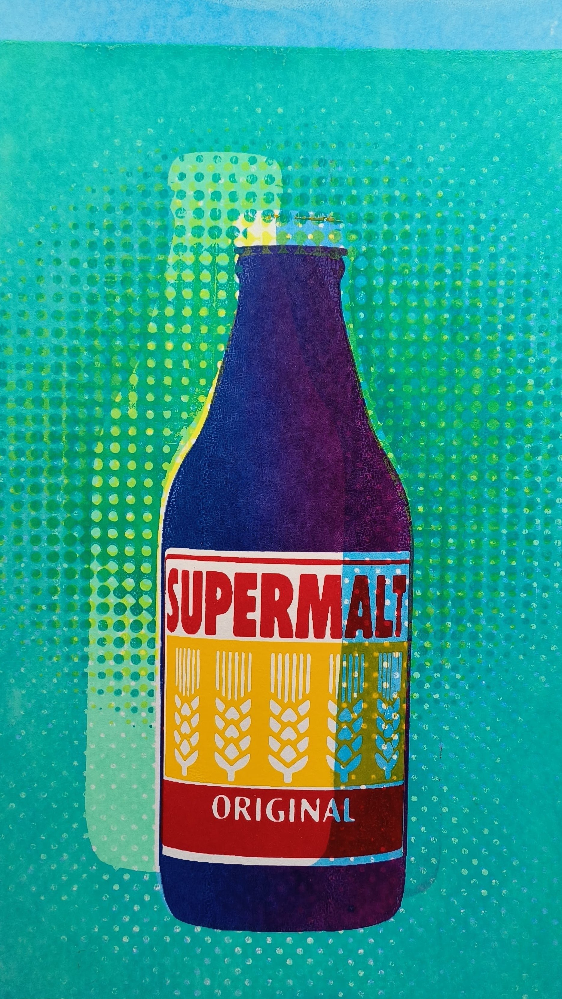 This A4 multi layered screenprint celebrates the iconic Supermalt bottle, a drink with a rich history dating back to its inception for the Nigerian army in 1972. The print seamlessly blends vibrant overlapping colors, conveying dynamism and strength, reminiscent of the drink's origins. Retro halftones pay homage to its vintage heritage, invoking a sense of nostalgia. The inclusion of quirky offset typography adds a playful touch, mirroring the drink's unique character. With its layered design, this print captures the essence of vigor and history, making it an ideal gift for the bodybuilder in your life, encapsulating their dedication and celebrating Supermalt's legacy.