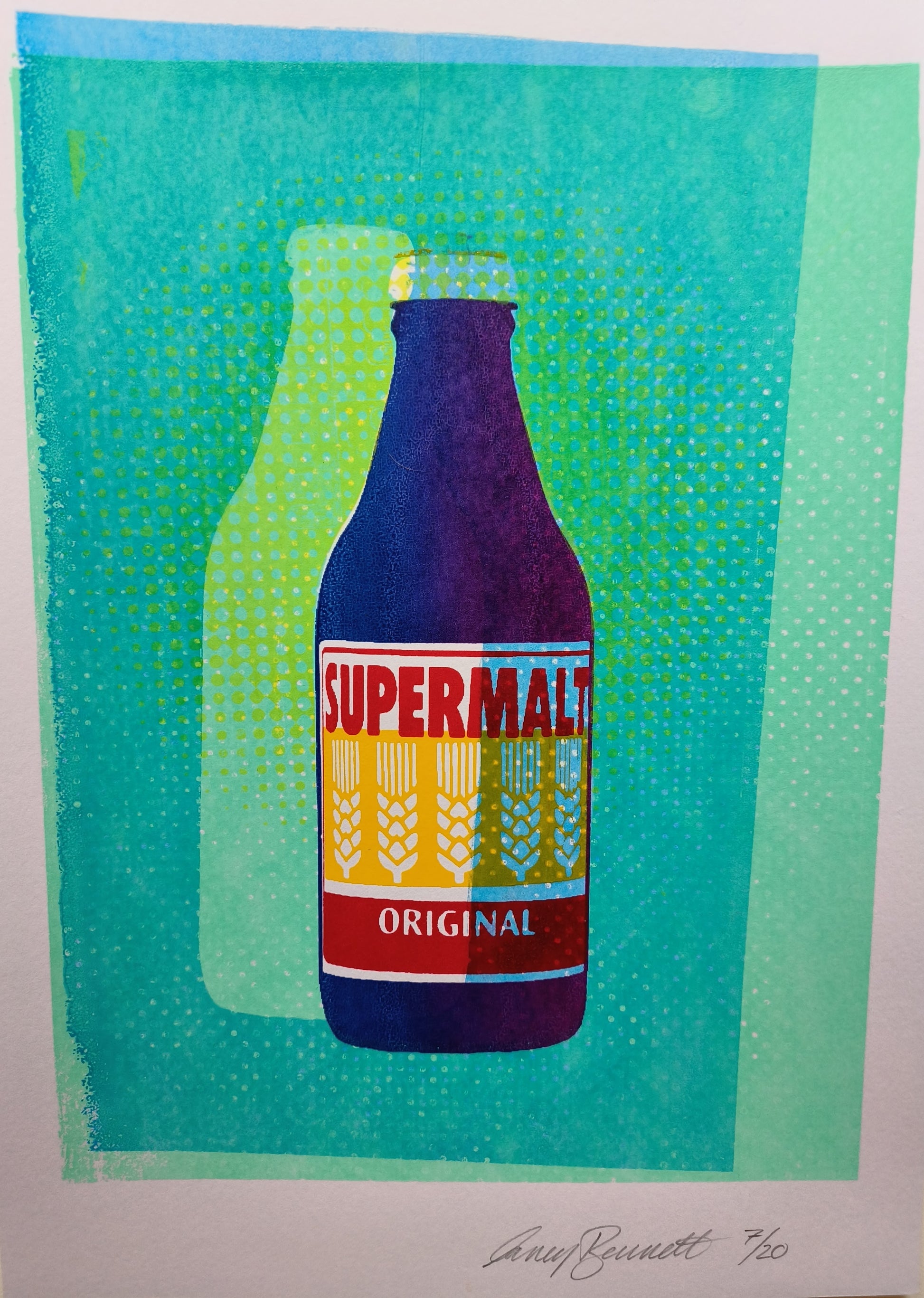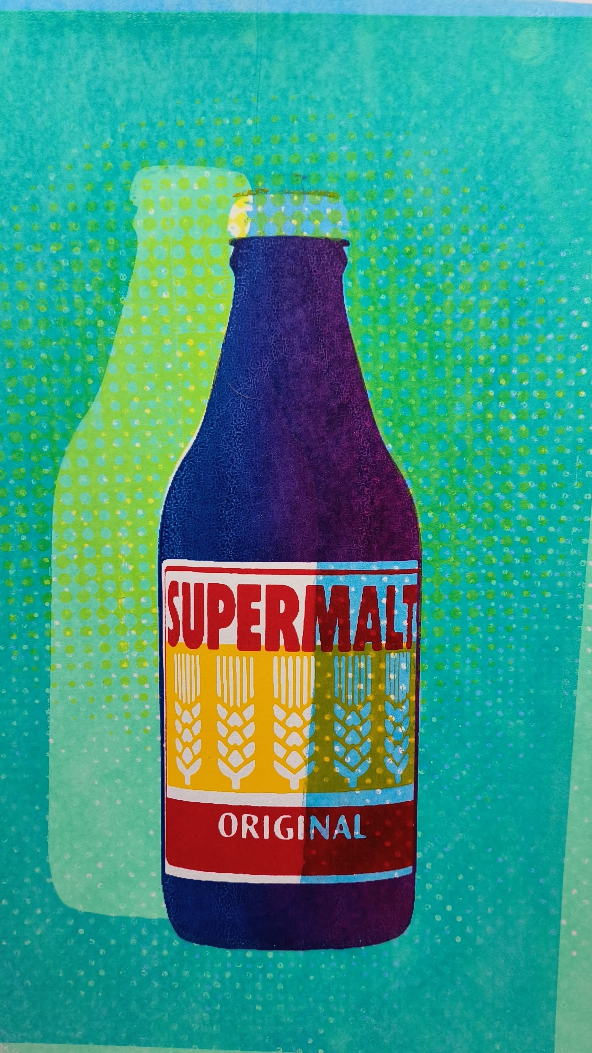 This A4 multi layered screenprint celebrates the iconic Supermalt bottle, a drink with a rich history dating back to its inception for the Nigerian army in 1972. The print seamlessly blends vibrant overlapping colors, conveying dynamism and strength, reminiscent of the drink's origins. Retro halftones pay homage to its vintage heritage, invoking a sense of nostalgia. The inclusion of quirky offset typography adds a playful touch, mirroring the drink's unique character. With its layered design, this print captures the essence of vigor and history, making it an ideal gift for the bodybuilder in your life, encapsulating their dedication and celebrating Supermalt's legacy.