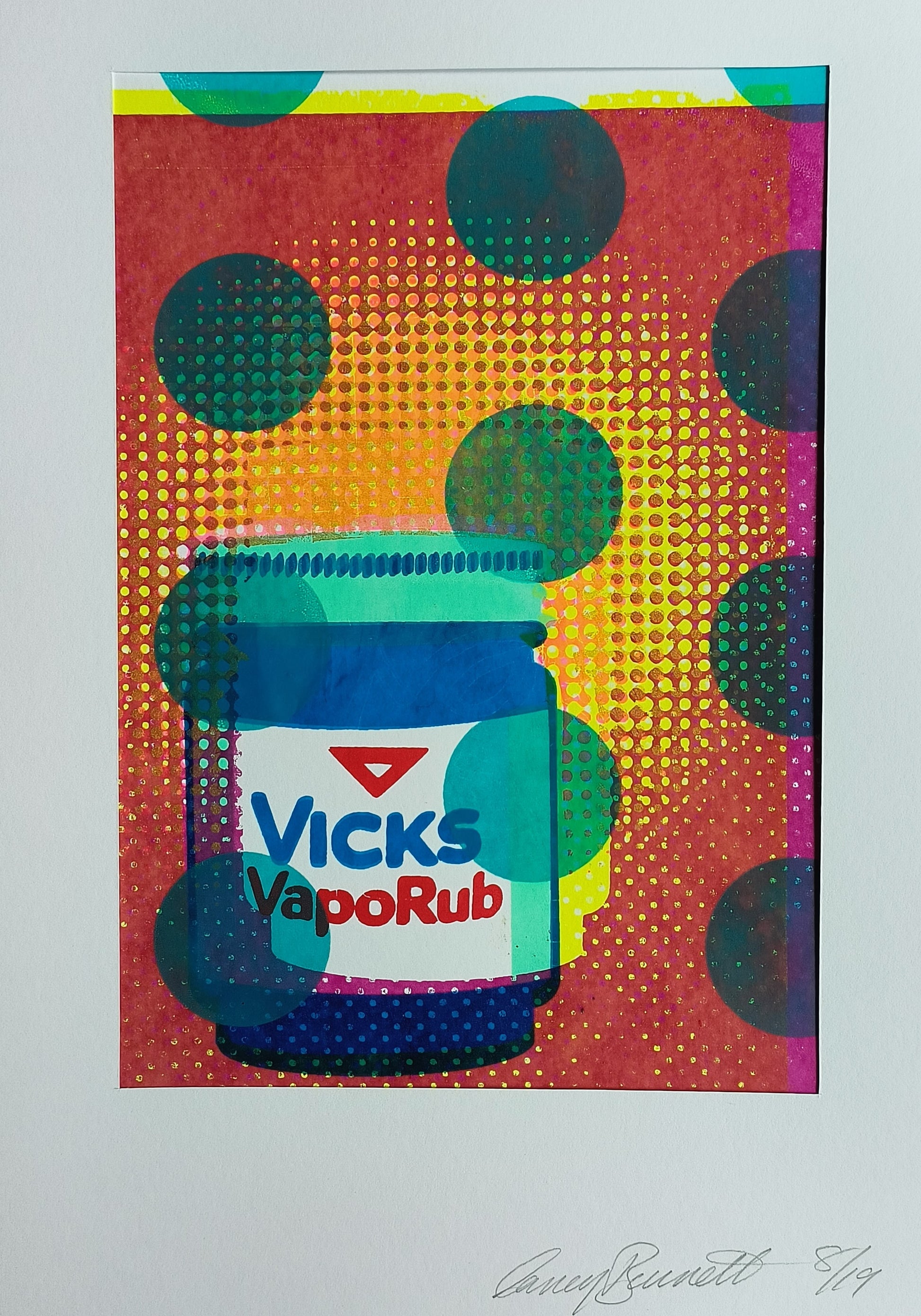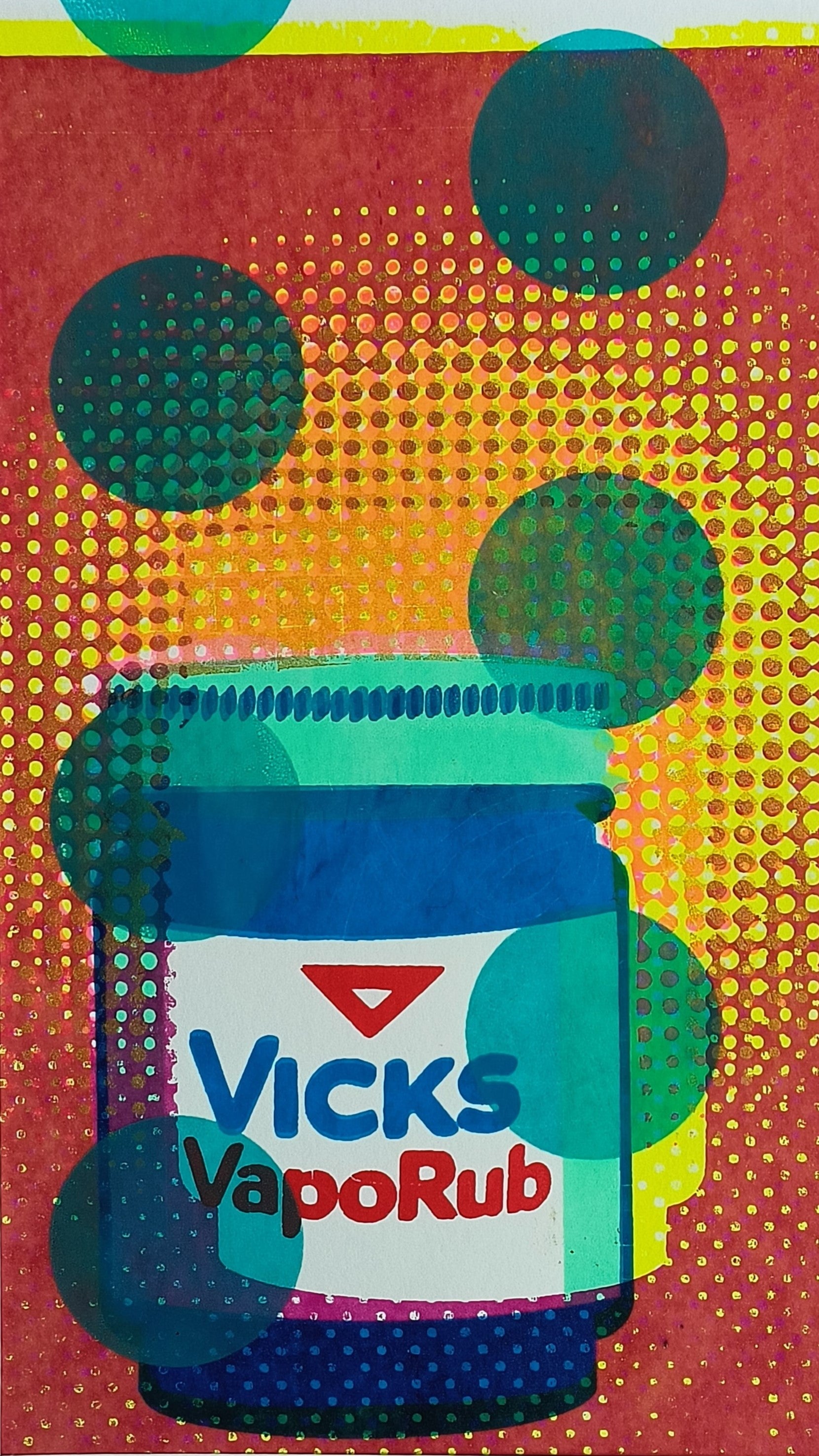 This striking A4 multi layered screen print reimagines a vintage Vicks jar, evoking a nostalgic feeling with contemporary flair. The bold fluorescent hues give off a lively intensity, offering a visual remedy, perfect for a get well soon gift. The retro halftones pays homage to retro aesthetics. The playful offset typography introduces a touch of whimsy, infusing the artwork with personality. A fusion of vibrant colors, nostalgic nods, and modern design, these unique prints work well individually or framed as a group.