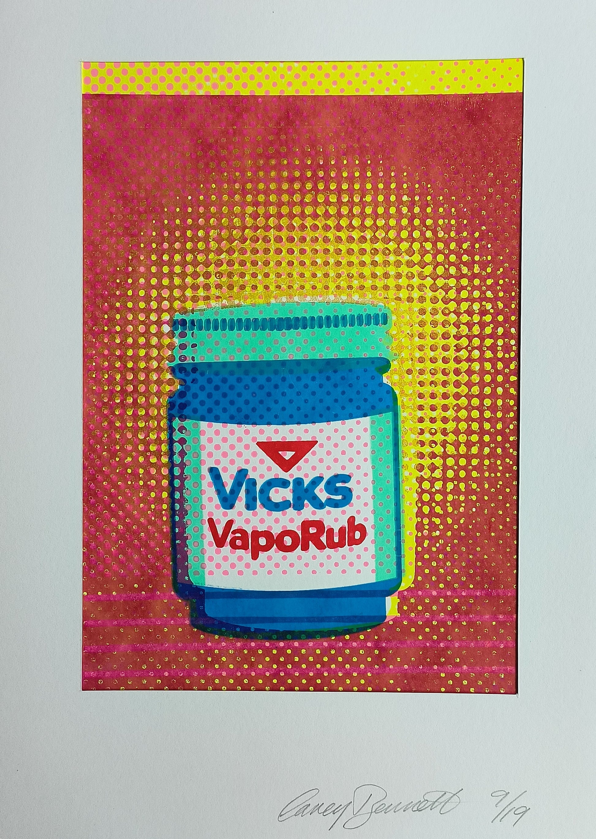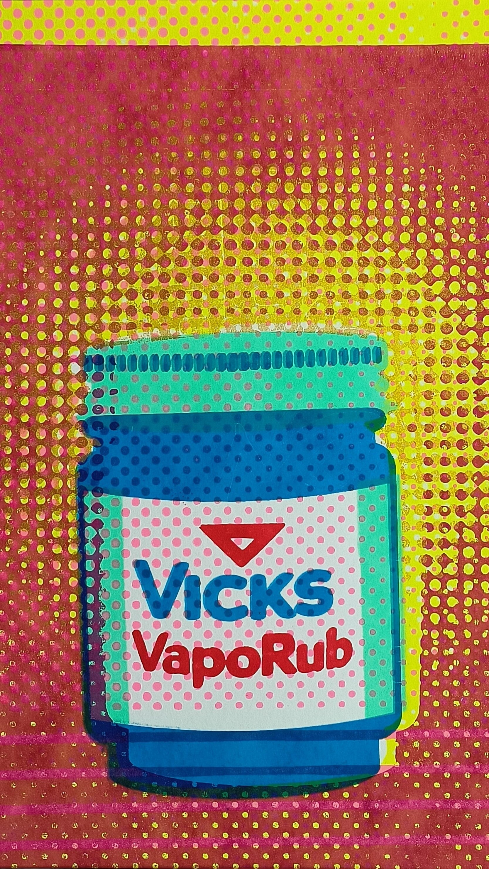 This striking A4 multi layered screen print reimagines a vintage Vicks jar, evoking a nostalgic feeling with contemporary flair. The bold fluorescent hues give off a lively intensity, offering a visual remedy, perfect for a get well soon gift. The retro halftones pays homage to retro aesthetics. The playful offset typography introduces a touch of whimsy, infusing the artwork with personality. A fusion of vibrant colors, nostalgic nods, and modern design, these unique prints work well individually or framed as a group.