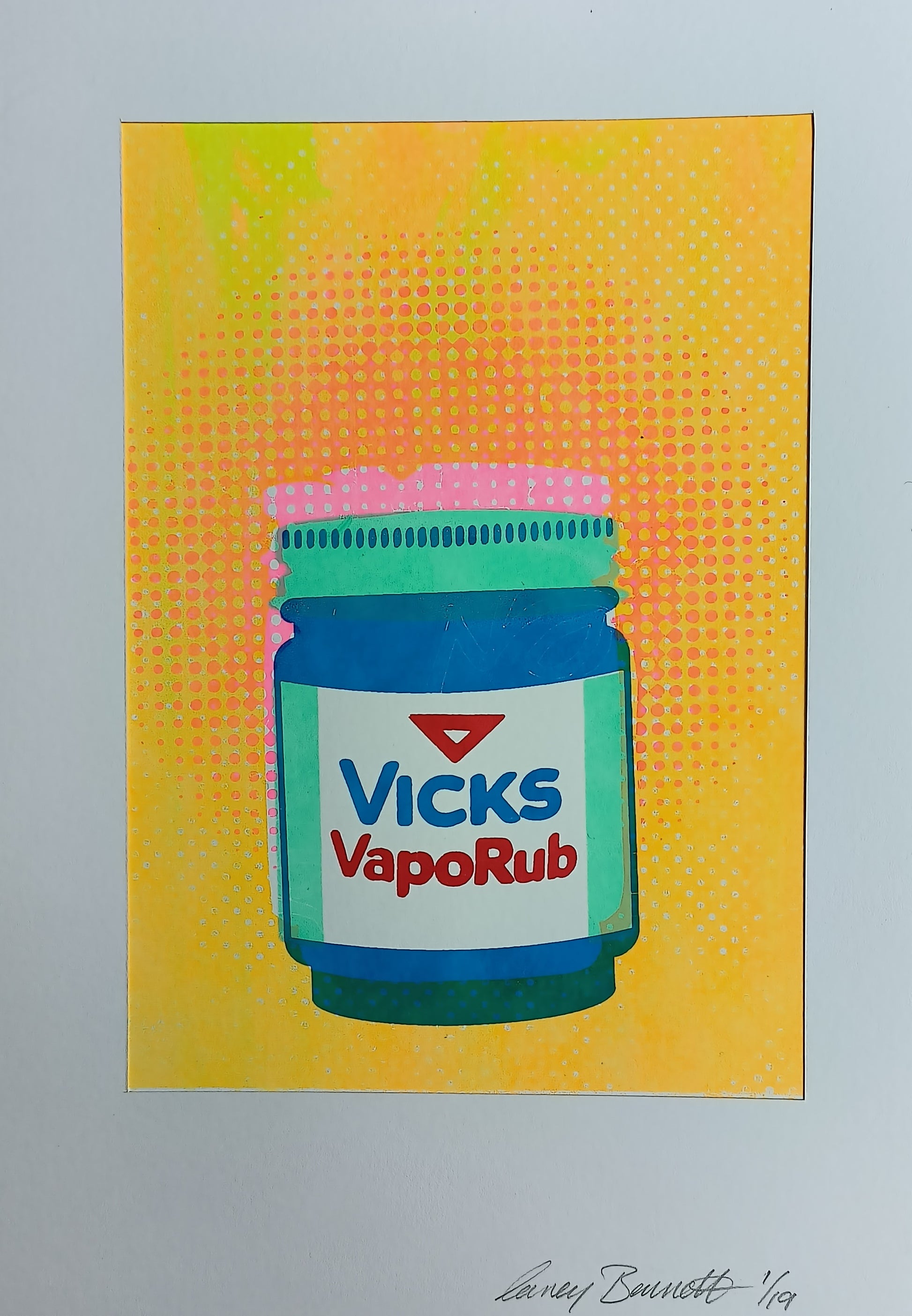 This striking A4 multi layered screen print reimagines a vintage Vicks jar, evoking a nostalgic feeling with contemporary flair. The bold fluorescent hues give off a lively intensity, offering a visual remedy, perfect for a get well soon gift. The retro halftones pays homage to retro aesthetics. The playful offset typography introduces a touch of whimsy, infusing the artwork with personality. A fusion of vibrant colors, nostalgic nods, and modern design, these unique prints work well individually or framed as a group.