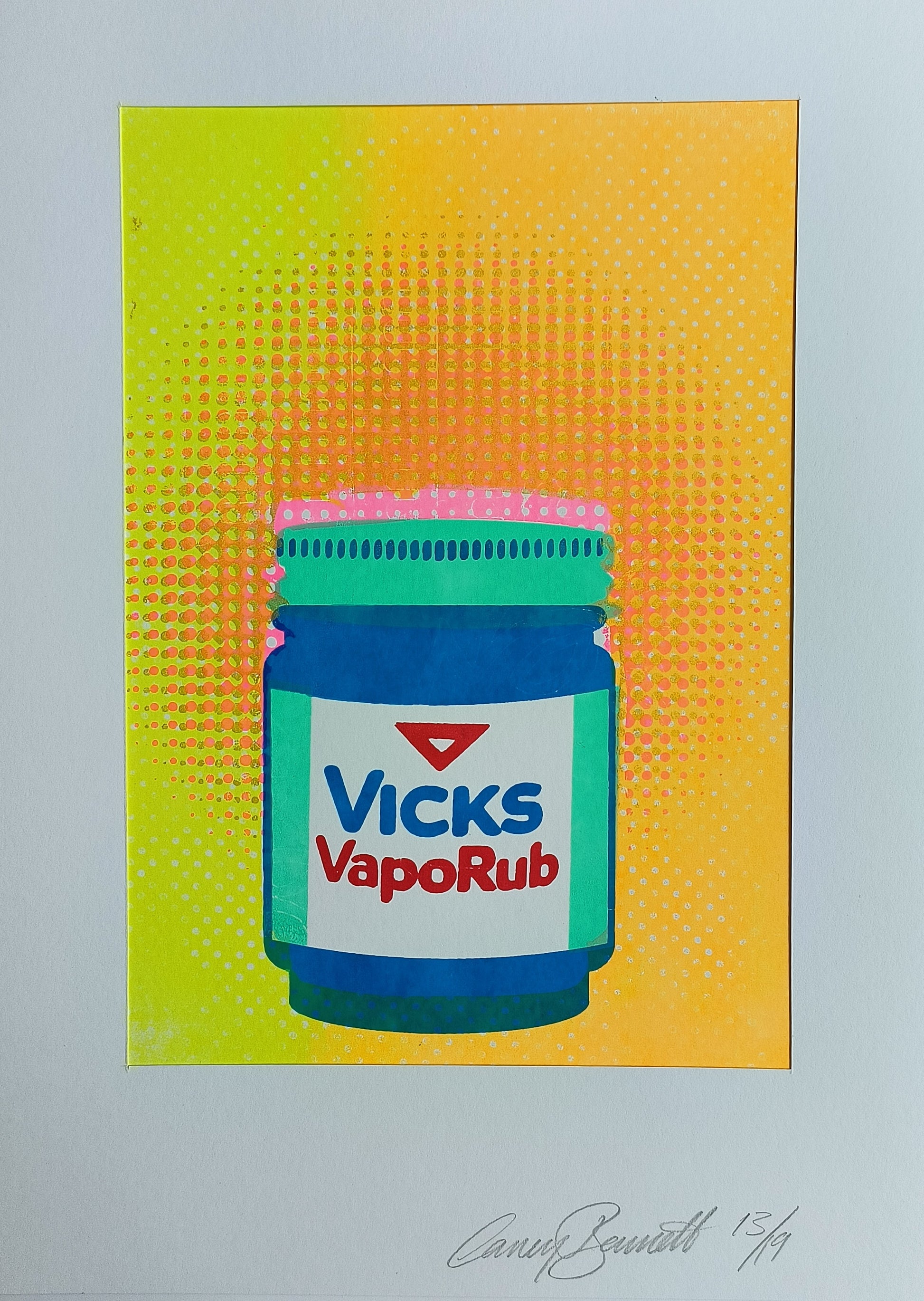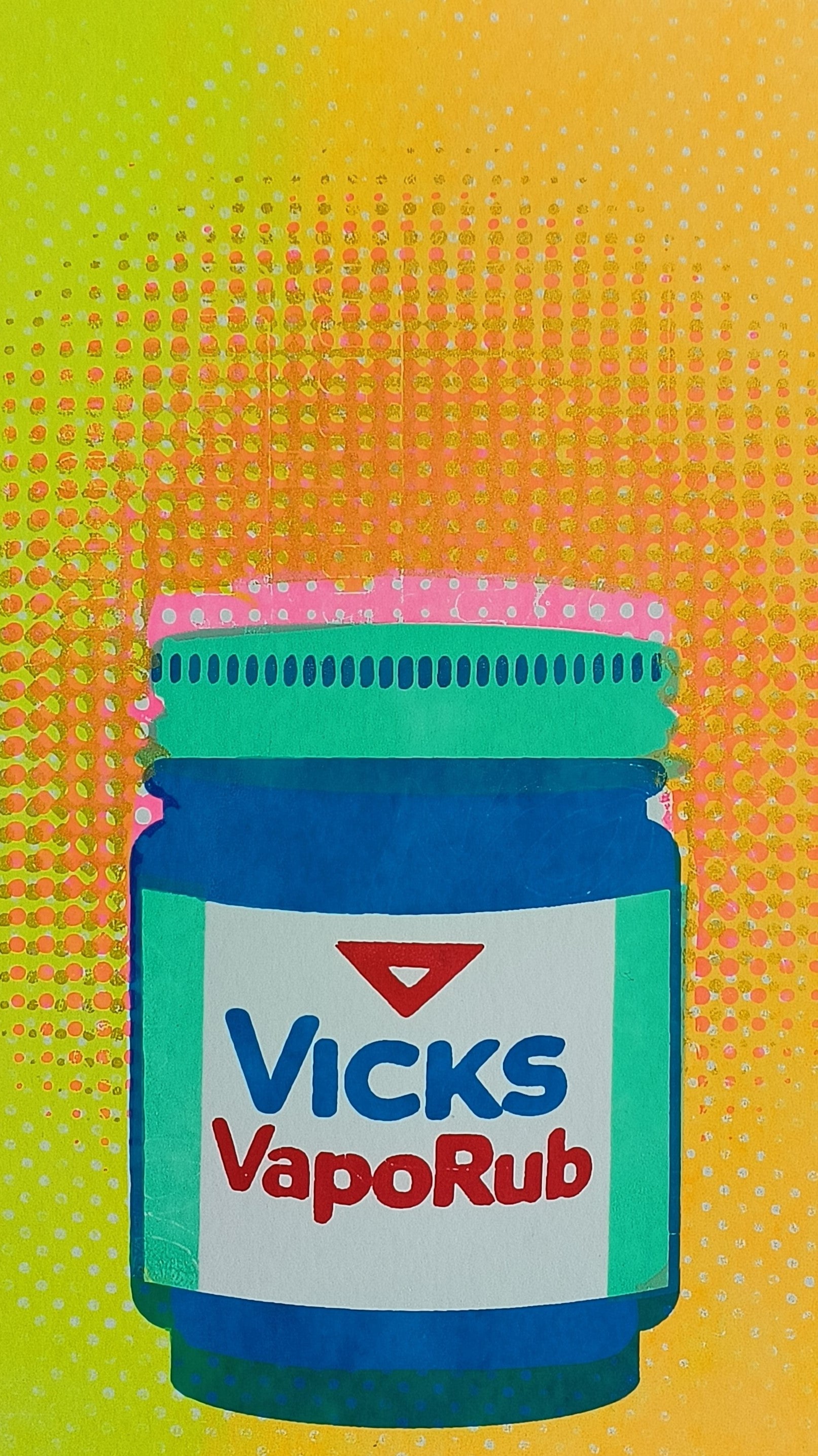 This striking A4 multi layered screen print reimagines a vintage Vicks jar, evoking a nostalgic feeling with contemporary flair. The bold fluorescent hues give off a lively intensity, offering a visual remedy, perfect for a get well soon gift. The retro halftones pays homage to retro aesthetics. The playful offset typography introduces a touch of whimsy, infusing the artwork with personality. A fusion of vibrant colors, nostalgic nods, and modern design, these unique prints work well individually or framed as a group.