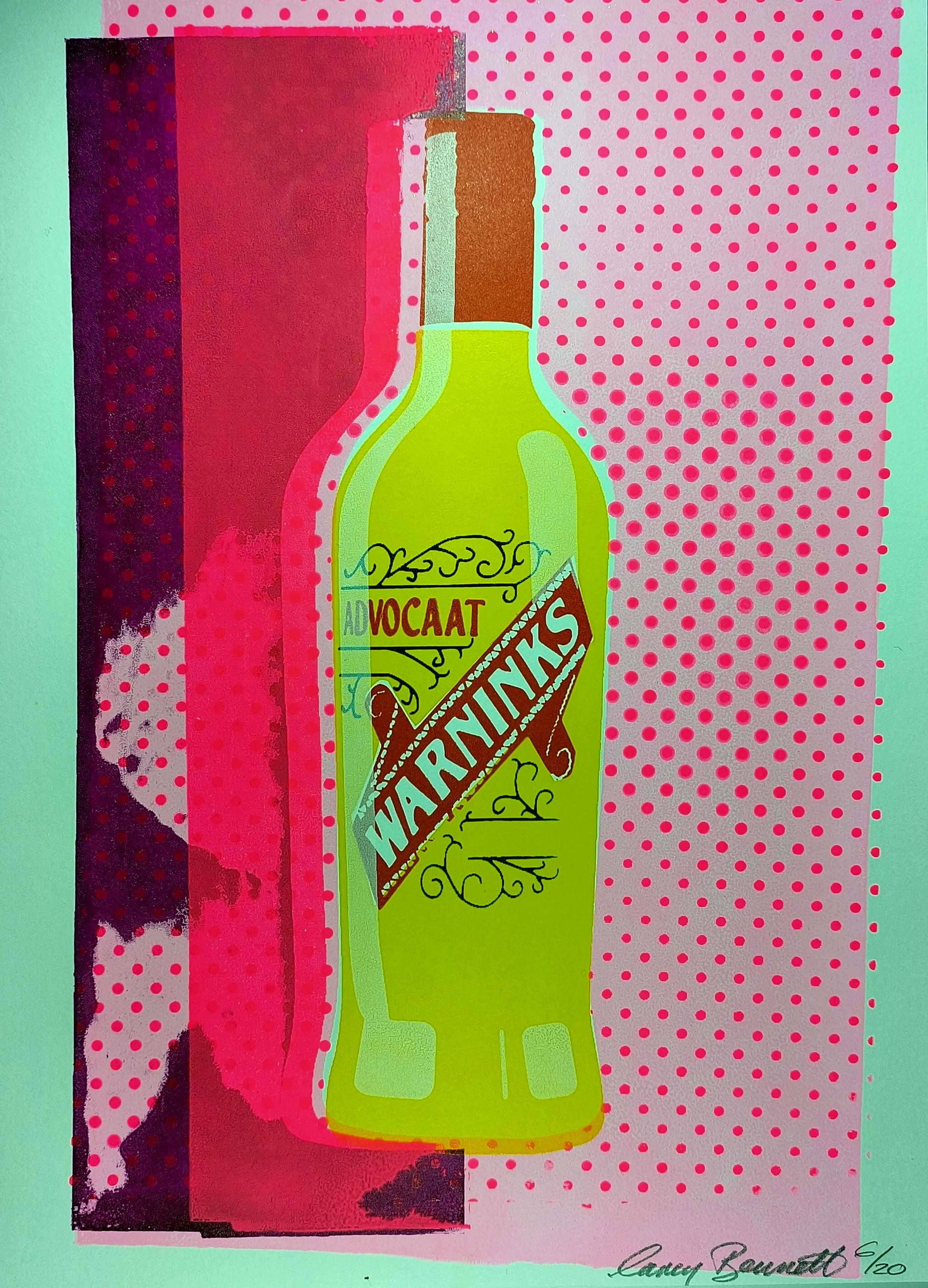 This A4 multi layered screen print evokes hazy, happy memories of my Grandad slipping me a secret (very small) 'snowball'. The prints intentionally alter to reflect the way that our memories of events change with time. Vibrant colours and distortion echo happy tinsel filled childhood Christmases. Each print is deliberately unique.
