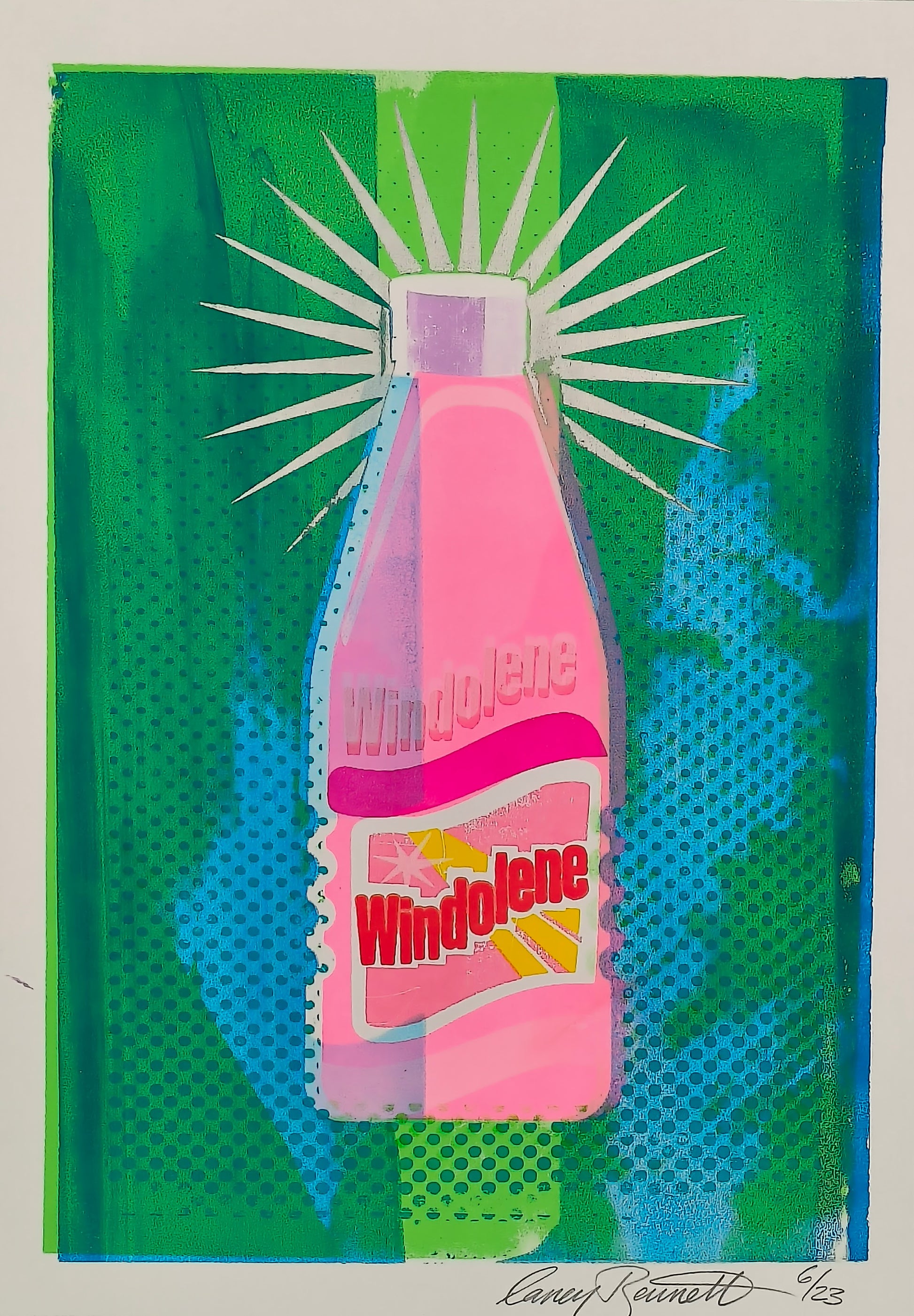 This series of A4 multi layered screens print evokes memories of childhood cleaning duties. Easter break = Spring cleaning, which meant getting the Windolene out. It seemed to take days to complete window cleaning ( I didn't live in a mansion!) It was almost impossible to rub off the chalky pink liquid. I am extremely pleased that todays formula seems a lot more 'user' friendly . The prints intentionally alter to reflect the way that our memories of events change, disintegrate and intensify with time. Each print is deliberately unique.