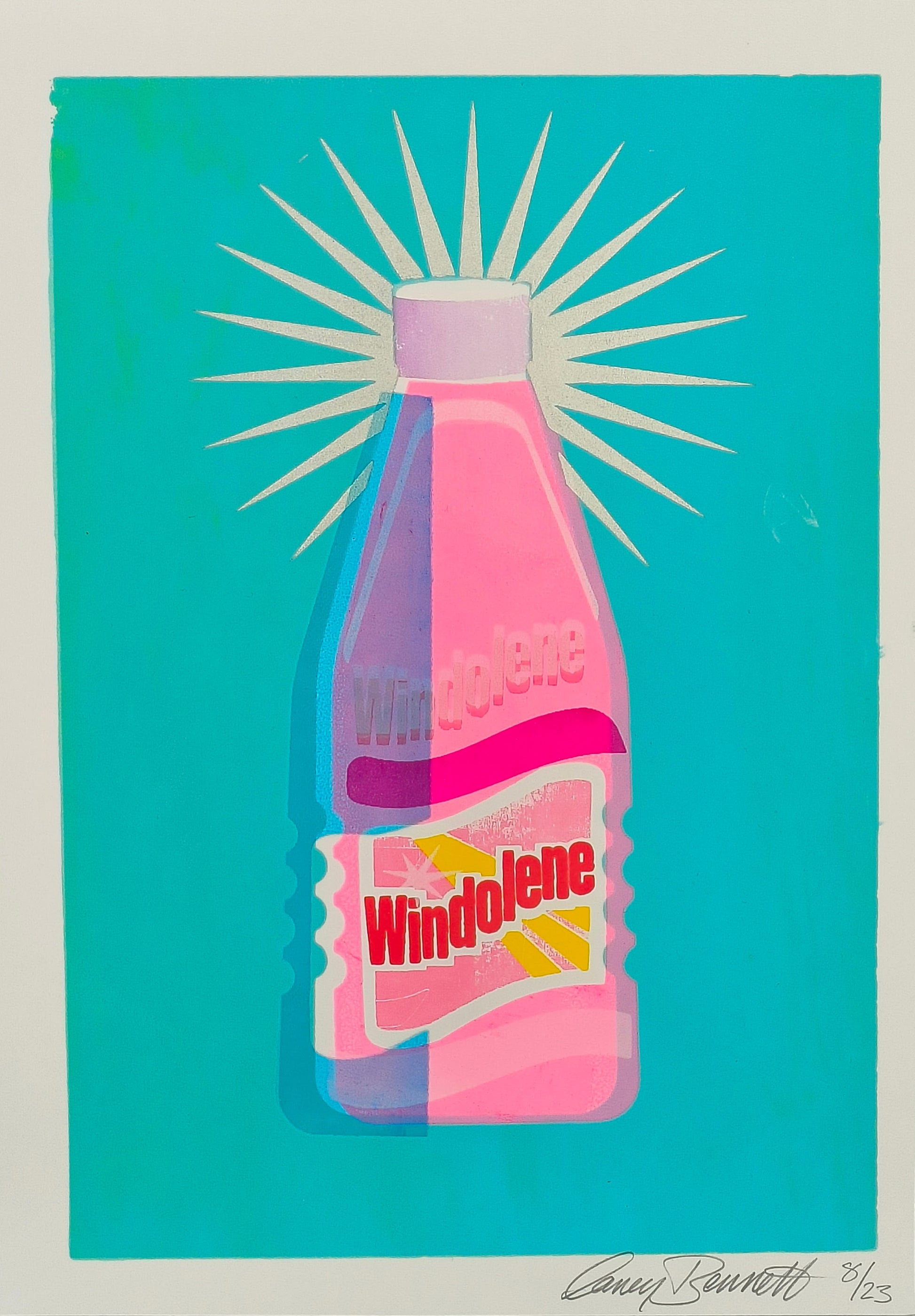 This series of A4 multi layered screens print evokes memories of childhood cleaning duties. Easter break = Spring cleaning, which meant getting the Windolene out. It seemed to take days to complete window cleaning ( I didn't live in a mansion!) It was almost impossible to rub off the chalky pink liquid. I am extremely pleased that todays formula seems a lot more 'user' friendly . The prints intentionally alter to reflect the way that our memories of events change, disintegrate and intensify with time. Each print is deliberately unique.